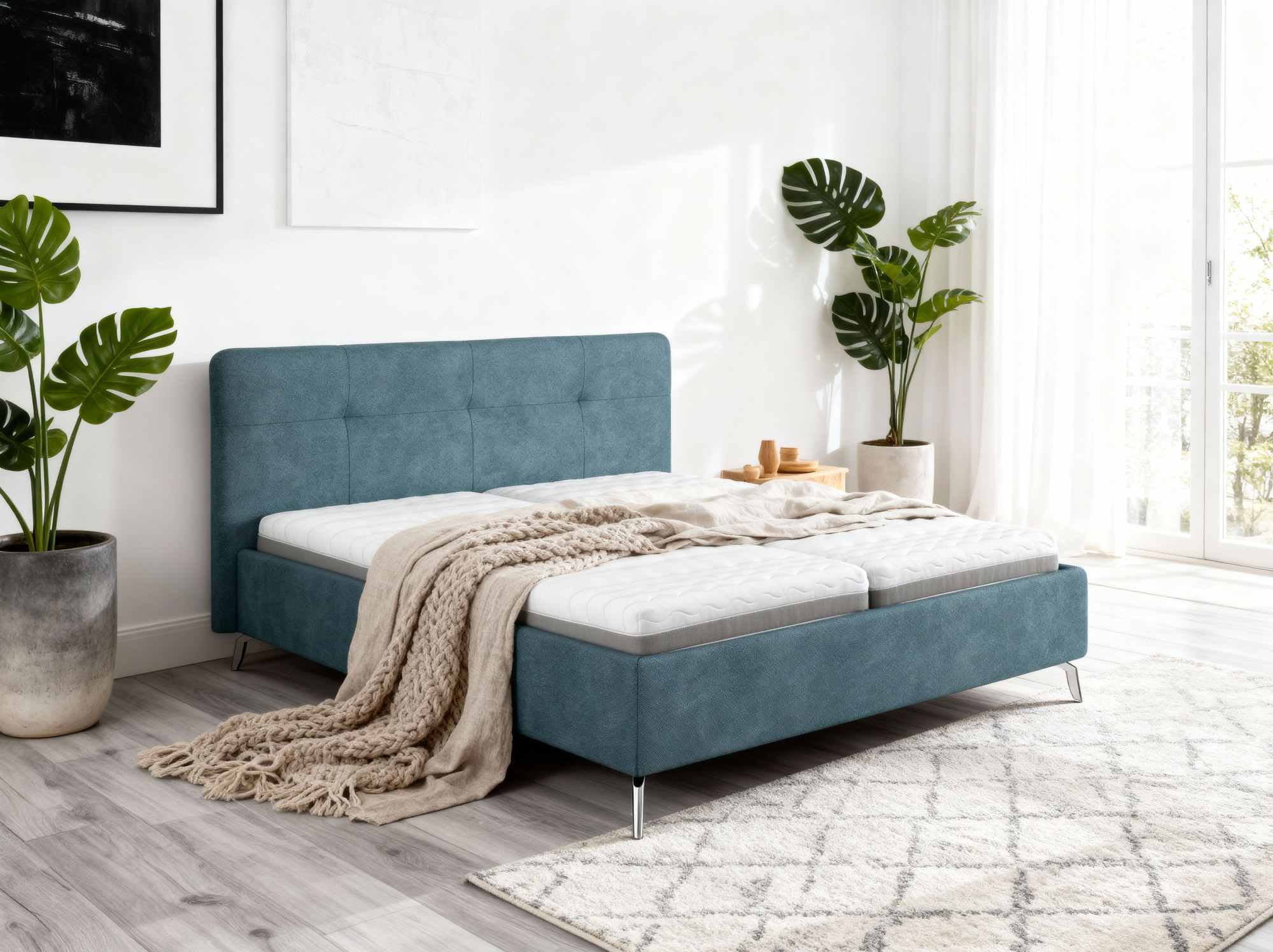 Az ágyat luxus kék Miracle bársony anyaggal vonták be, amely az enteriőrnek azonnali otthonosság és prémium kényelem érzetét adja. A Miracle anyag egy innovatív textília, amelynek jellegzetes buklé (bouclé) struktúrája és hihetetlenül puha tapintása van. Nem csupán esztétikus – ez az anyag átlagon felül ellenálló a kopással szemben, amit a Martindale teszt akár 100 000 ciklus eredményével is bizonyít. A kiváló szöszölődés elleni ellenállás (4–5) és a rendkívül könnyű tisztíthatóság révén az ágy ideális választás gyermekes és állattartó háztartásokba. Az anyag hosszú távon megőrzi színtartósságát, szigorú cigarettatesztnek felel meg, és arra tervezték, hogy kompromisszumok nélküli mindennapi használatot biztosítson. A tisztításhoz elegendő egy enyhén nedves törlőkendő és gyerek szappan.