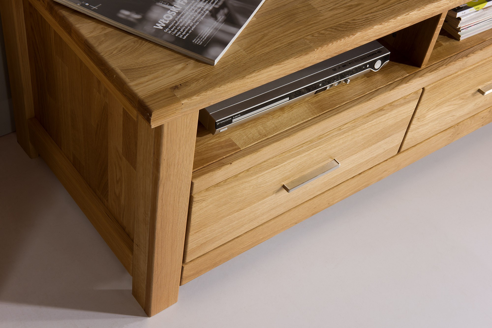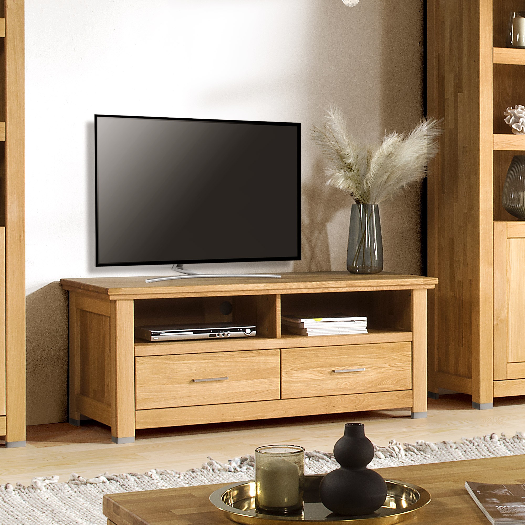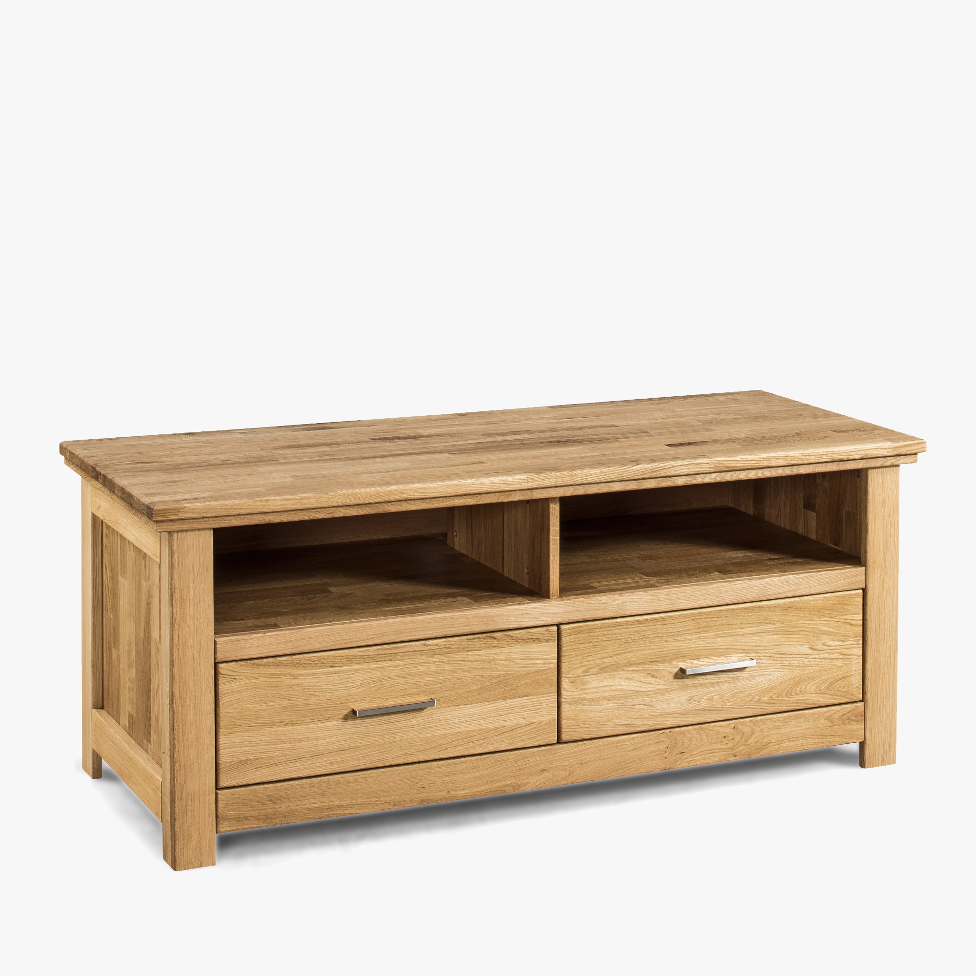 Masszív tömör tölgyfa TV-szekrény 2 fiókkal, nyitott polccal, barna