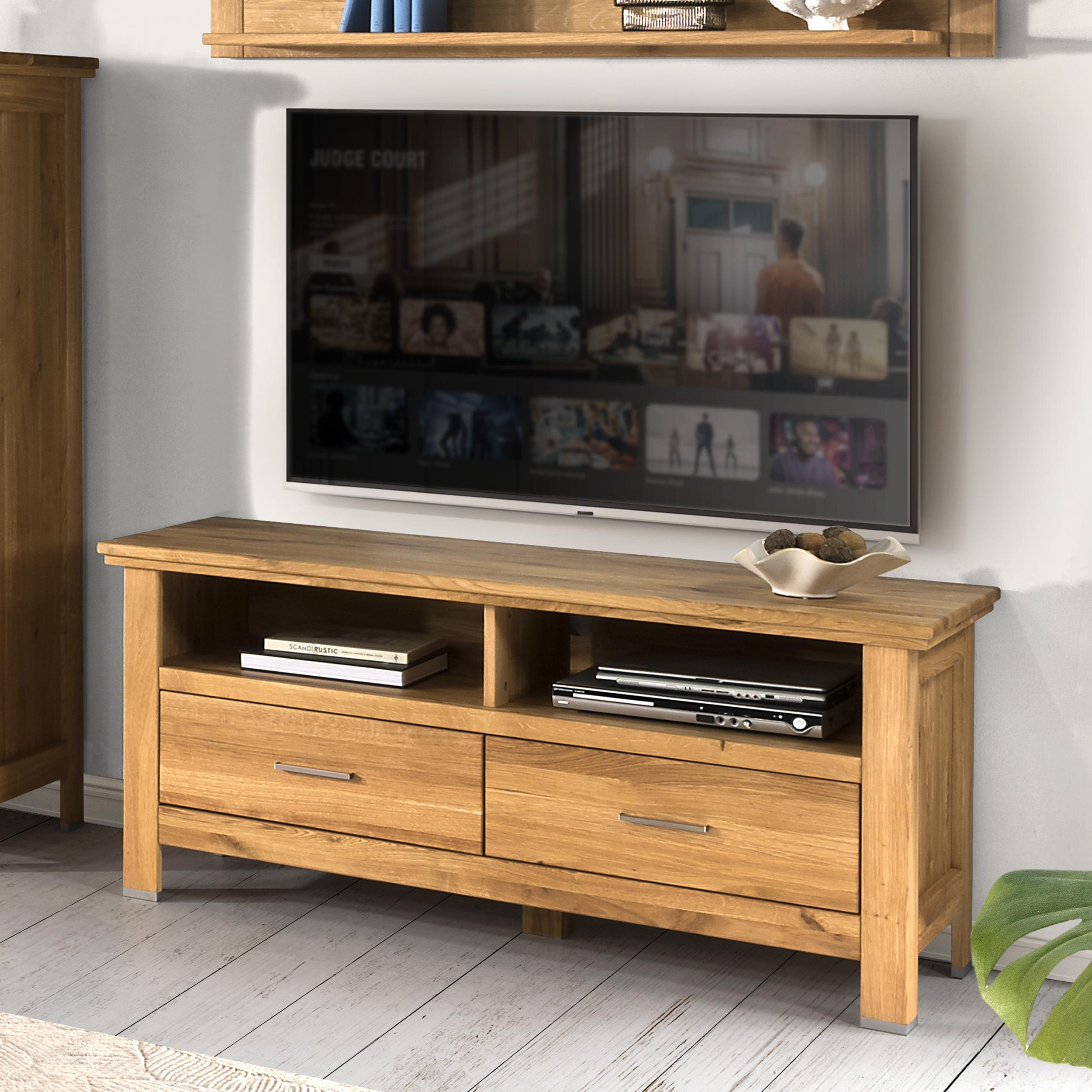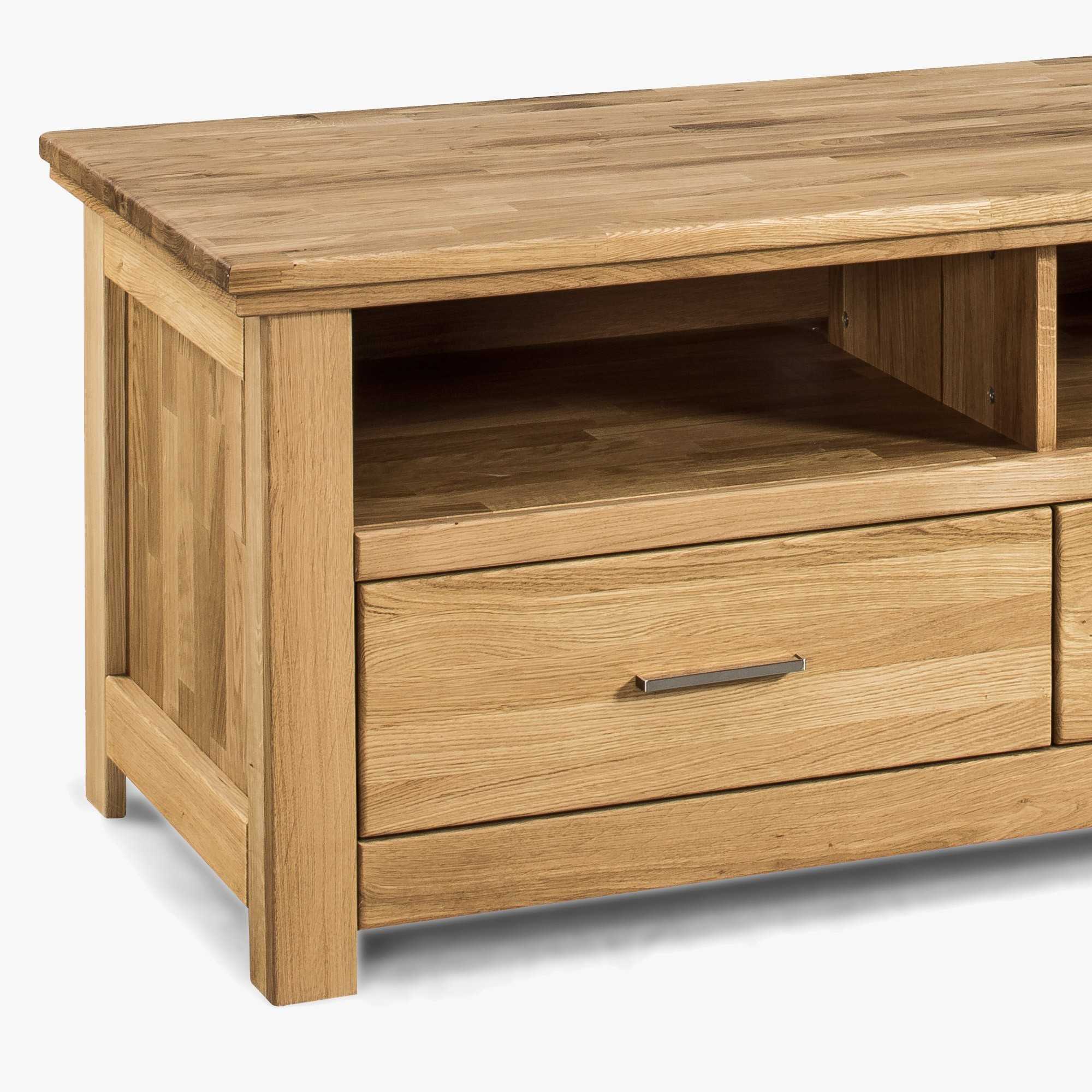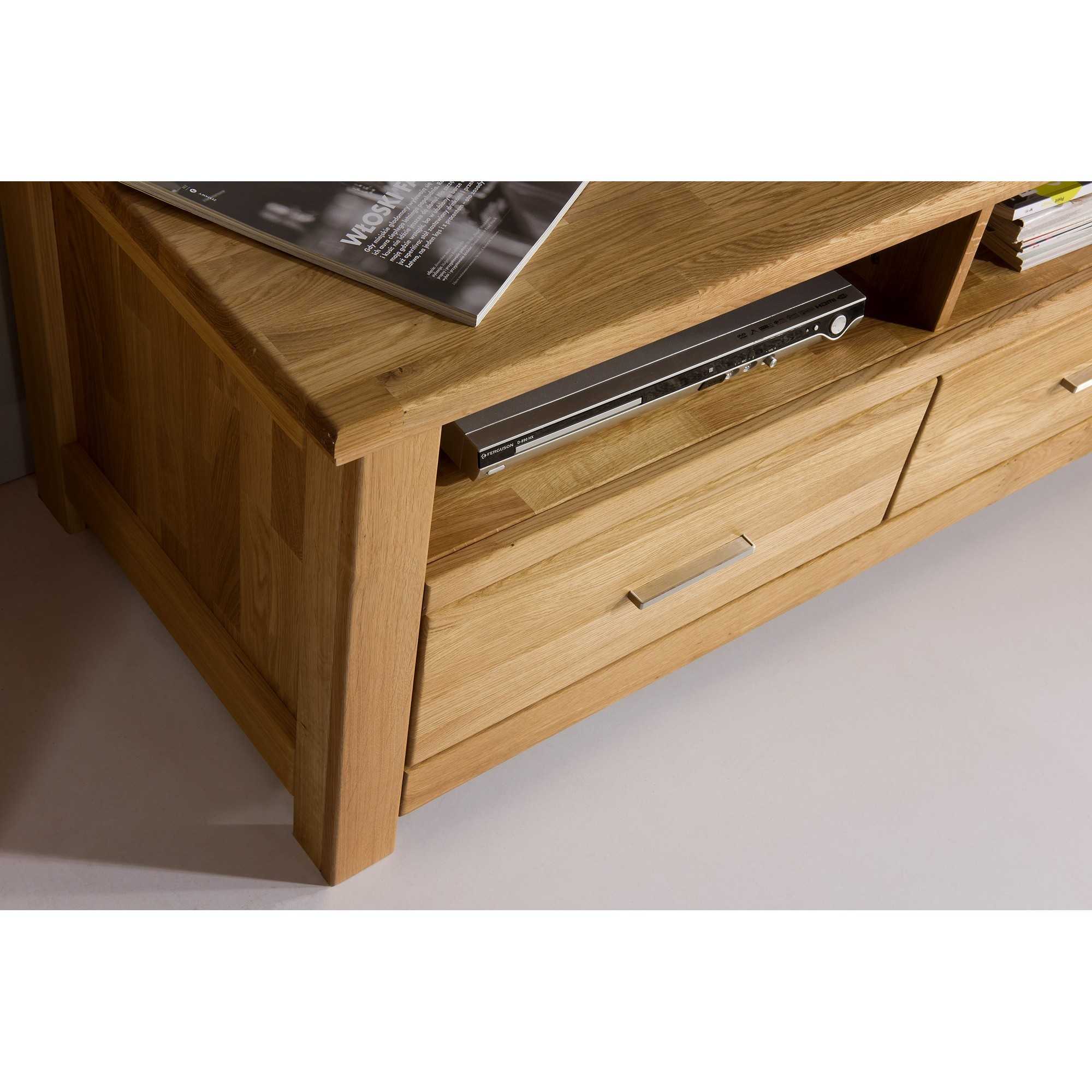 Masszív tömör tölgyfa TV-szekrény 2 fiókkal, nyitott polccal, barna
