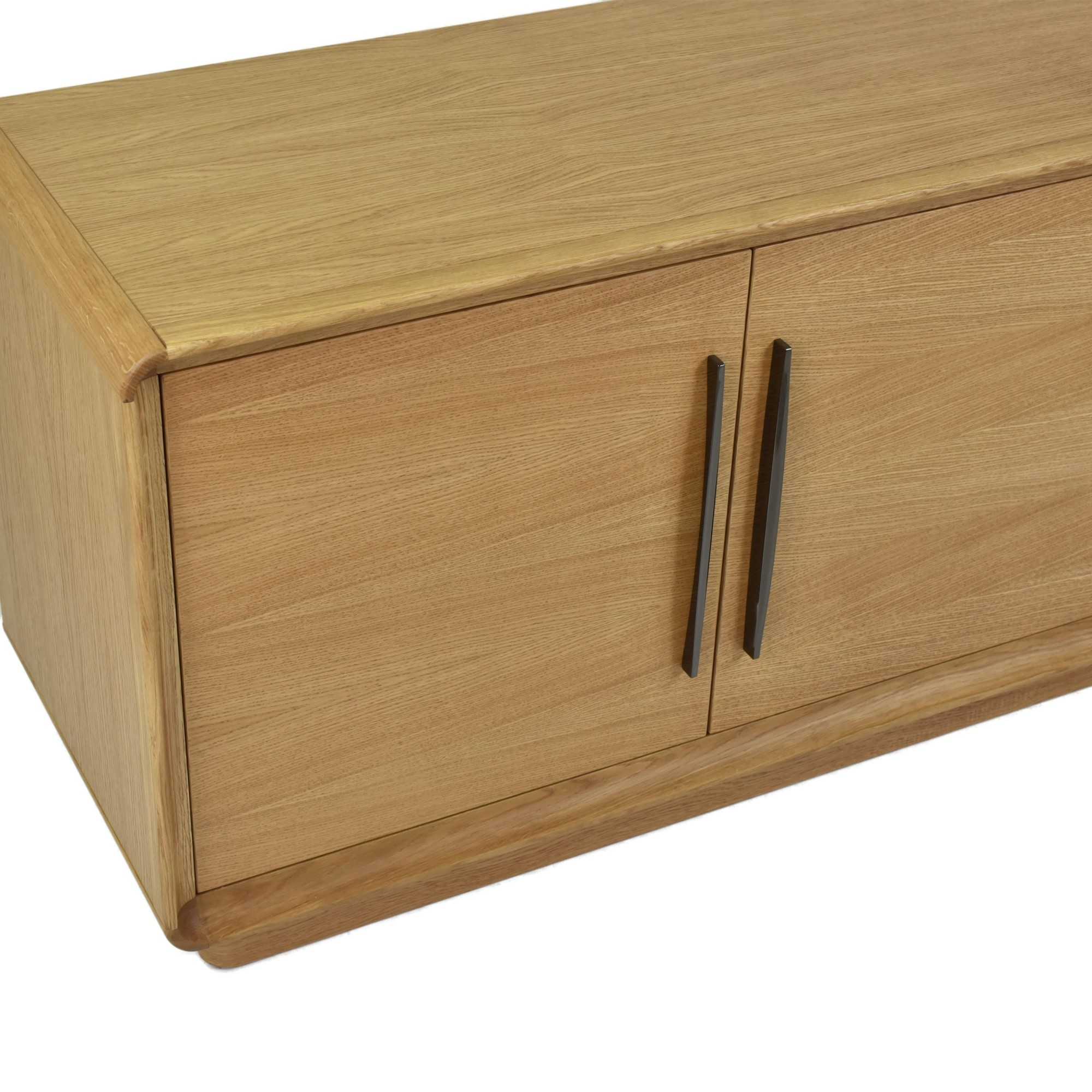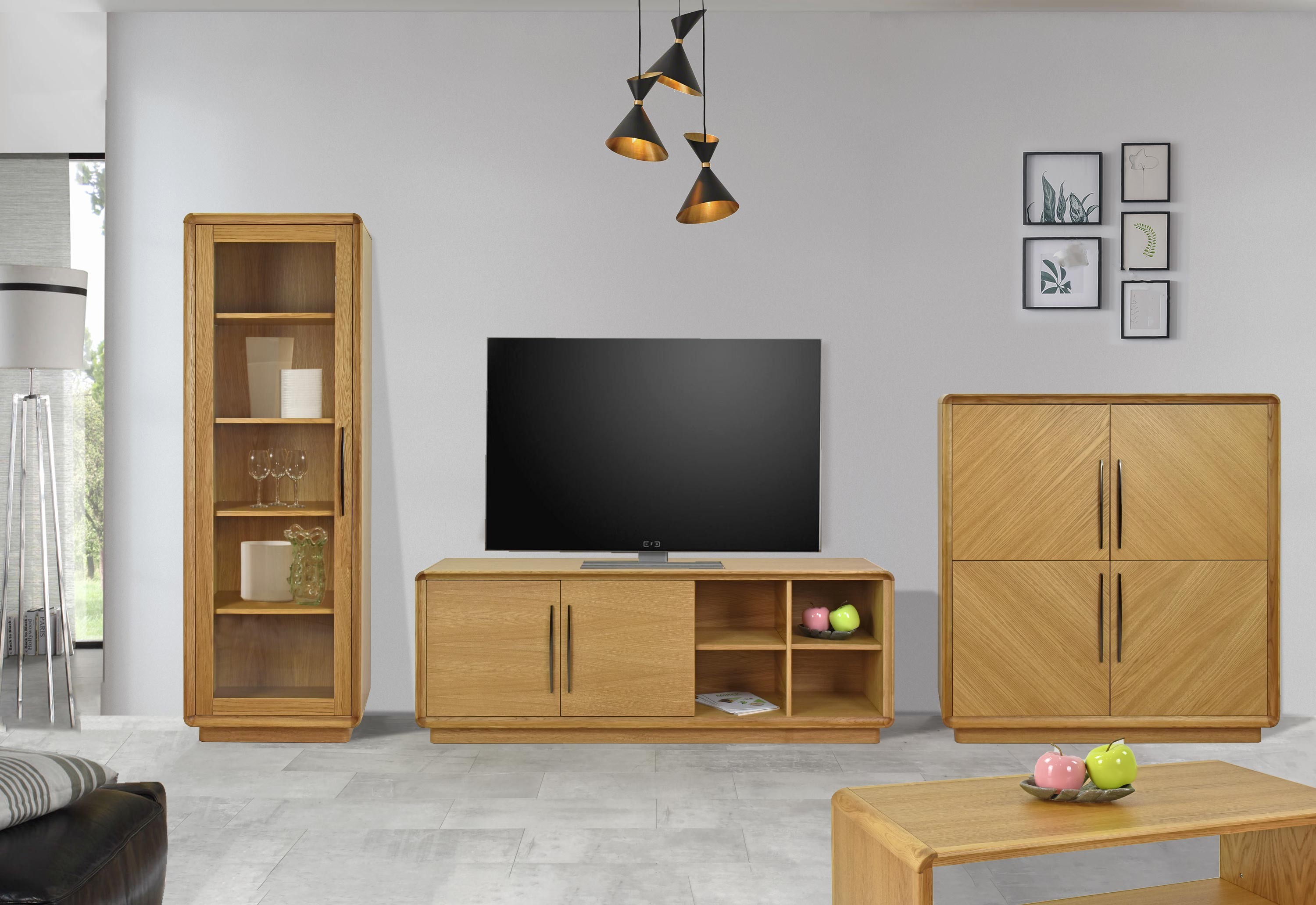 Retro TV-komód tölgy - egyedi és luxus bútordarab, amely otthonát barátságos és stílusos hellyé varázsolja. Ez a komód részletekre tervezett kialakítással készült, hogy ne csak esztétikai, hanem gyakorlati igényeit is kielégítse. A Retro TV-komód tölgyet a múlt klasszikus formái és vonalai ihlették. Az ívelt sarkok és a belső lekerekítés egyedülálló karaktert kölcsönöznek ennek a bútornak. A természetes tölgyanyag és a tölgy furnér garantálják, hogy valóban minőségi és exkluzív termékről van szó.
