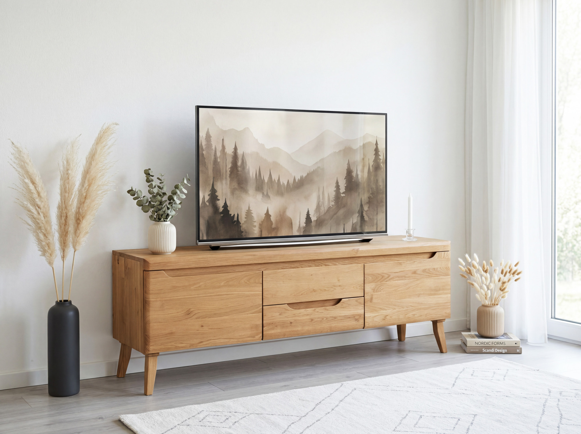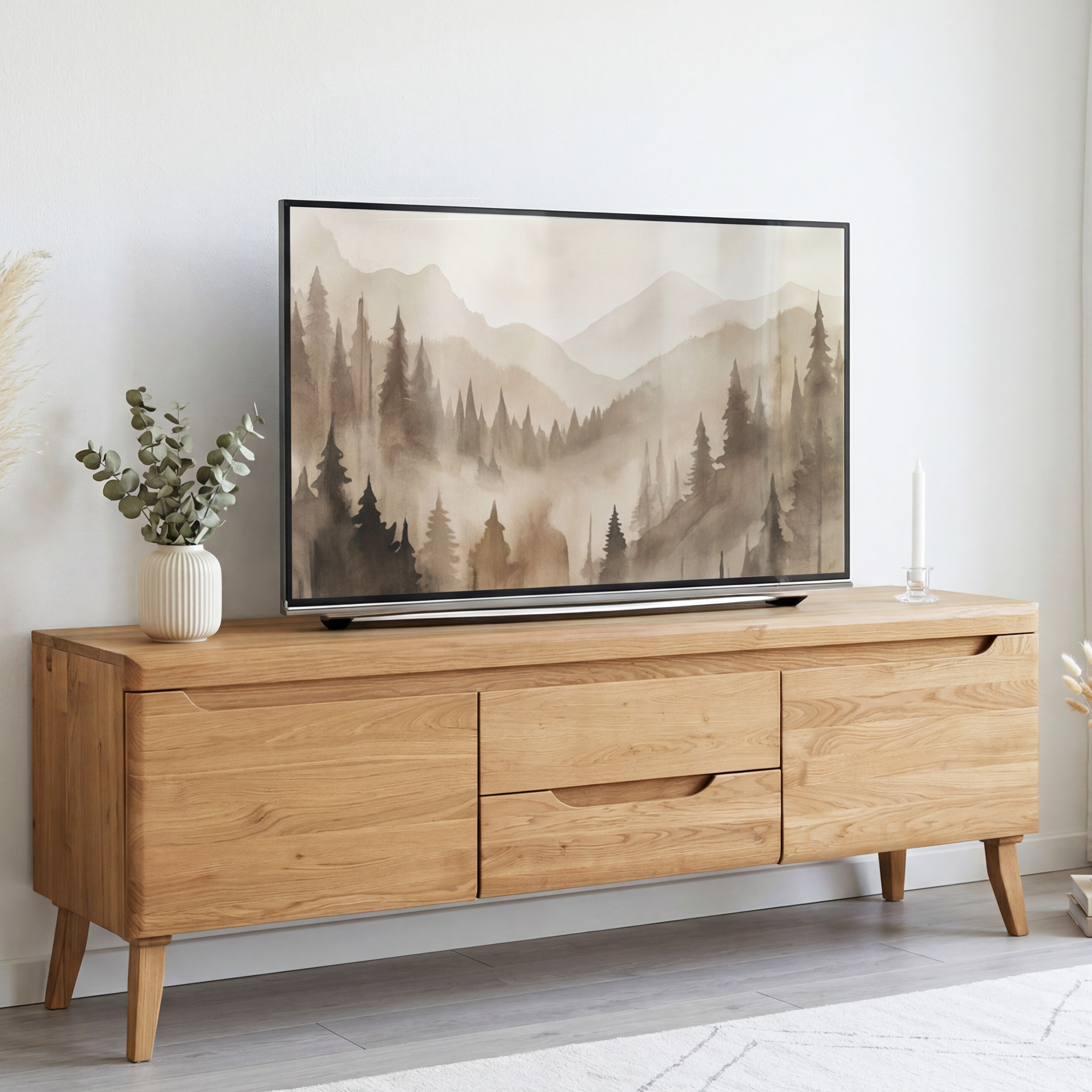 Tömör tölgy TV-szekrény natúr, skandináv dizájn, 160x58 cm