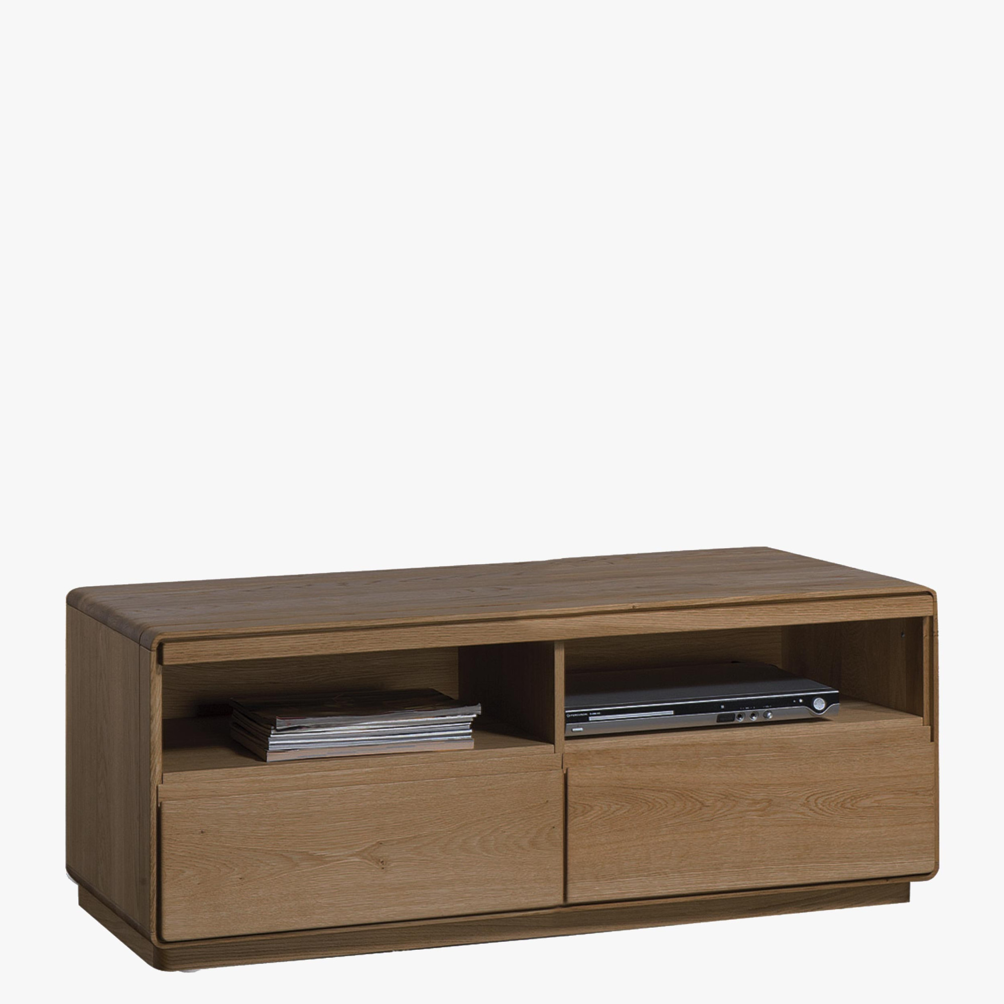 A TV komód felső lapja elegendő helyet biztosít kisebb és nagyobb tévék elhelyezésére. Emellett rendelkezésére áll 2 fiók és 2 nyitott polc. A fiókokat soft-stop halk záródási rendszerrel látták el, amely hosszú éveken át garancia a problémamentes működésre. A két nyitott polcba kiegészítő elektronikai eszközök, például set-top box vagy DVD-lejátszó helyezhető. Természetesen megtalálhatók a kábelkihúzó nyílások az nyitott szekciók hátfalán.