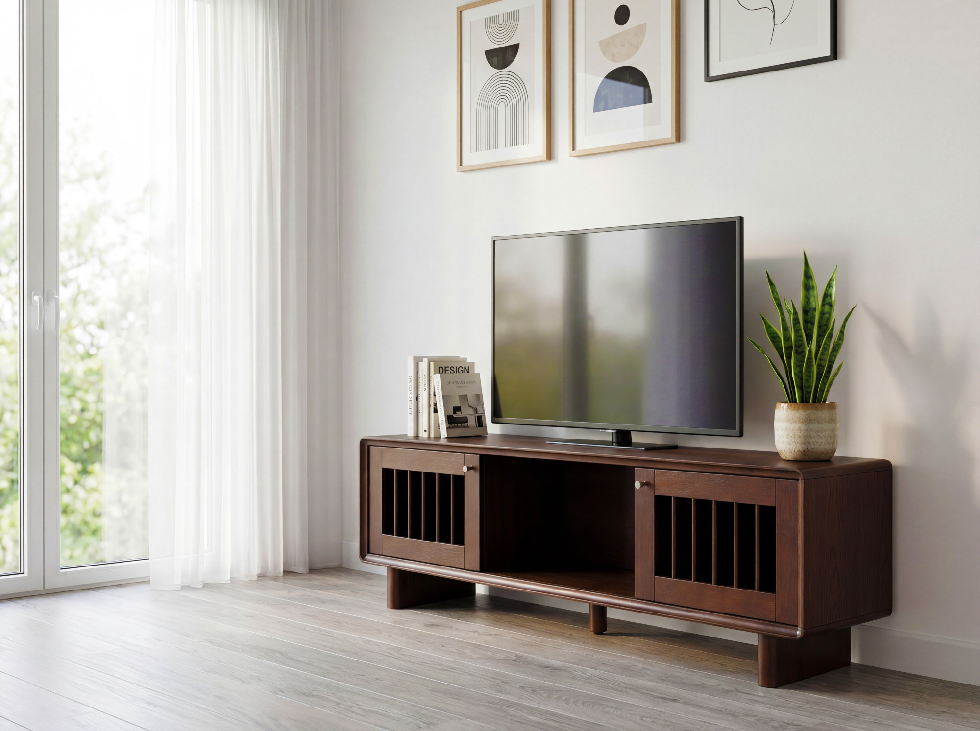 A TV-állvány elegáns masszív fa lábakon áll, melyek stabilitást és légies megjelenést kölcsönöznek a bútornak. A tolóajtók lamellás betéttel soft-close rendszerrel vannak felszerelve a csendes és sima záródás érdekében. A modern kivitelű fém fogantyúk hangsúlyozzák a bútordarab exkluzív megjelenését. A lekerekített élek modern karaktert adnak az állványnak, és egyben növelik az otthon biztonságát. A felület matt lakkozással kezelt, amely hatékonyan védi a fát és szépen kiemeli természetes szerkezetét.