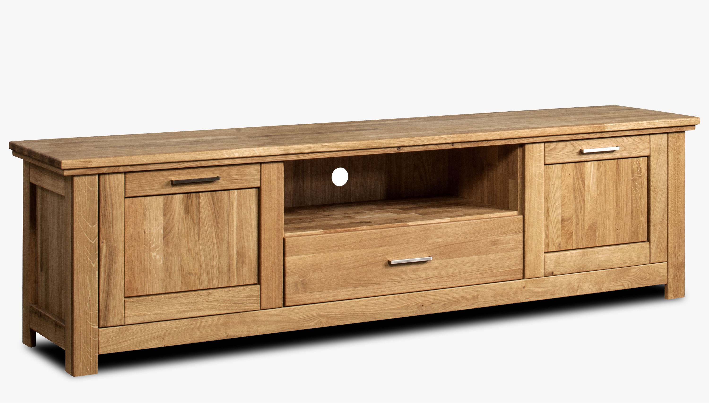 Tömör tölgy televíziós komód természetes kivitelben tölgy olaj elérhető, így könnyen kombinálhatja más kínálatunk elemeivel, akár az Alexandra kollekcióból, akár más sorozatok tölgybútorával.