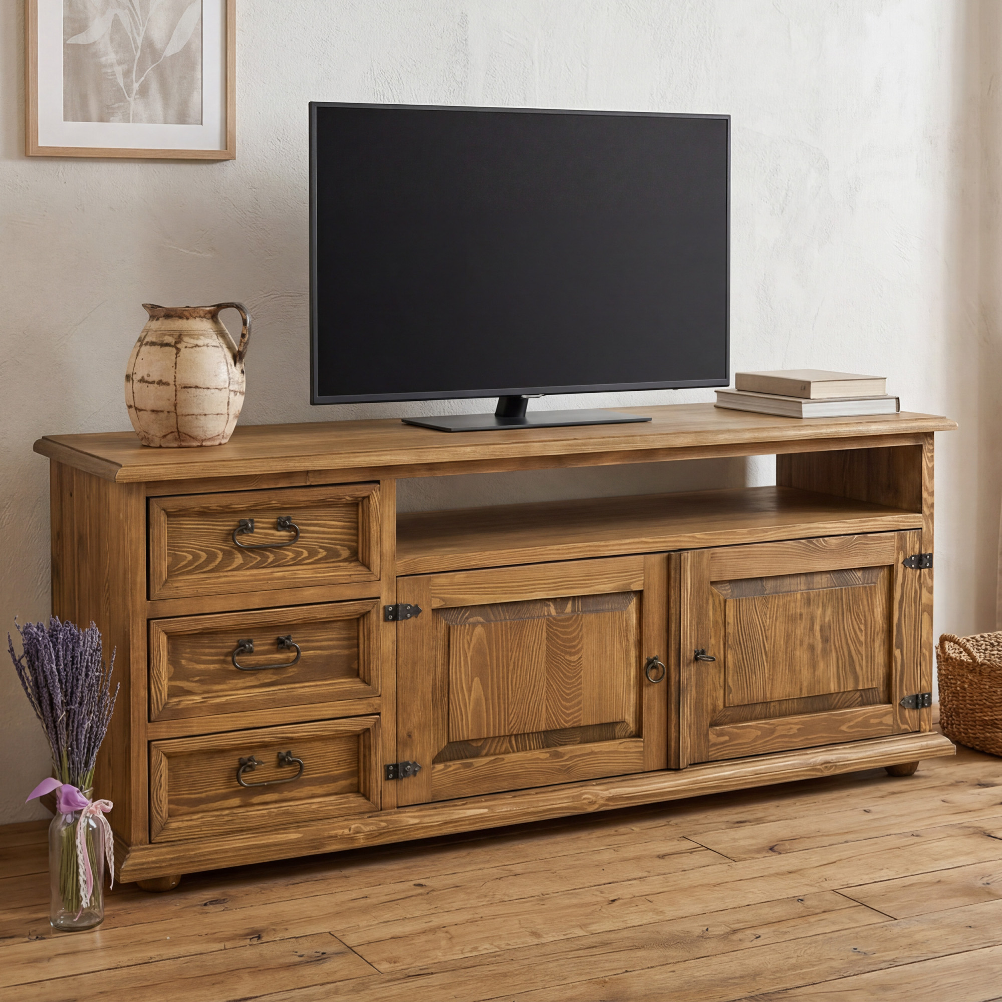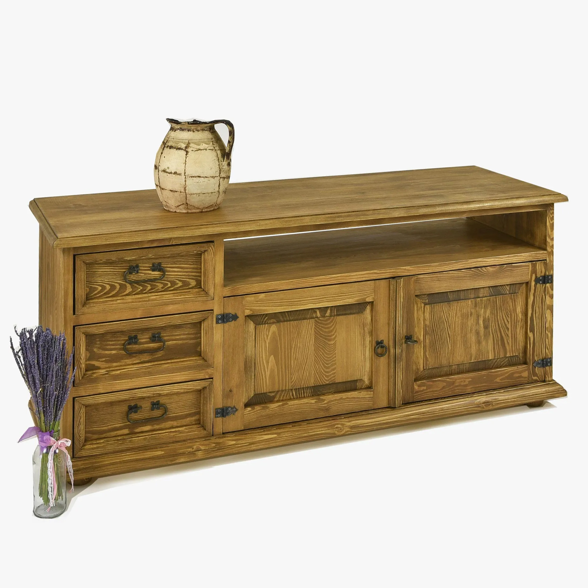 Keres egy minőségi, tömörfa TV-komódot, amely otthonos meleget, igényes kézműves kidolgozást és vidéki bájt visz az enteriőrbe? A paraszt TV-komód tömörfából, 107-es típus kiváló minőségű fenyőfából készül, megjelenését pedig a francia vidéki bútorok időtlen bája ihlette. Masszív szerkezetének, elegáns rusztikus kivitelének és természetes faerezetének köszönhetően nappalija éke lesz, és stílusos helyet biztosít a televíziónak és egyéb elektronikának.