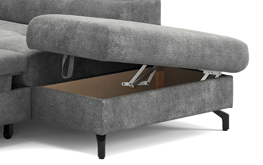 Sarokkanapé fekete fém lábakkal, tárolóval és ággyá alakítható