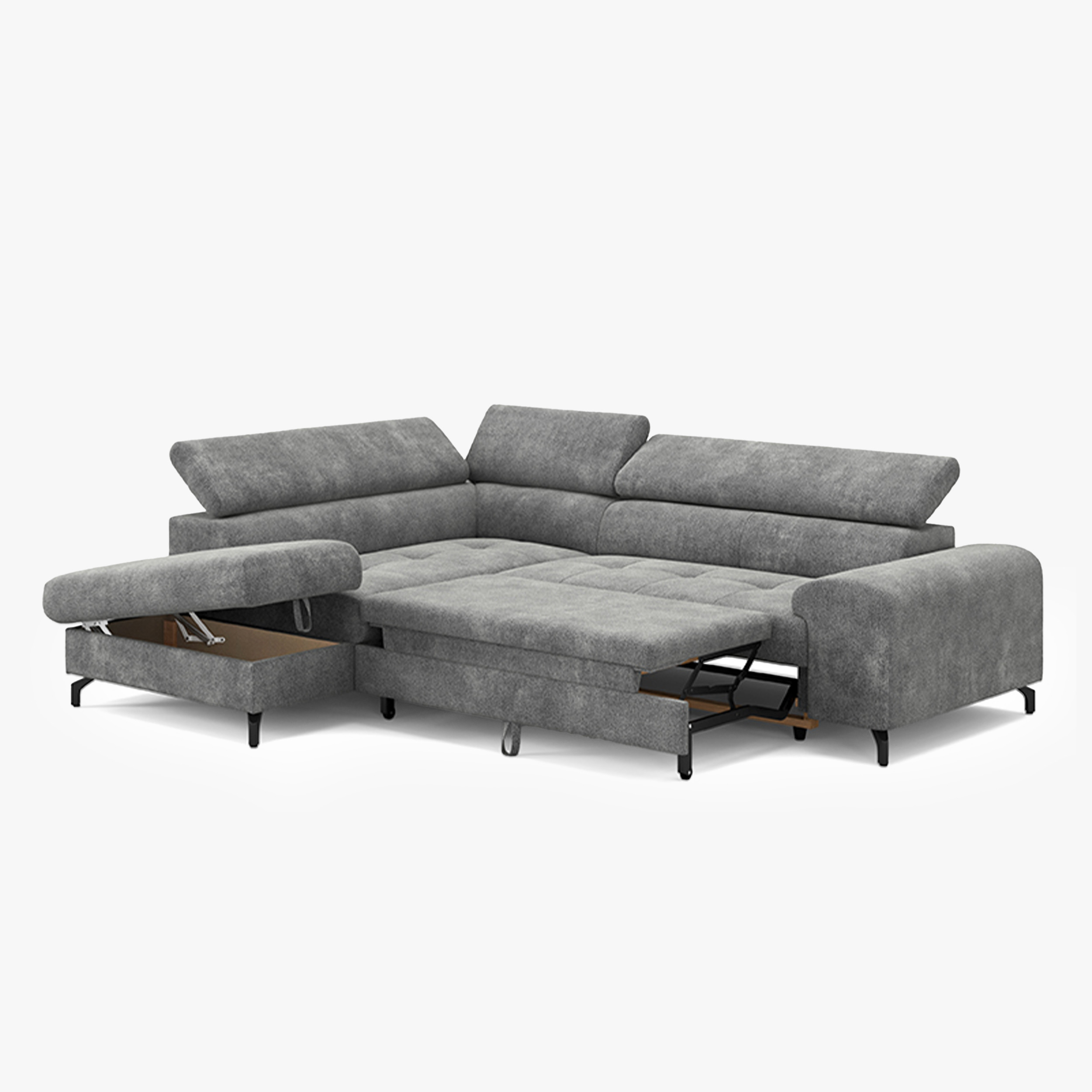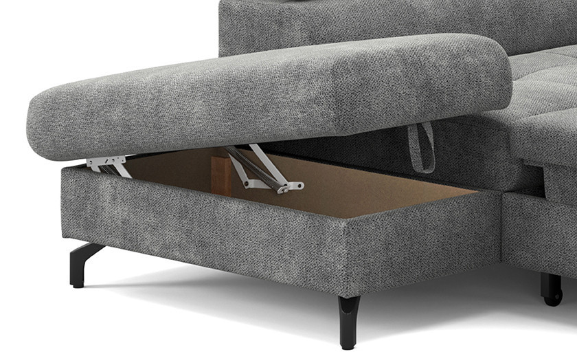 Sarokkanapé ággyá alakítható tárolóval fekete fém lábakkal