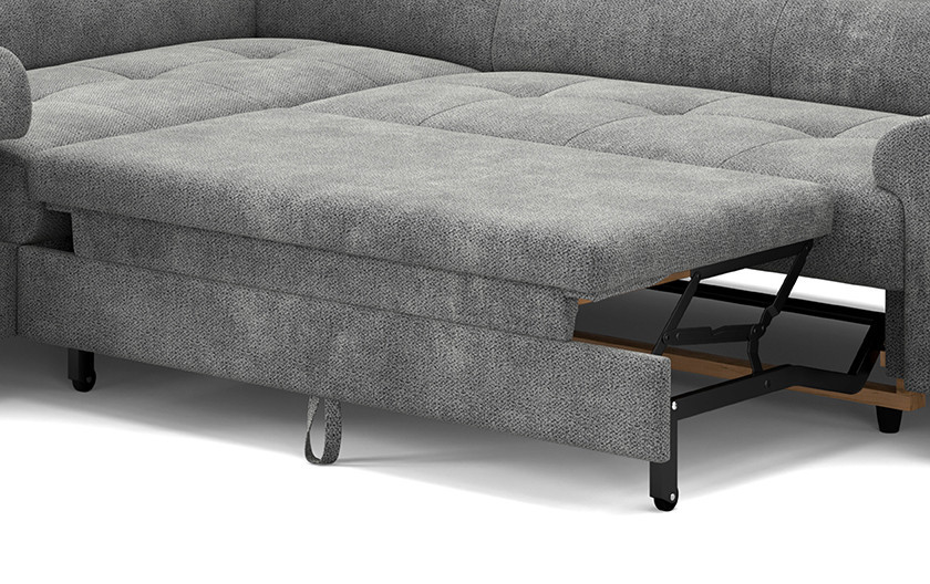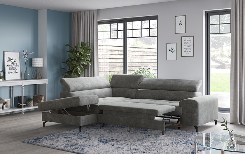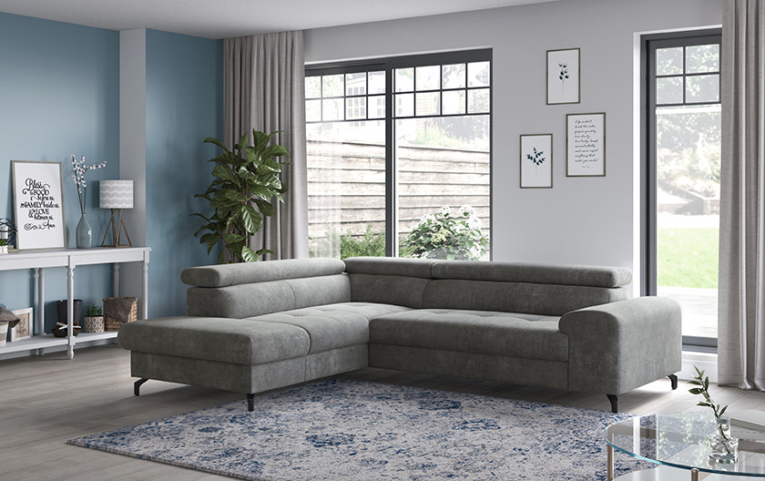 Sarokkanapé Aura a modern lakhatás megtestesítője – egyesíti az időtálló dizájnt, az átgondolt funkcionalitást és a kivételes kényelmet. Ezt a modellt úgy tervezték, hogy tökéletesen alkalmazkodjon a család és az egyén mindennapi igényeihez. A könnyen kinyitható mechanizmus segítségével néhány másodperc alatt átalakíthatja a kanapét kényelmes vendégággyá vagy tágas pihenőfelületté. Ideális filmestékhez, baráti találkozókhoz vagy egy fárasztó nap utáni pihenéshez.