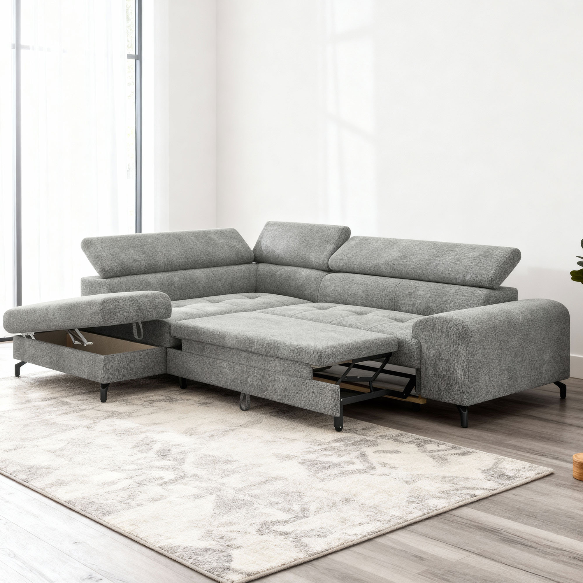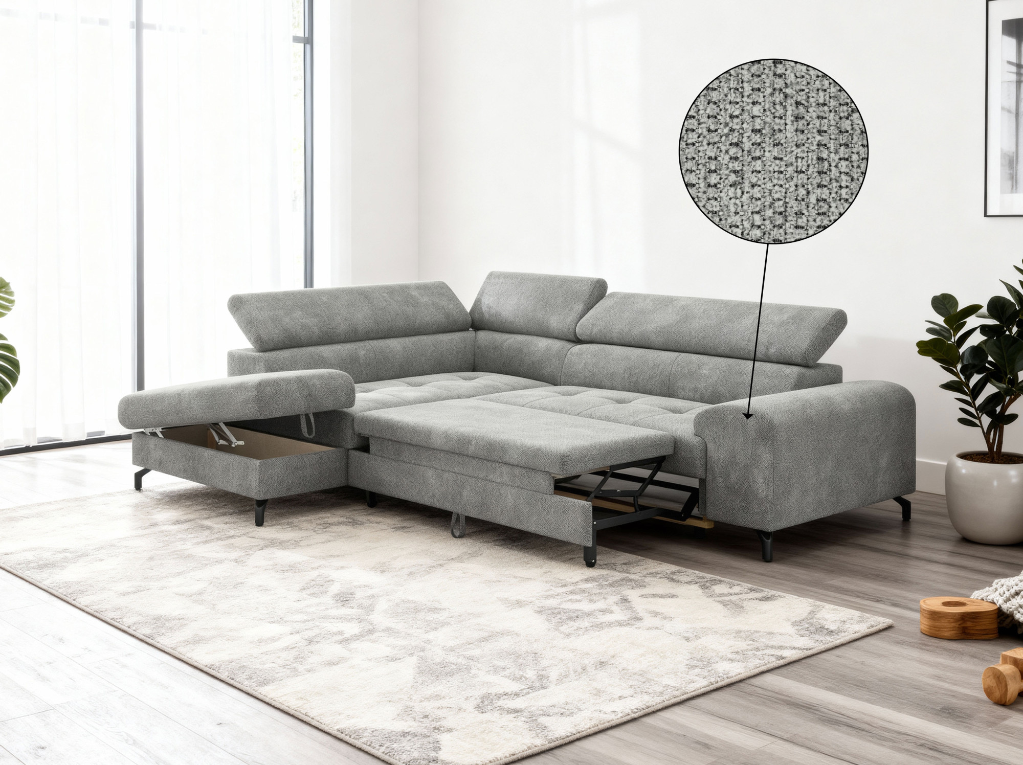 Sarokkanapé ággyá alakítható funkcióval és tárolóhelyiséggel - Balos, platina szín