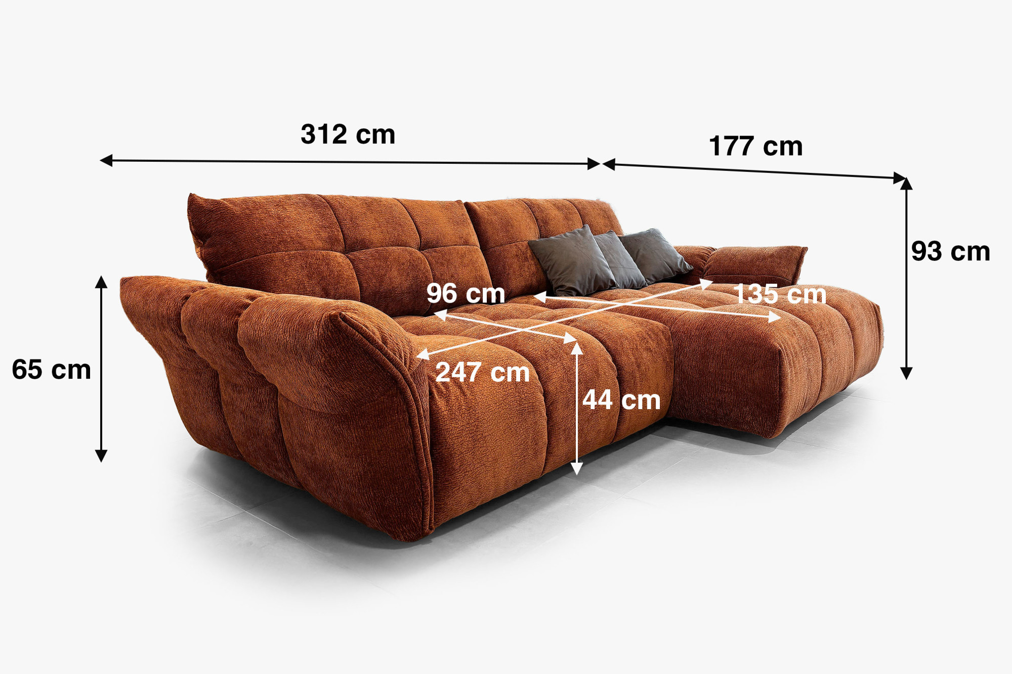 - A kanapé méretei: 312 × 177 cm