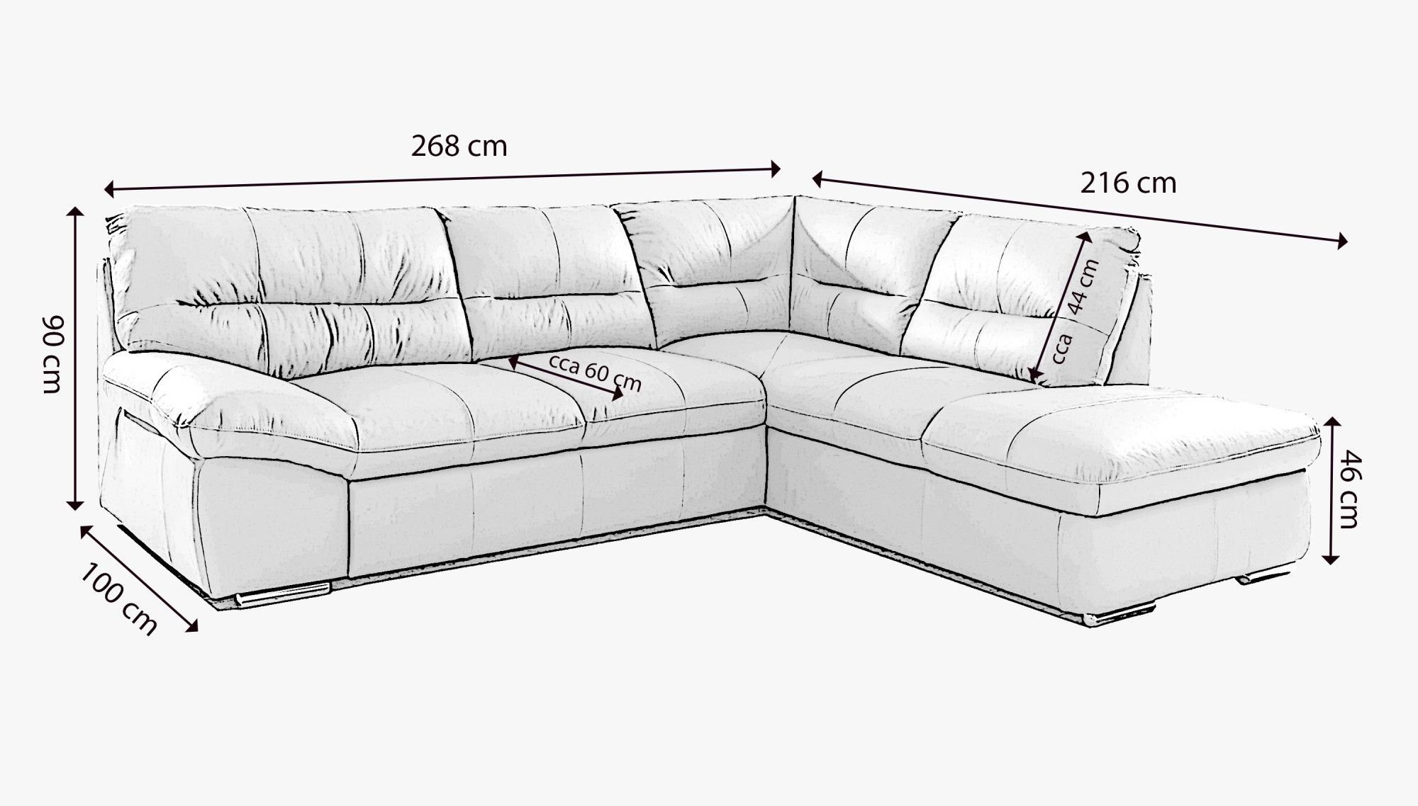 - Méretek: szélesség 268 cm, sarok mélysége 216 cm, magasság 90 cm