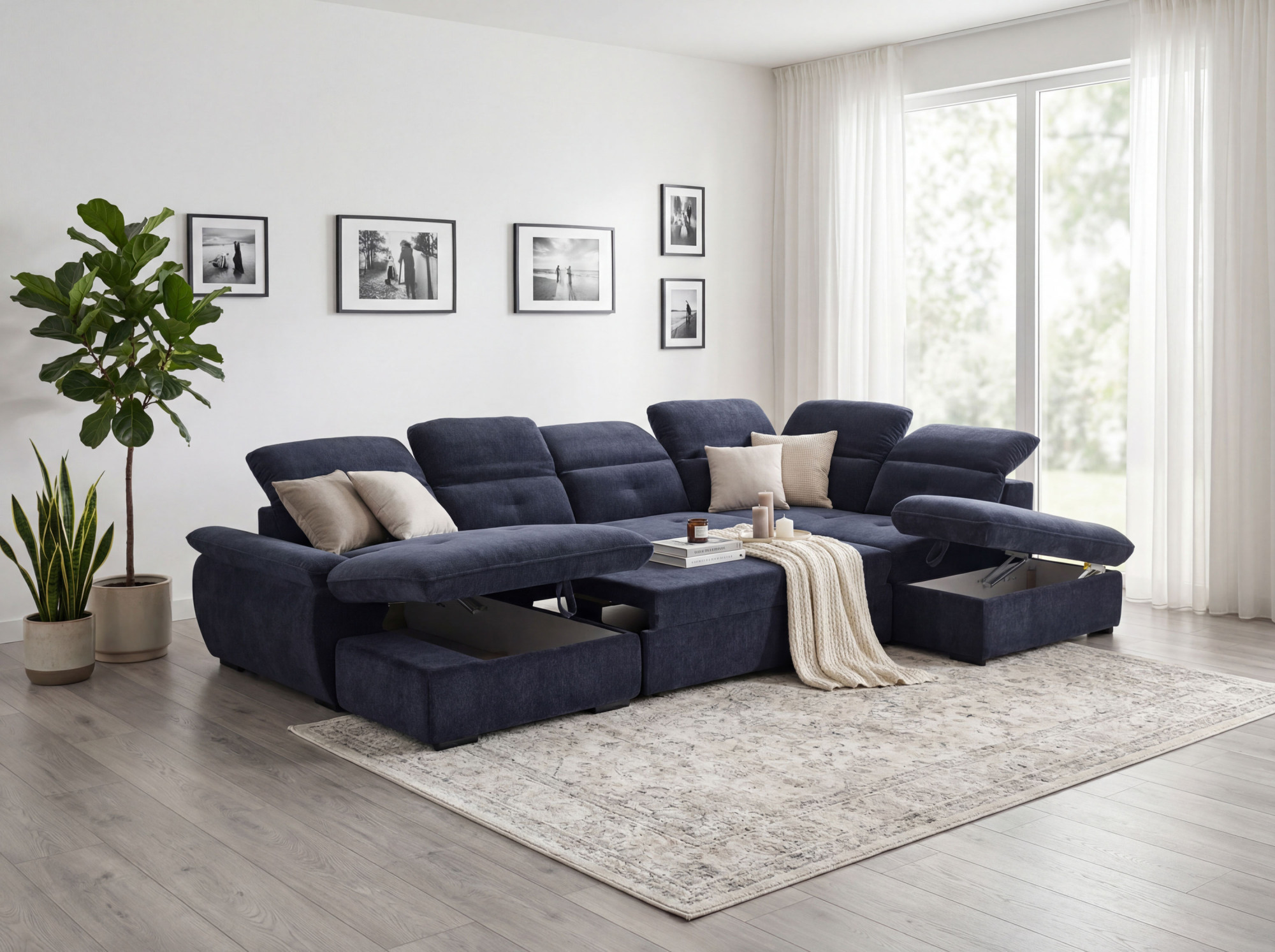 Nagy méretű U-alakú ülőgarnitúra fekvőfunkcióval és tárolóval