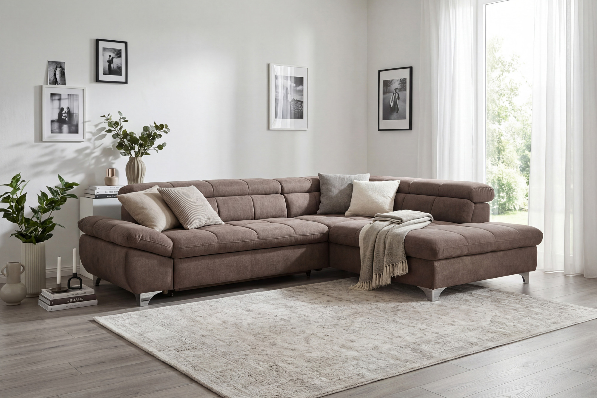 Bemutatjuk Önnek a luxus sarokkanapét elegáns szürke-barna színben, amely tökéletesen ötvözi a modern dizájnt, kényelmet és praktikus funkciókat. Ez az elegáns kanapé ideális választás minden nappaliba, ahol a pihenés és a funkcionalitás kombinációját keresi. A masszív keményfa és fenyő váznak köszönhetően, amely minőségi kárpitozó anyagokkal párosul, olyan bútorhoz jut, amely hosszú éveken át kitart. A kárpitozás különböző sűrűségű hideghab habból készült, amely tökéletes egyensúlyt biztosít a puhaság és a test stabil alátámasztása között.