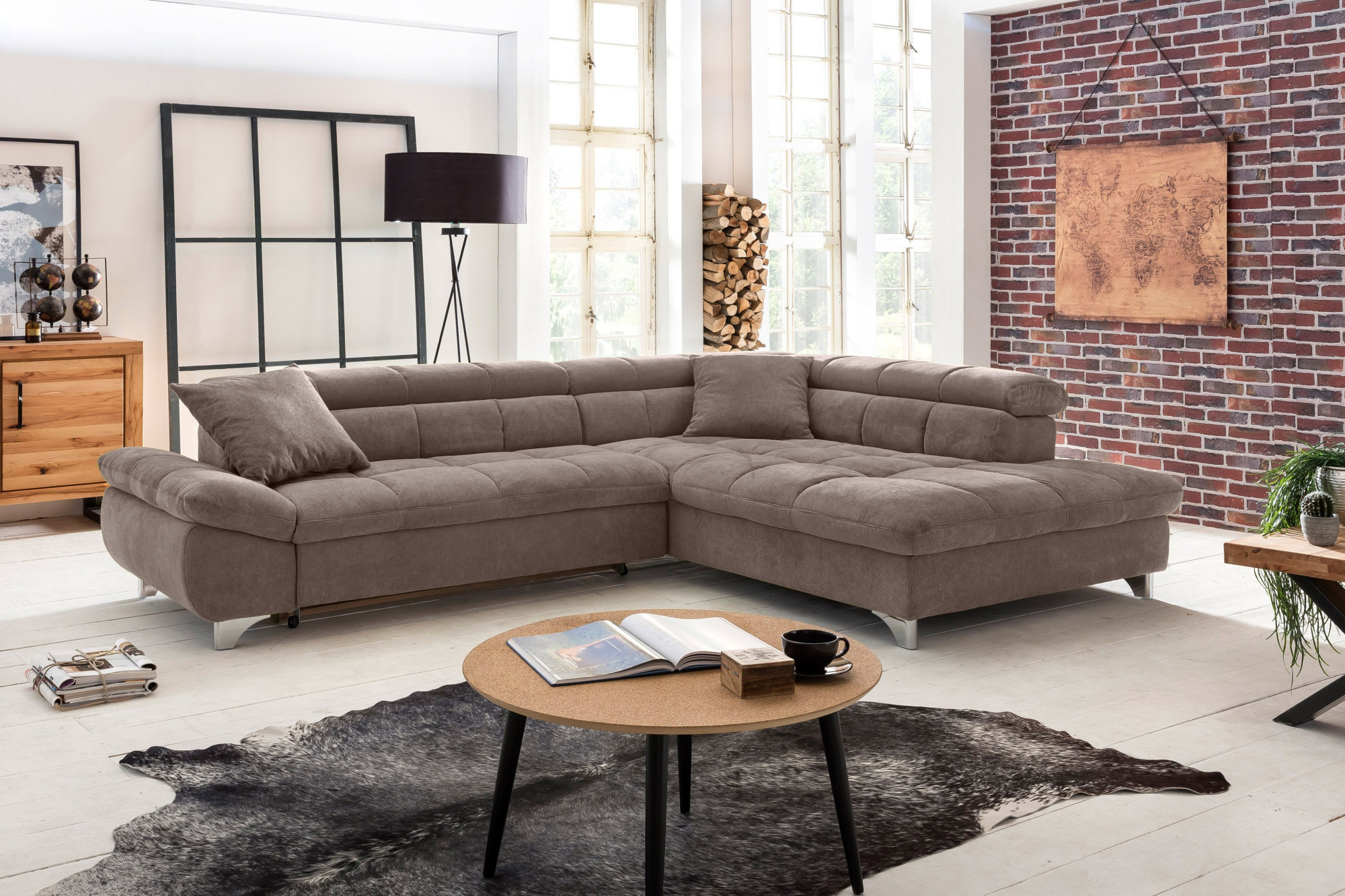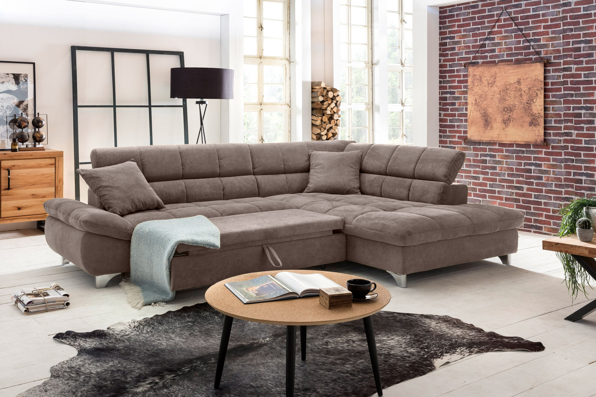 Ágyazható sarokkanapé jobb oldali, keményfa vázzal, szürke-barna