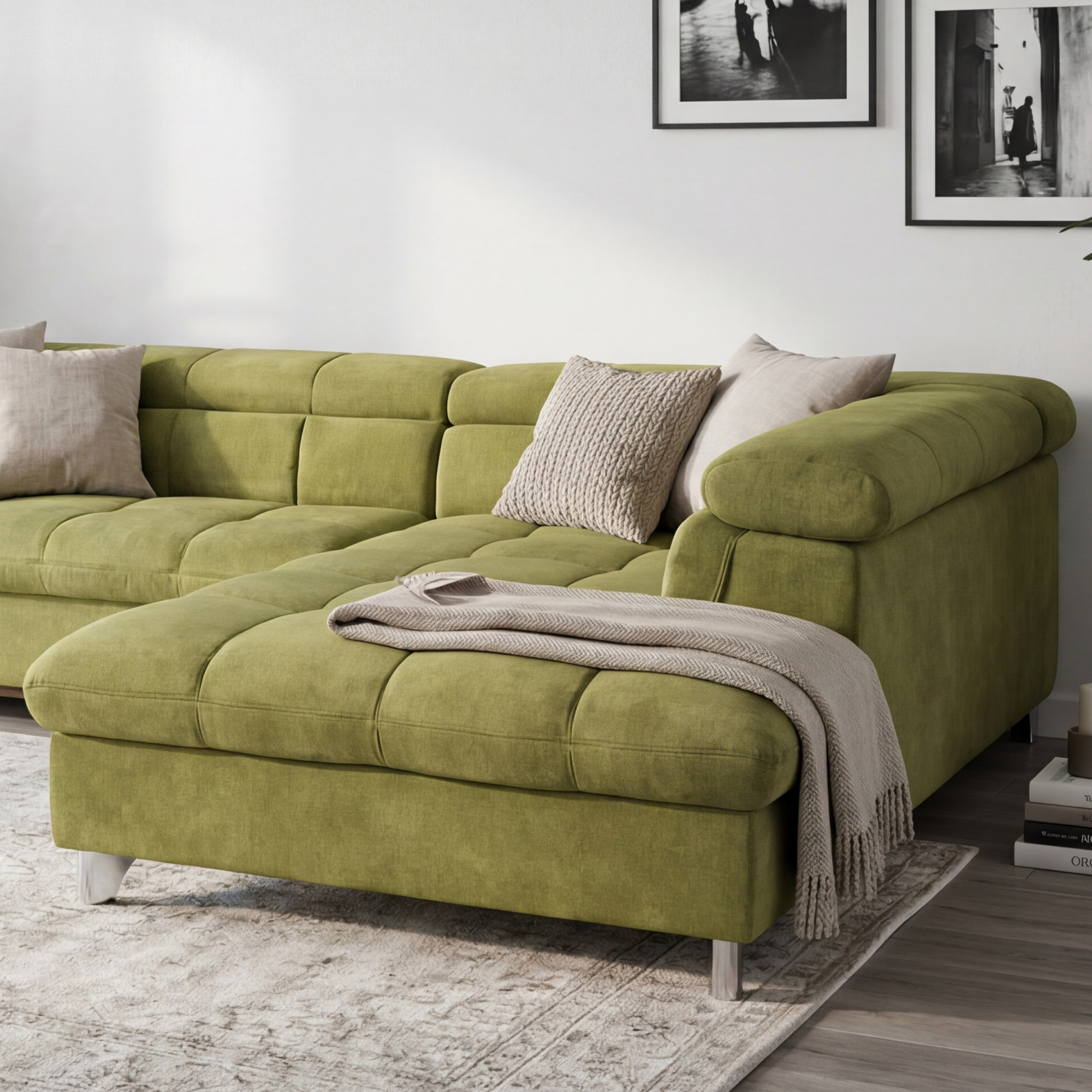 Bemutatjuk Önnek a luxus sarok ülőgarnitúrát elegáns zöld színben, amely tökéletesen ötvözi a modern dizájnt, kényelmet és a praktikus funkciókat. Ez az elegáns kanapé ideális választás minden nappaliba, ahol a kikapcsolódás és a funkcionalitás kombinációját keresi. A tömörfa és fenyő masszív szerkezetének valamint a minőségi kárpitozó anyagoknak köszönhetően olyan bútort kap, amely sok éven át tartós marad. A kárpitozás különböző sűrűségű poliuretán habból készült, amely tökéletes egyensúlyt nyújt a puhaság és a test megfelelő tartása között.
