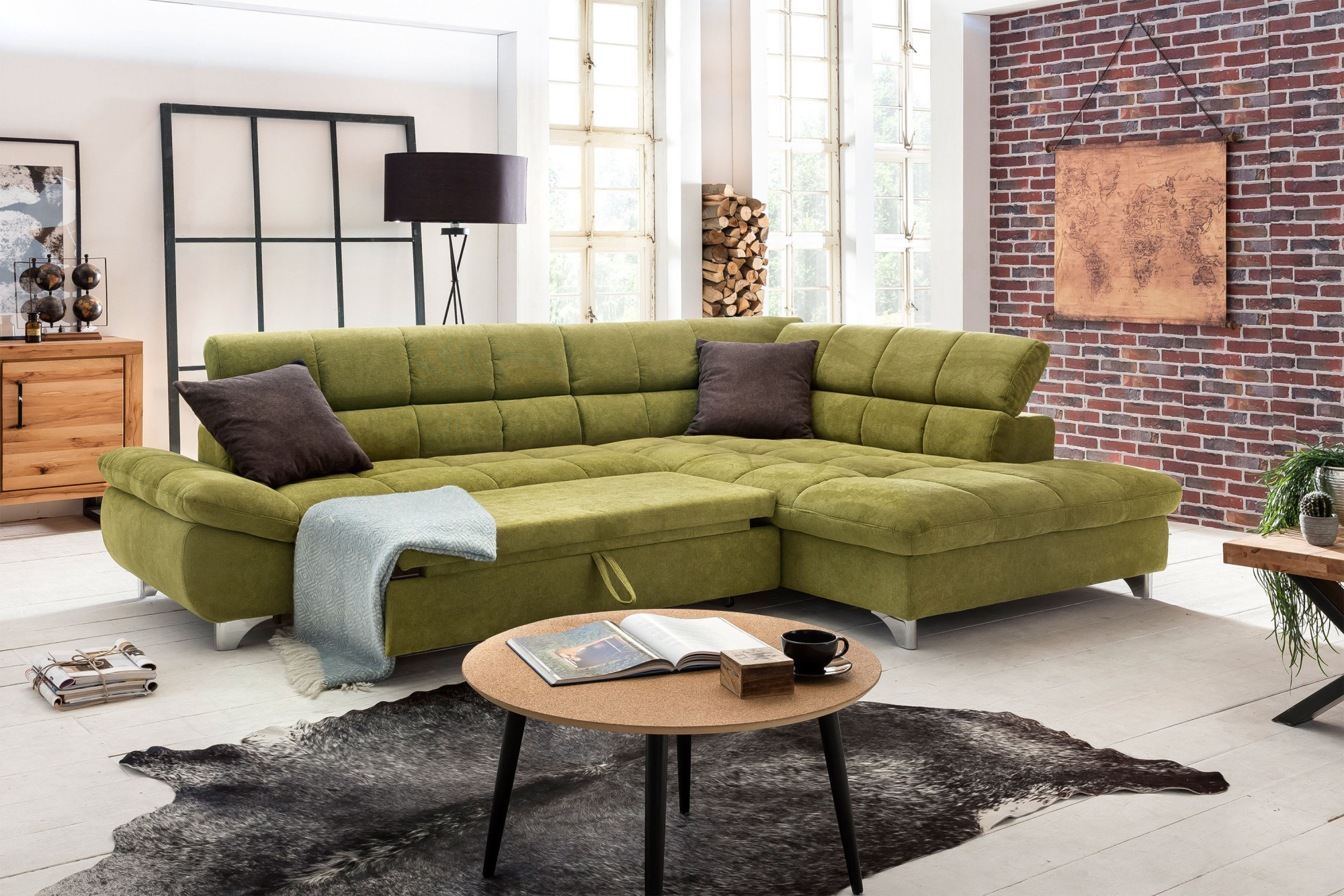 Zöld sarok ülőgarnitúra ágyazható funkcióval, tömörfa vázzal