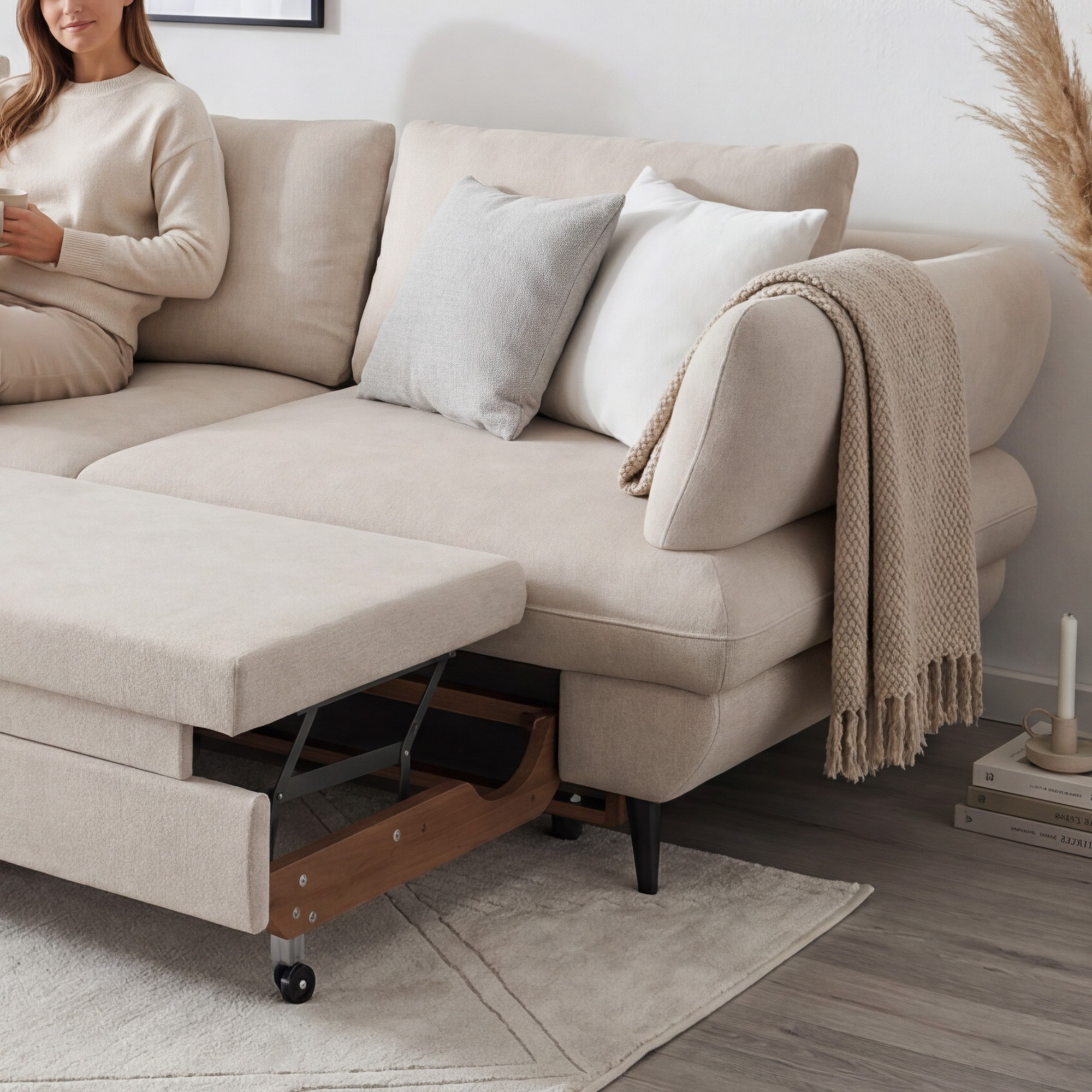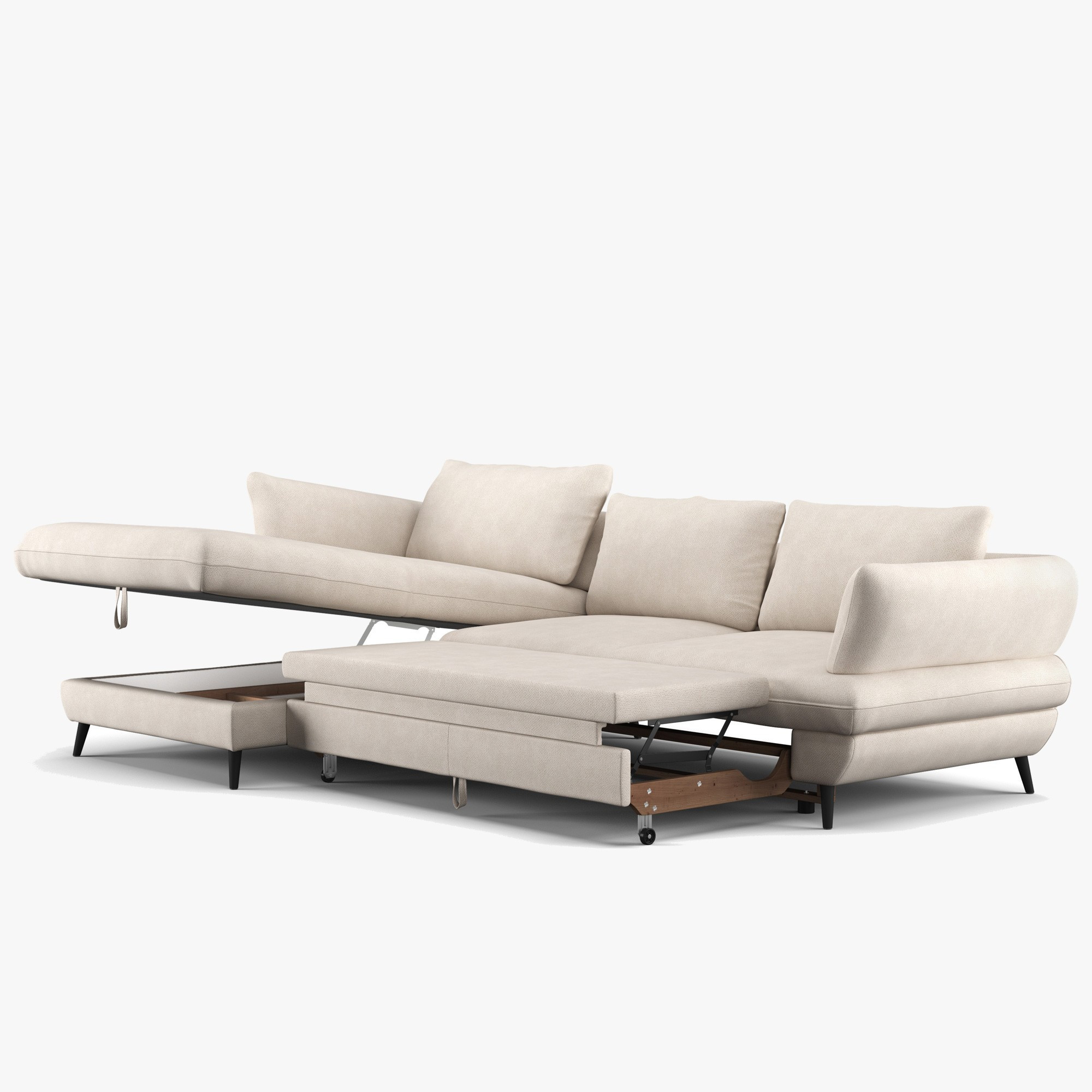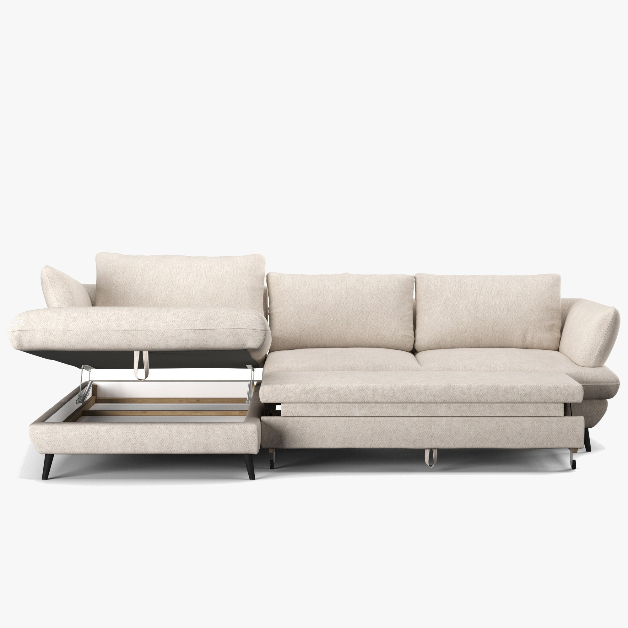 A váz tömör fából és fenyőből készült, melyet formaldehidmentes farostlemez és minőségi, freonmentes PU hab egészít ki. Az ülőfelület acél hullámrugókkal rendelkezik, a háttámlát kényelmes támaszt nyújtó kárpitos pántok alkotják. Gyakorlati a fekvőfunkció és a tárolóhely a ágyneműknek. A szabadon elhelyezett hátsó párnák és a fekete fémből készült láb (magassága 12,5 cm) modern megjelenést kölcsönöznek, és megkönnyítik a takarítást.
