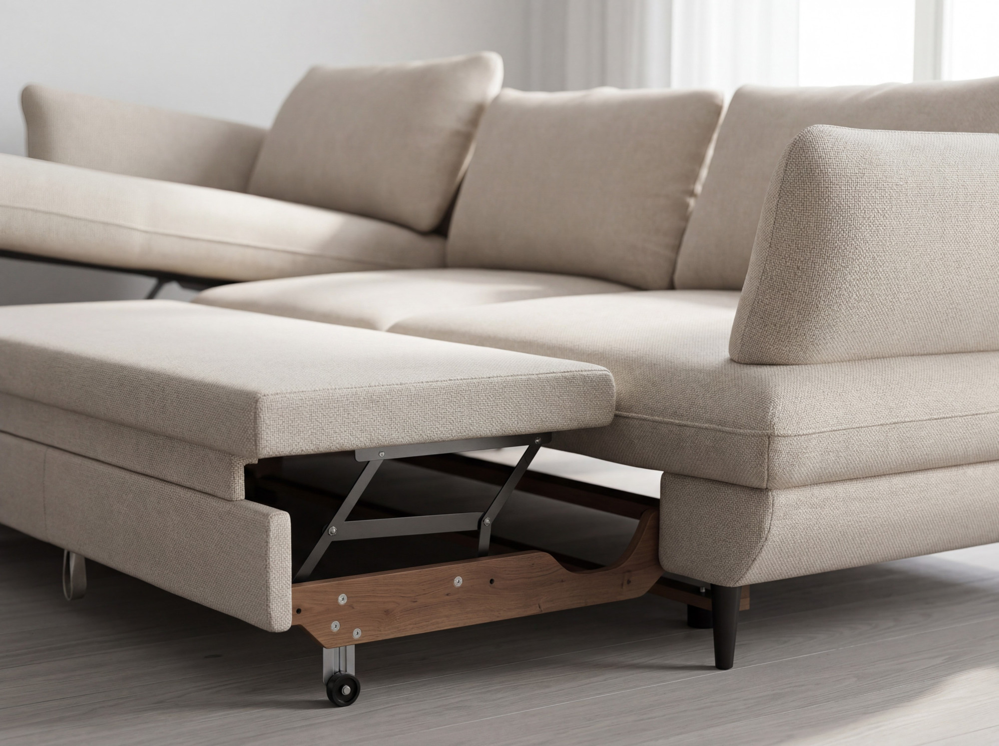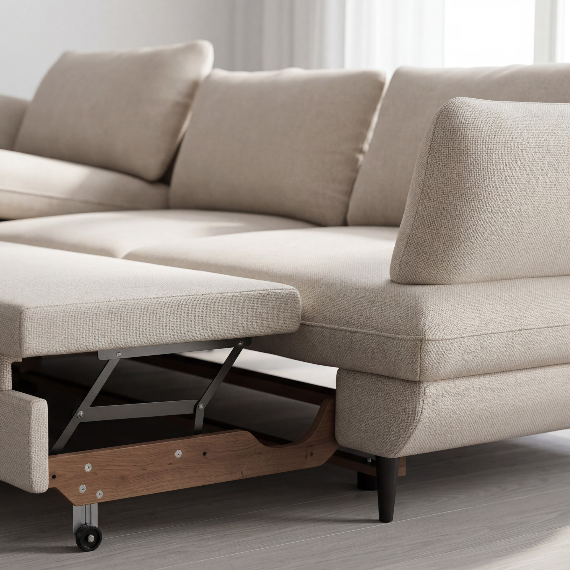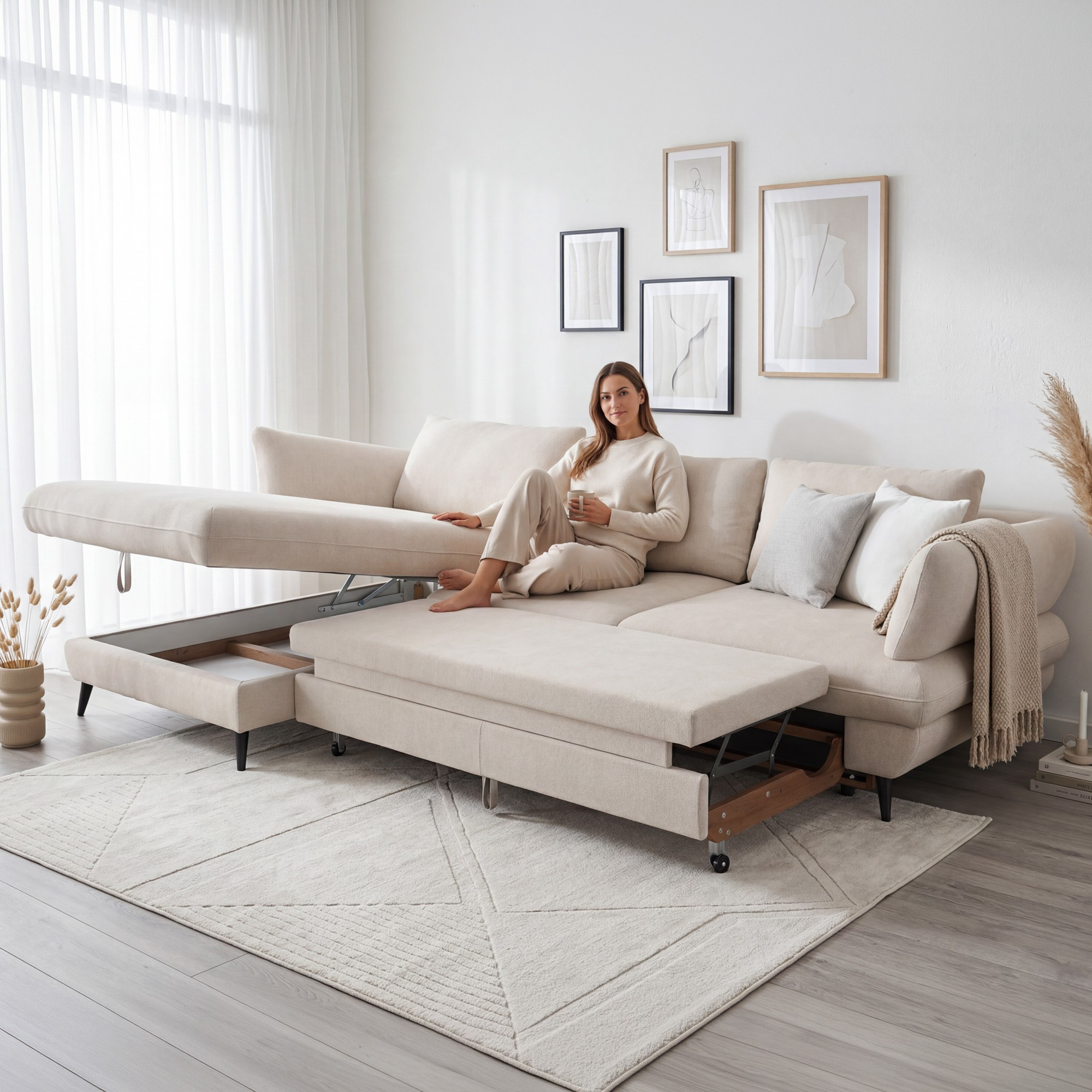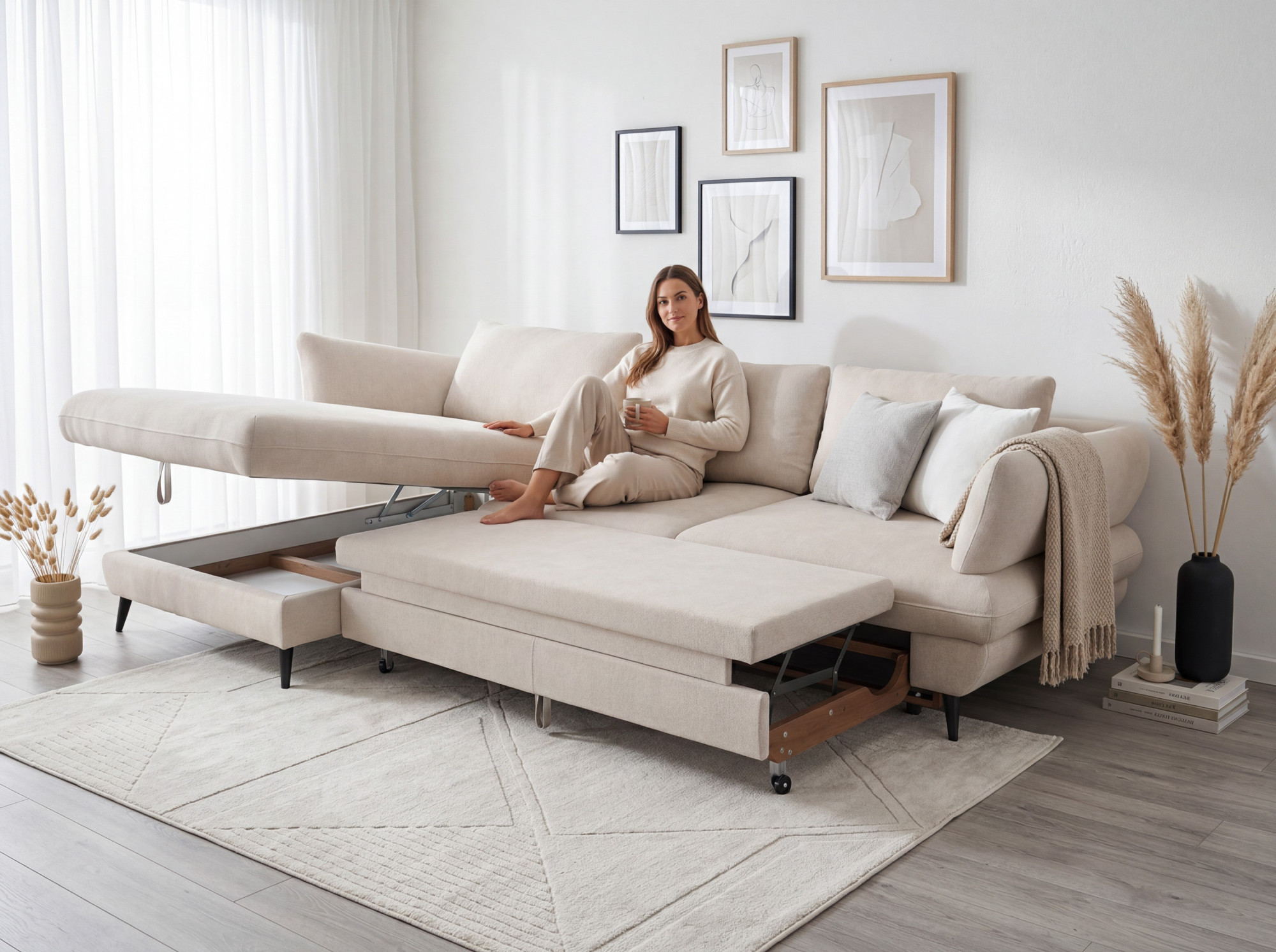A váz tömör fából és fenyőből készült, melyet formaldehidmentes farostlemez és minőségi, freonmentes PU hab egészít ki. Az ülőfelület acél hullámrugókkal rendelkezik, a háttámlát kényelmes támaszt nyújtó kárpitos pántok alkotják. Gyakorlati a fekvőfunkció és a tárolóhely a ágyneműknek. A szabadon elhelyezett hátsó párnák és a fekete fémből készült láb (magassága 12,5 cm) modern megjelenést kölcsönöznek, és megkönnyítik a takarítást.
