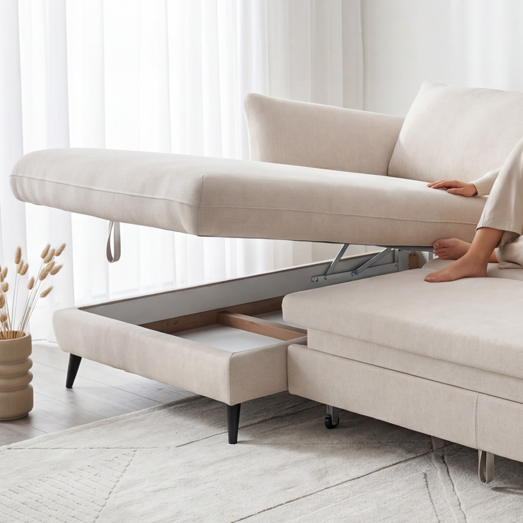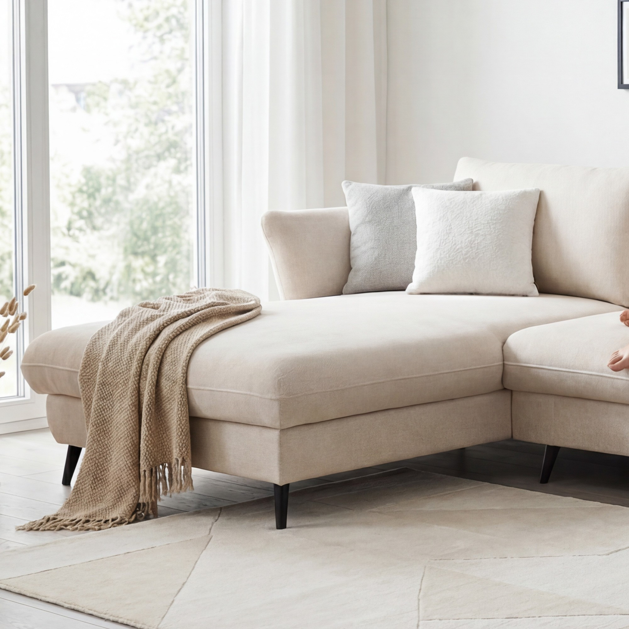 Igen, semleges, modern designnak és fekete fém lábaknak köszönhetően könnyen párosítható fából vagy fémből készült, világos vagy sötét kiegészítőkkel. - Van tárolóhely a kanapén?