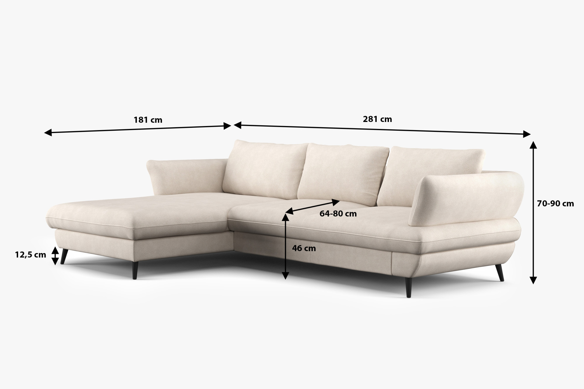 - Méretek: 281 × 181 × 70 cm (Sz × Mé × M)