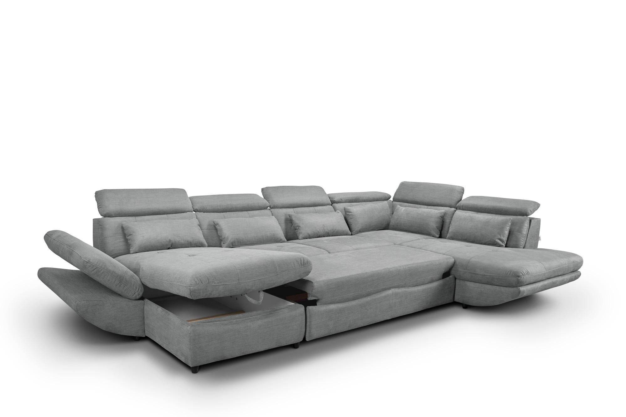 U alakú fekvő sarokkanapé tárolóval, keményfa vázzal, szürke