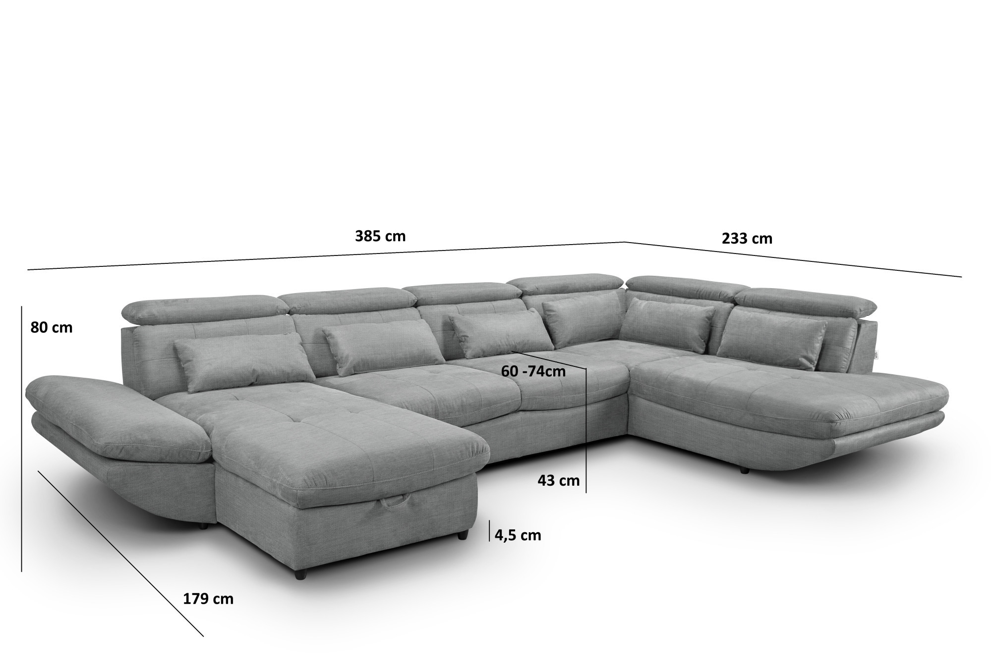 Nagy előnye ennek a kárpitozott kanapénak a magas variabilitása. Elérhetők állítható fejtámlák, állítható kartámaszok és továbbá egy tágas fekvőfelület mérete 307 x 136 cm, amely elegendő helyet biztosít alkalmi alváshoz. Az ülésmagasság 43 cm és az ülésmélység 60 cm hozzájárul a kényelmes napi pihenéshez. A kanapé 4,5 cm magas fekete műanyag lábakon áll, és választható széles kárpitanyag-választék, így megjelenését könnyen igazíthatja az adott enteriőrhöz. A modellt kérheti sarok kivitelben is, és kiegészítheti egy puffal, ami kiváló választássá teszi modern nappalikba, családi házakba és városi lakásokba.