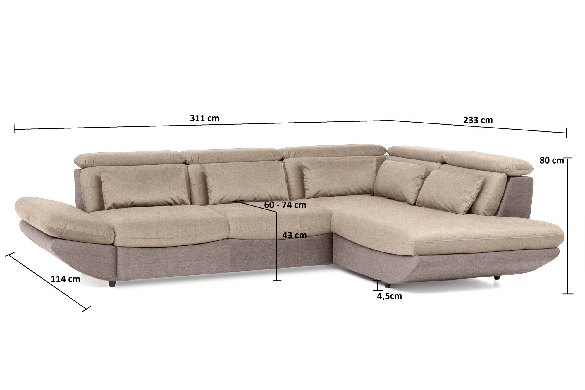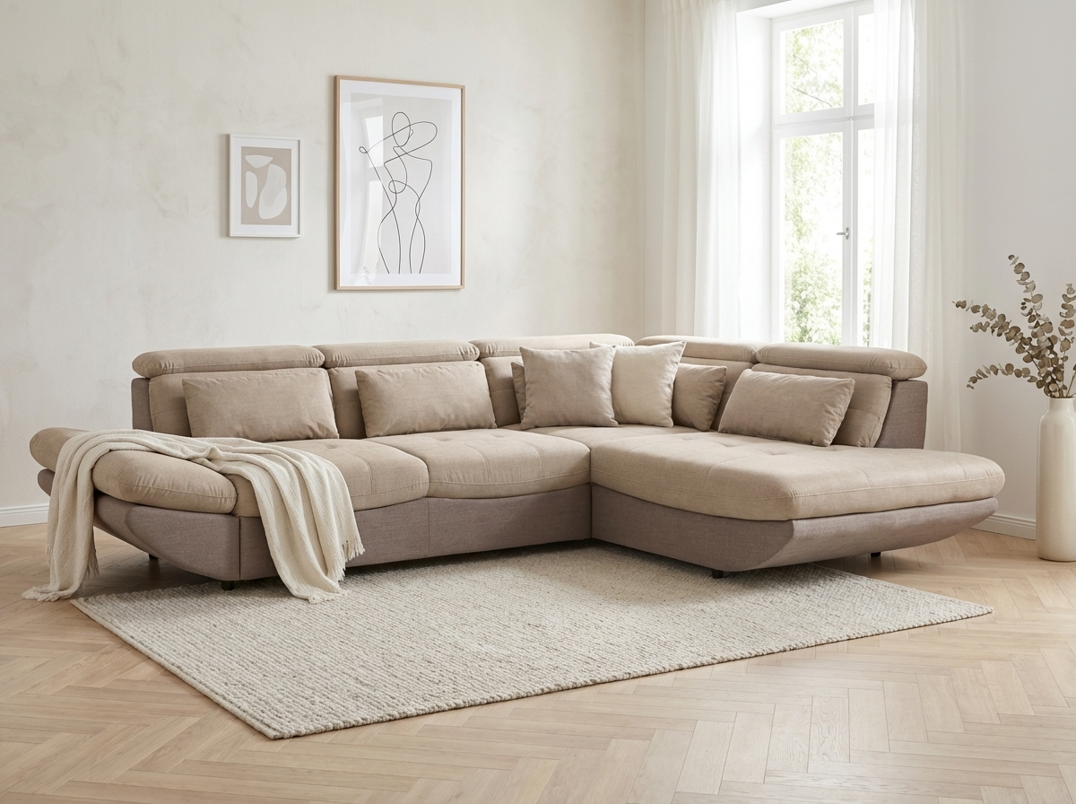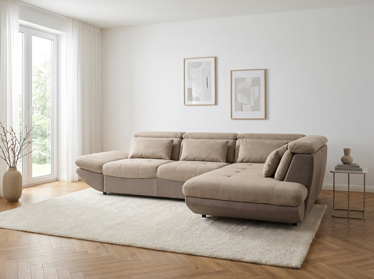 Modern sarok ülőgarnitúra Park ideális megoldást jelent mindazok számára, akik tágas ülőgarnitúrát keresnek gyakorlati funkciókkal és vonzó kialakítással. Ez a kihúzható ülőgarnitúra már az alapárban kínálja a fekvőfunkciót, tárolóhelyet és állítható fejtámlákat, így tökéletes választás minden modern nappaliba. A tágas méreteknek köszönhetően 311 × 233 cm elegendő helyet biztosít a család mindennapos pihenéséhez. A kényelmet nemcsak a derékpárnák biztosítják, hanem a freonmentes PU habból készült minőségi töltet és a hullámrugók az ülőfelületben, amelyek hosszú élettartamot és kényelmet garantálnak.
