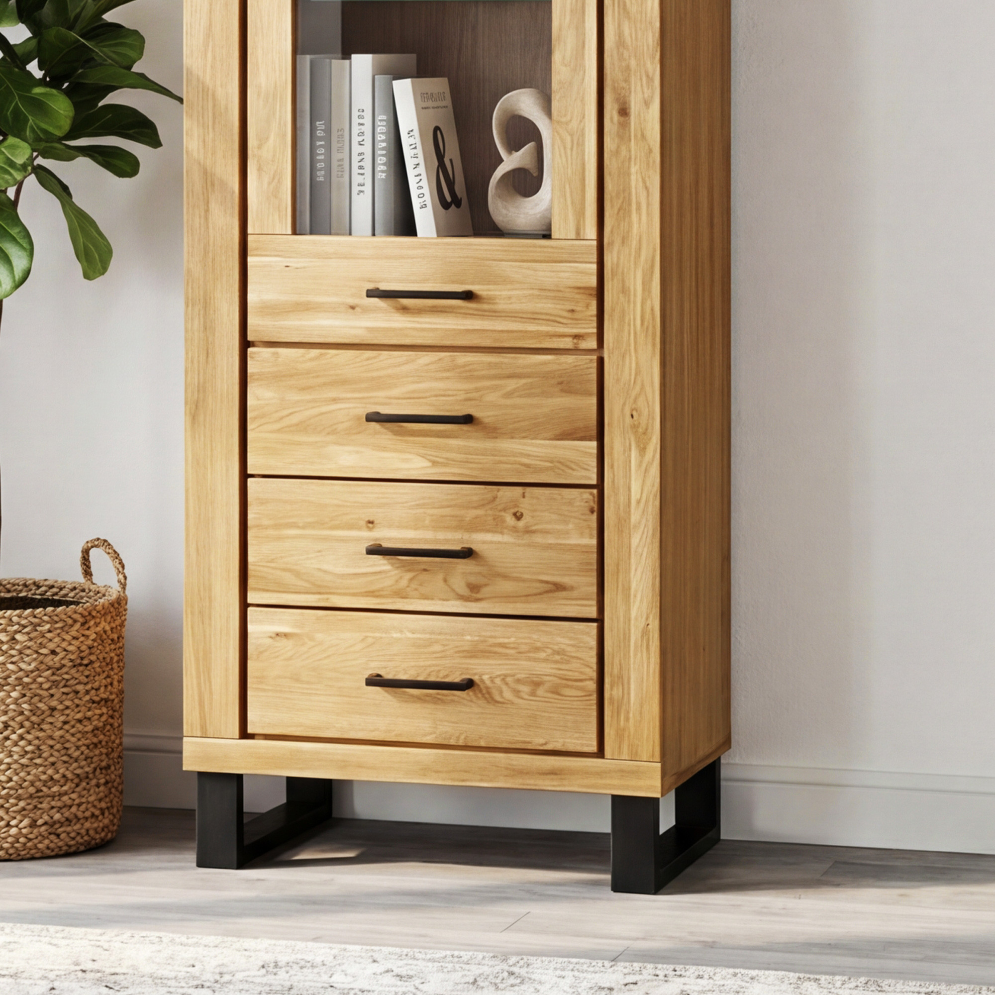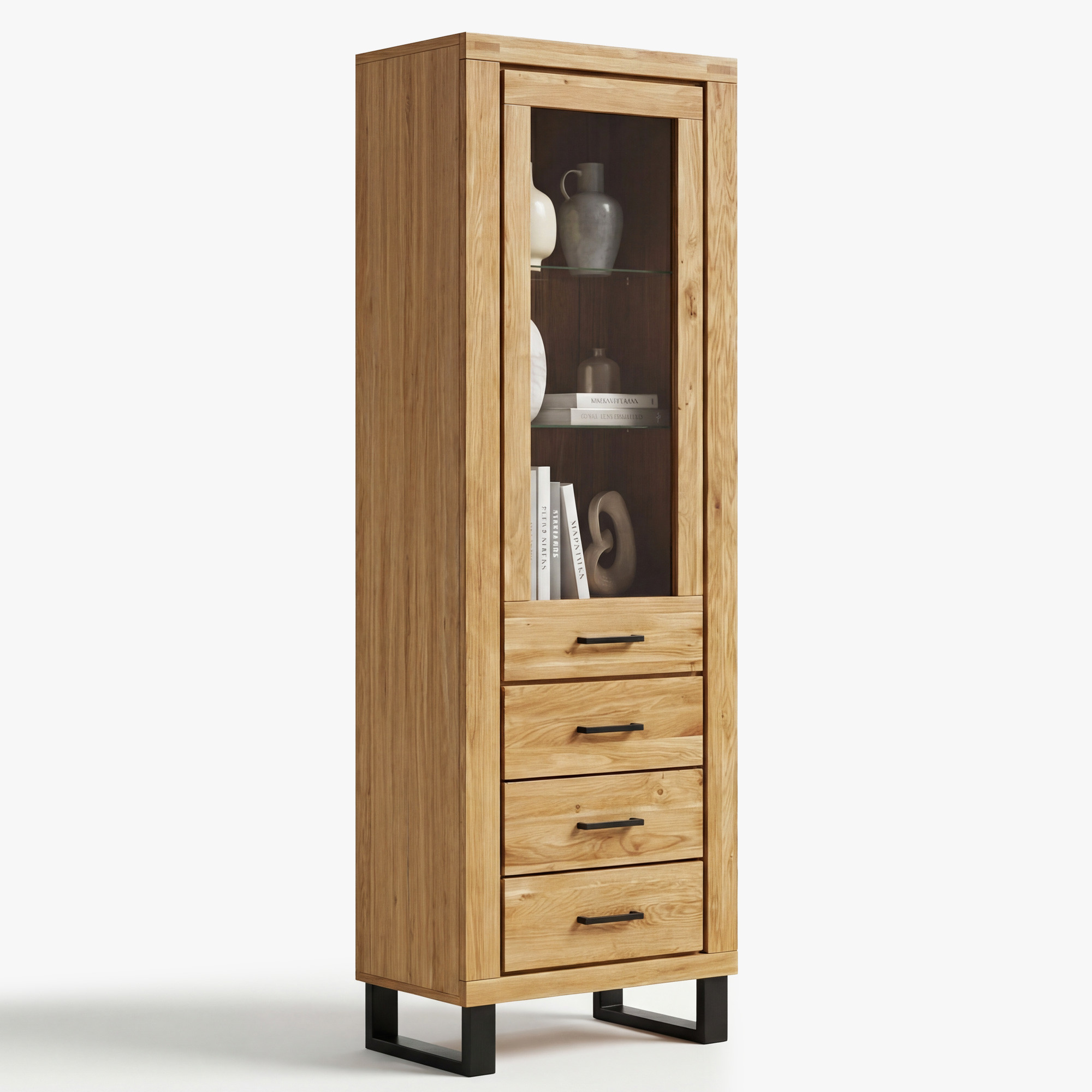 A vitrin korpusza tölgy furnérozott lemezből készül, a belső polcok pedig laminált lemezből tölgy dekorral, ami optimális ár-érték arányt biztosít. A fiókok soft-close rendszerrel vannak felszerelve a csendes és sima záródás érdekében. A kompakt méreteknek köszönhetően 67,5 × 40 × 199 cm a vitrin alkalmas kisebb lakásba is, ugyanakkor tágas házban is tökéletesen érvényesül. A vitrin elegáns lábakon áll, amelyek légies megjelenést kölcsönöznek a bútornak és megkönnyítik a padló takarítását. A bútor már összeszerelten kerül kiszállításra, így az átvétel után azonnal használatba veheti.