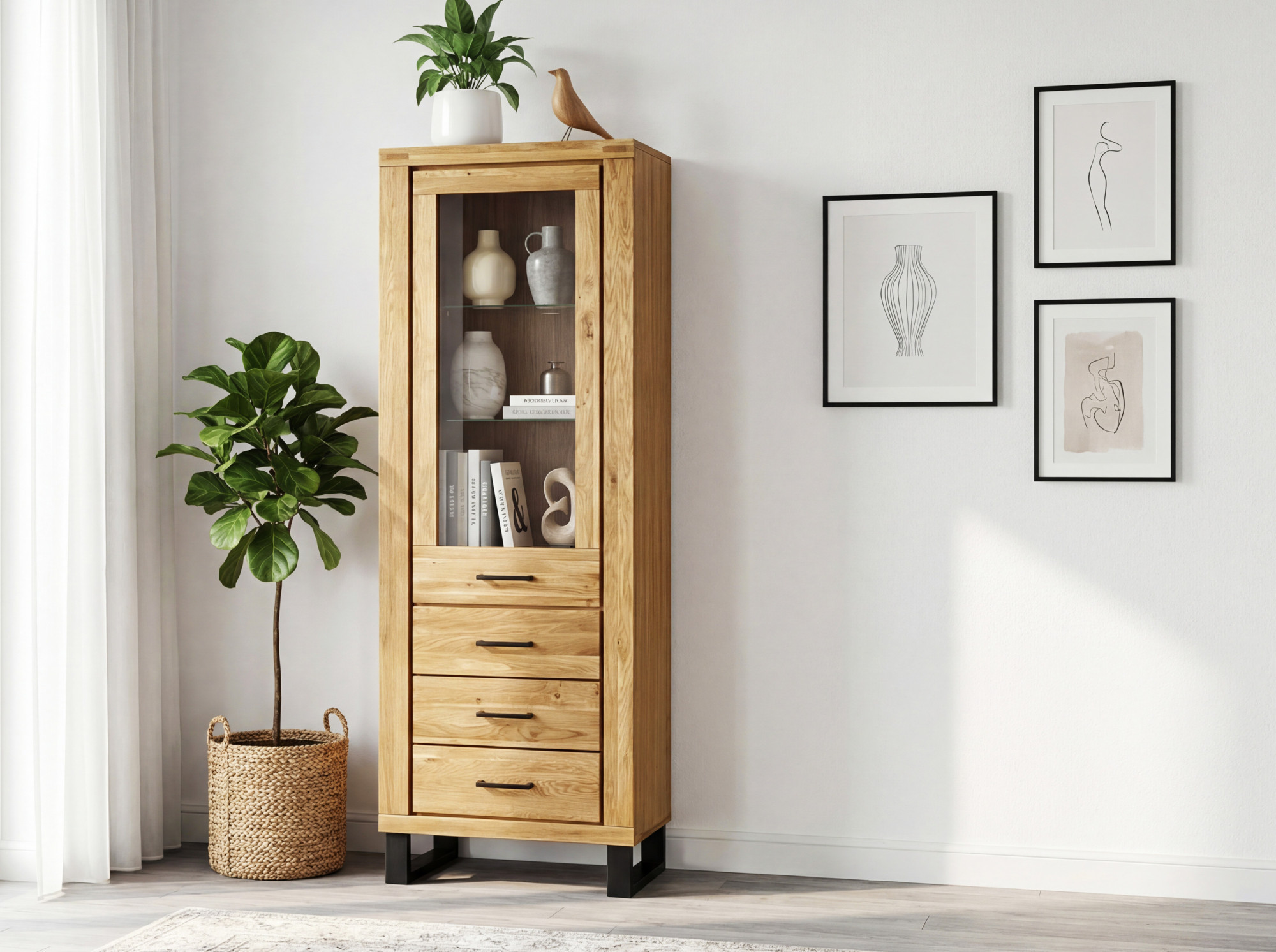 Keres egy stílusos vitrint, amely a modern dizájnt praktikus tárolóhellyel ötvözi? Bemutatjuk Önnek a Martina egyszárnyú tölgy vitrint üvegezett ajtókkal, amely a nappalija dísze lesz. A vitrin a minimalista belsők kedvelőinek készült, akik értékelik a fa természetes és tiszta megjelenését. Az elülső rész tömör tölgyfából készült, természetes olajjal kezelve, amely kiemeli a fa erezetét és autentikus jelleget ad a bútornak. Az üvegezett ajtók elegáns bemutatást tesznek lehetővé kedvenc tárgyainak, míg a három praktikus fiók bőséges rejtett tárolóhelyet biztosít.