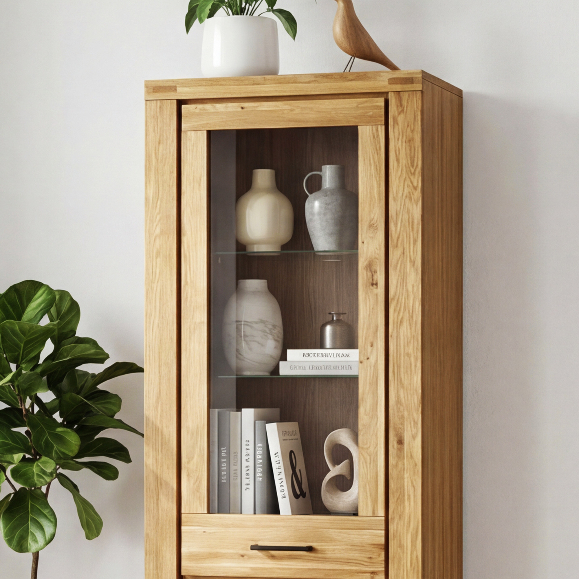 Martina egyszárnyú tölgy vitrin lábakon – elegáns üvegezett vitrin a nappaliba