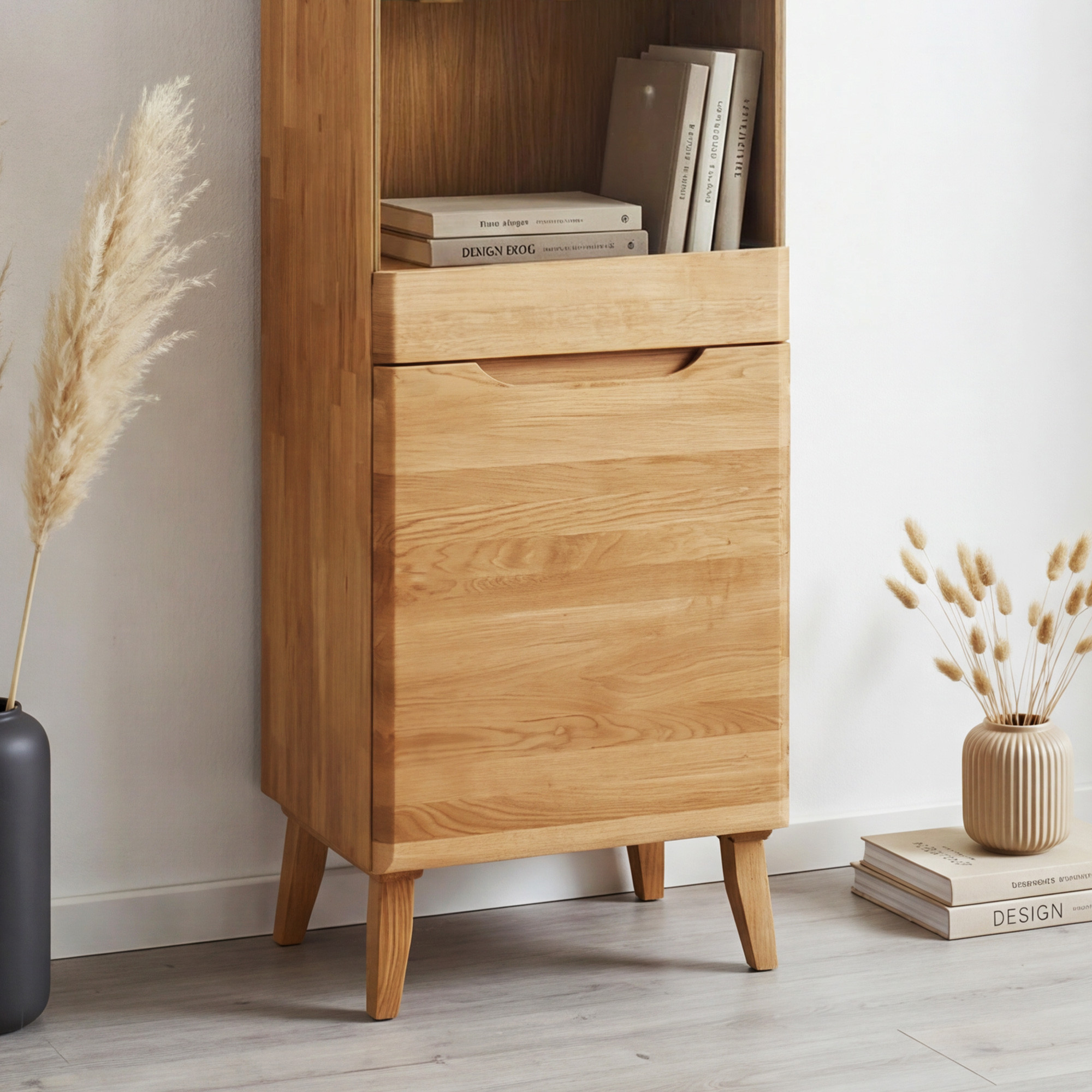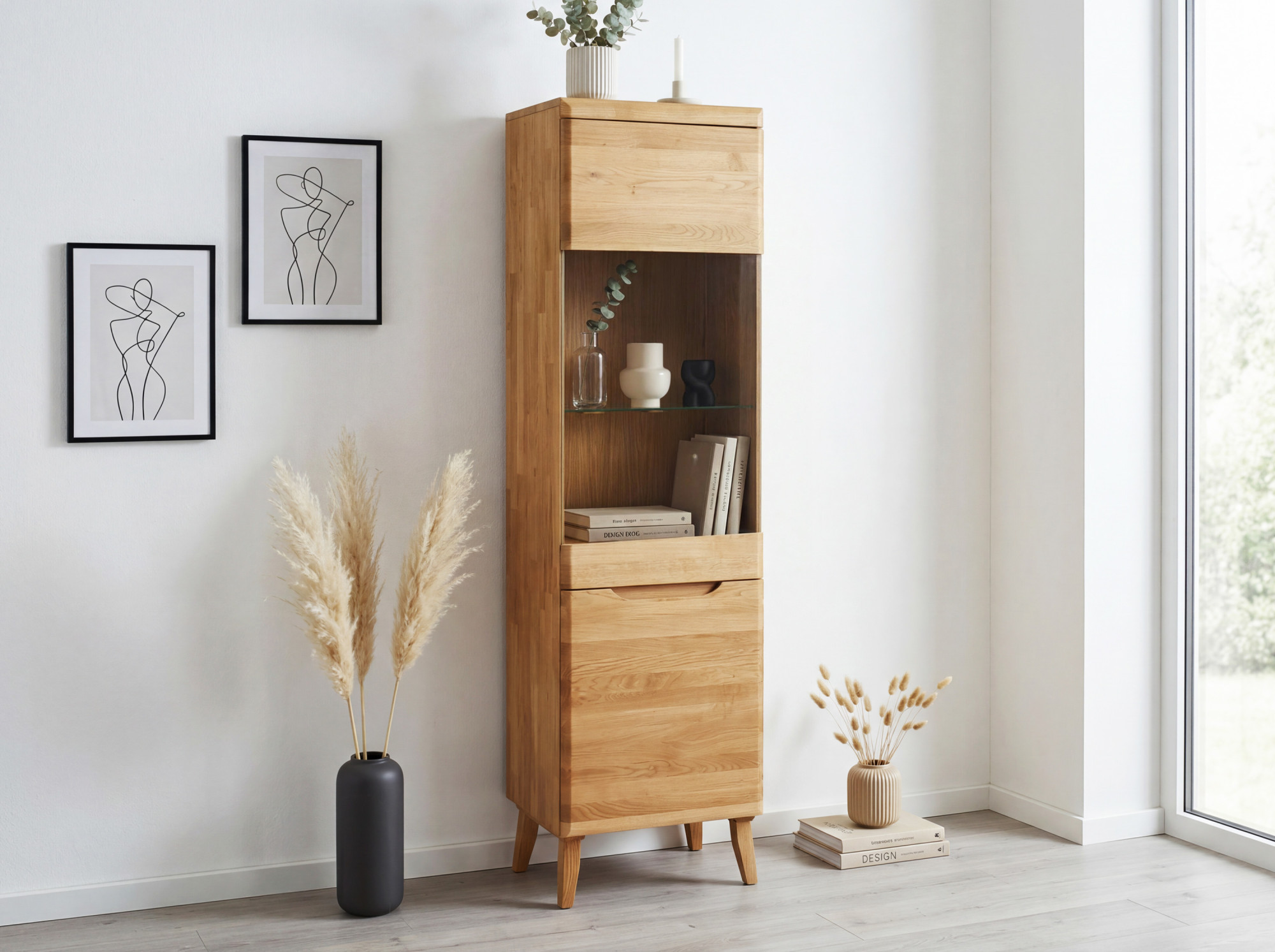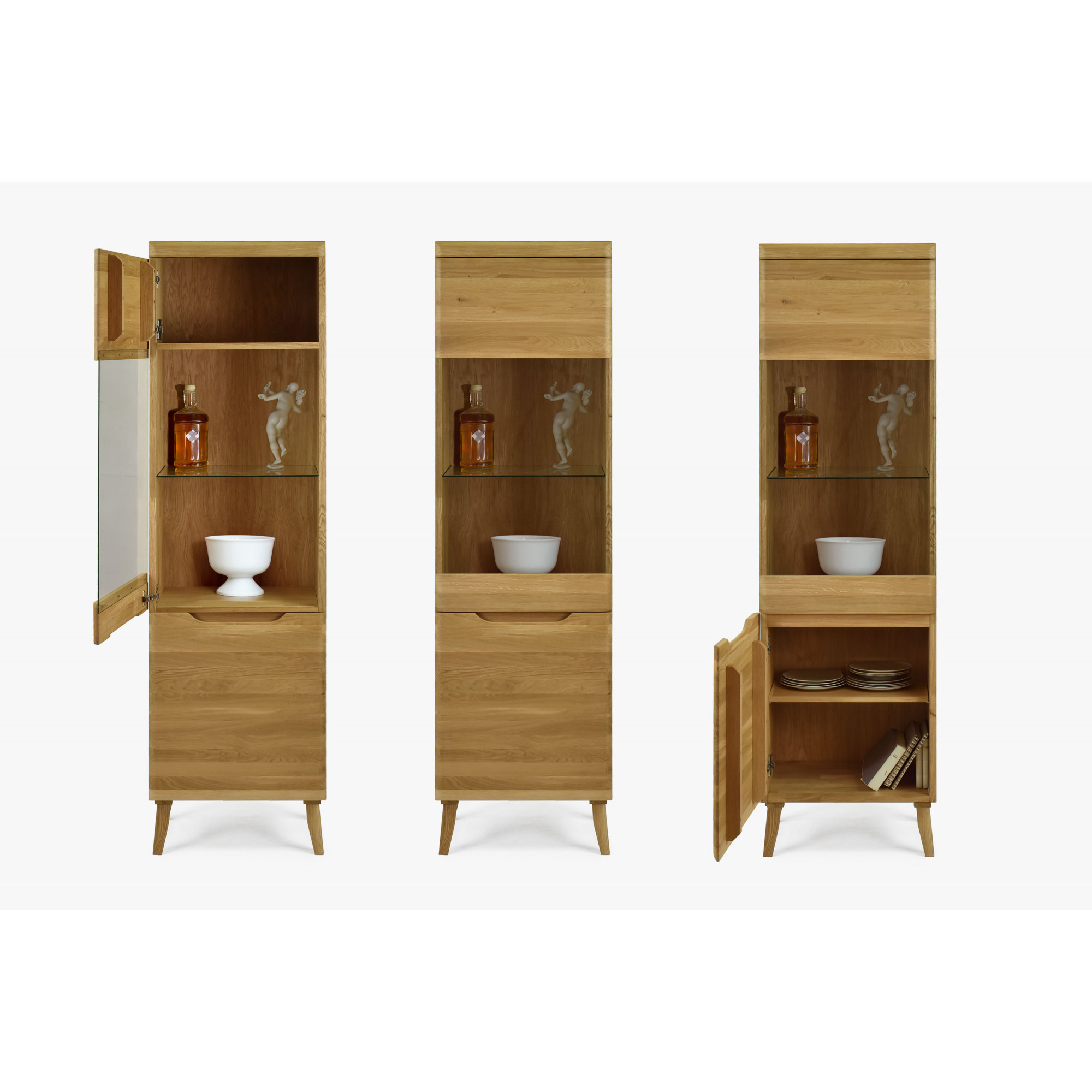 Magas tölgyfa vitrin Praha lábakon – masszív skandináv design 53 x 197 cm