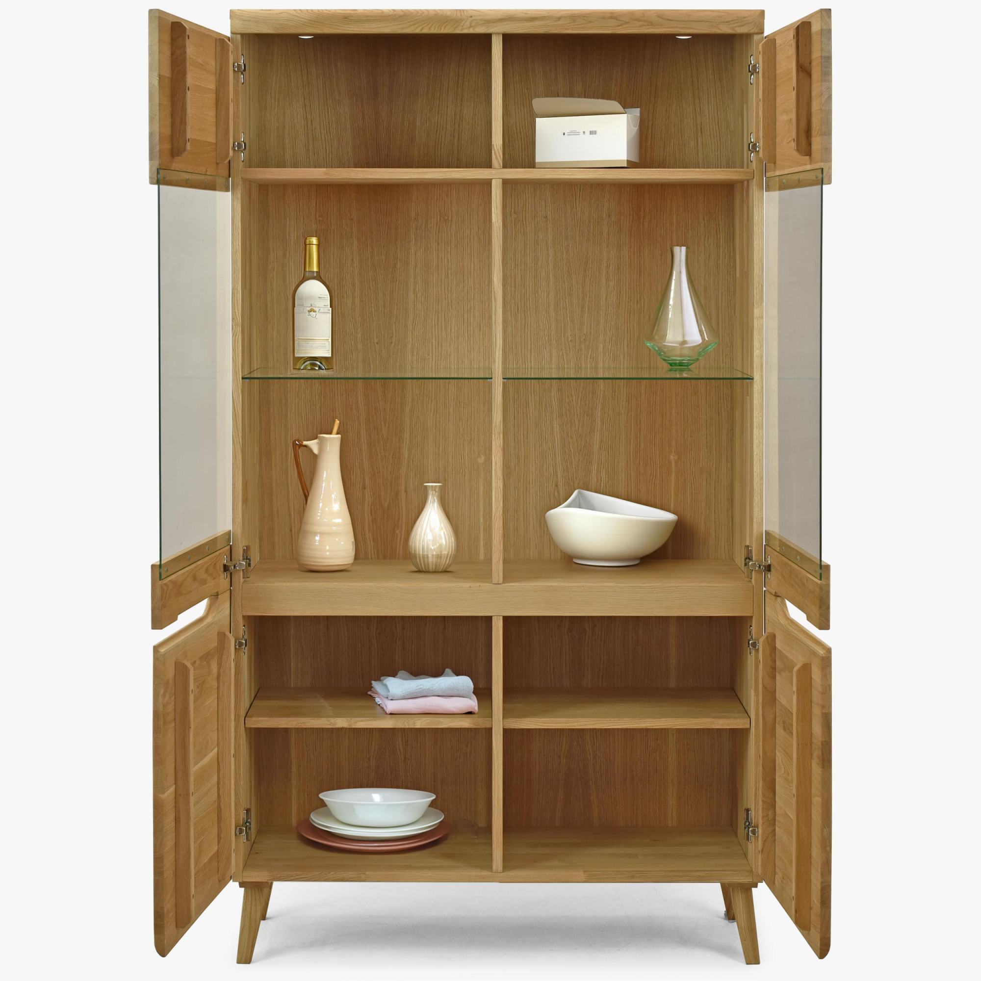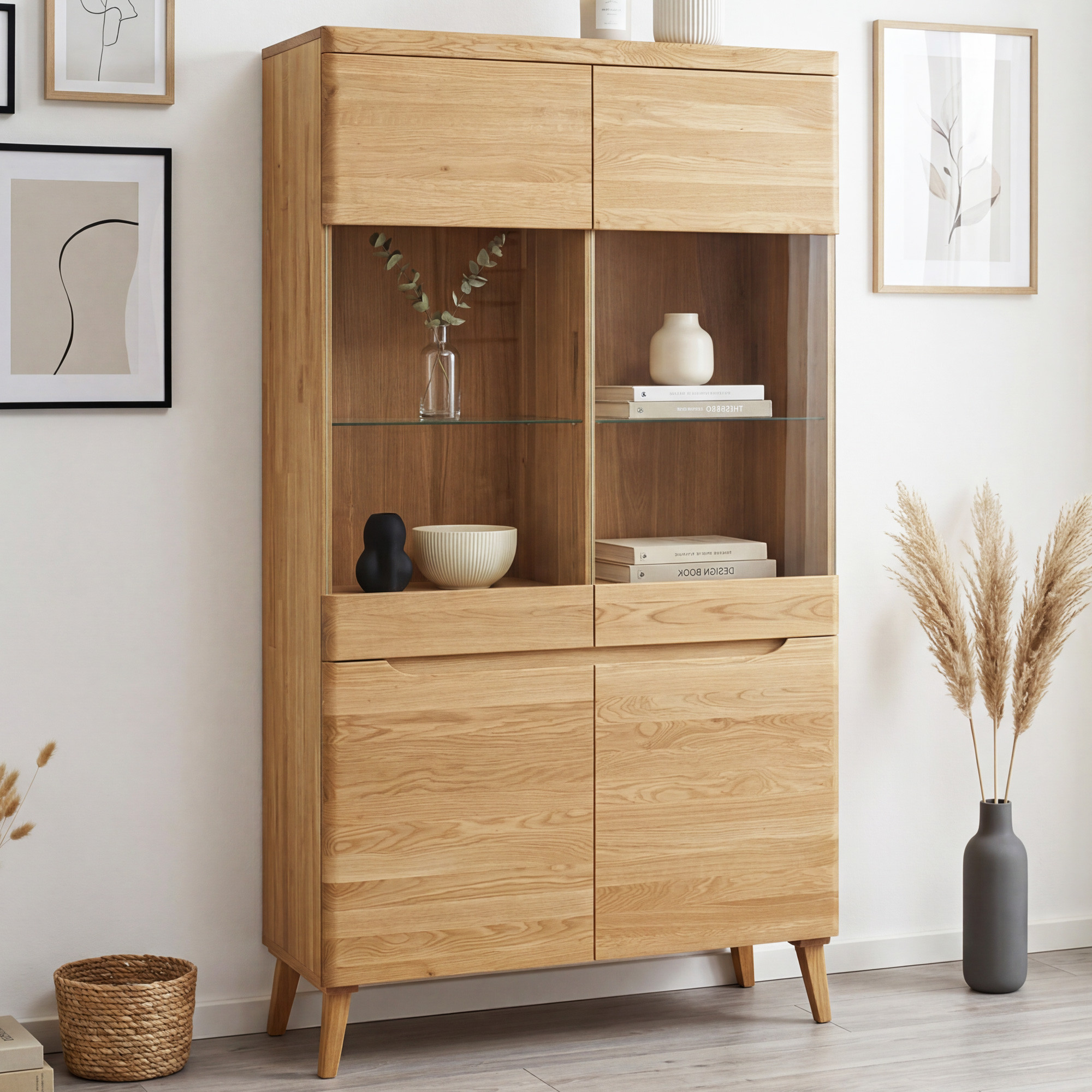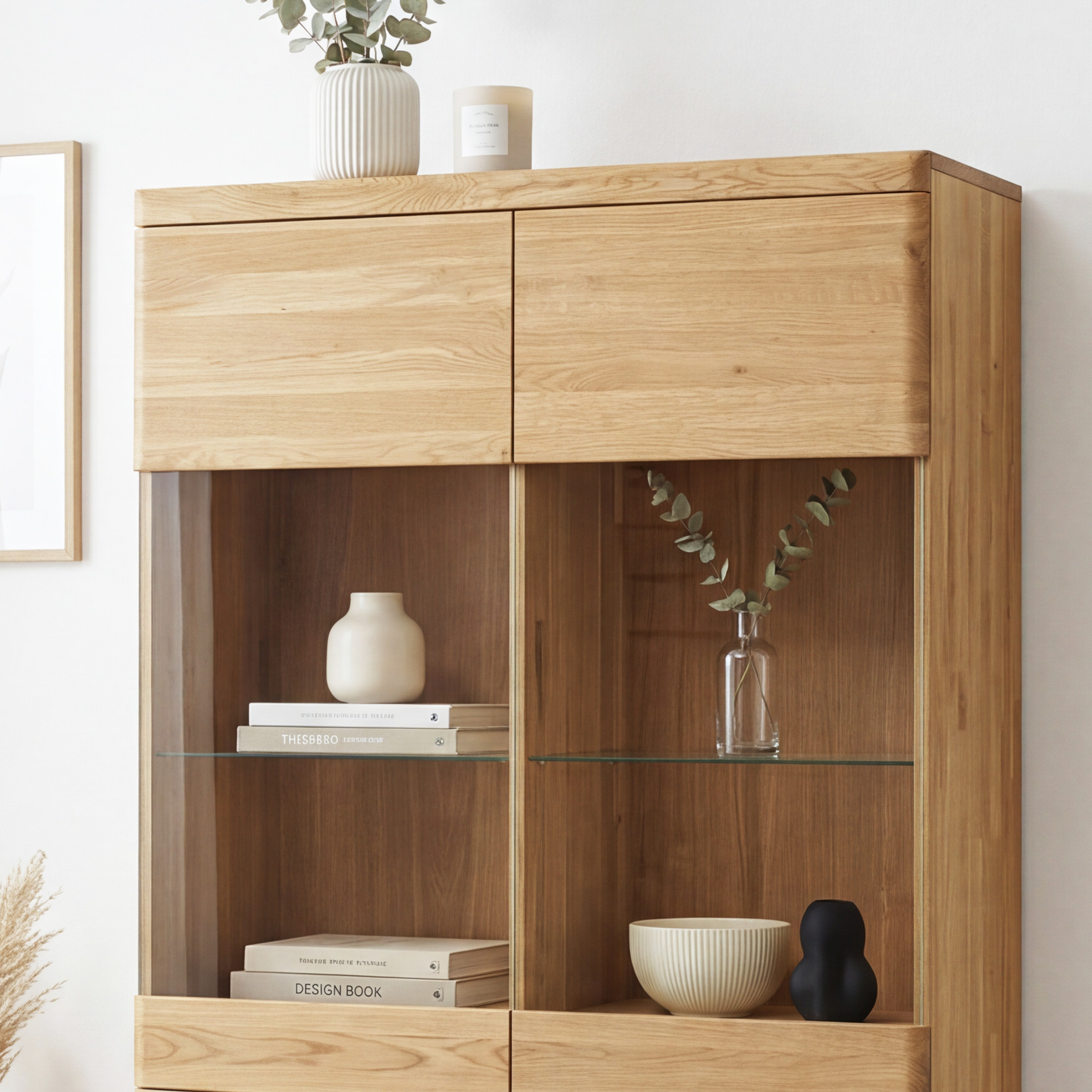 Tömör tölgyfa kétszárnyú vitrin természetes tölgy színben, 107x197 cm