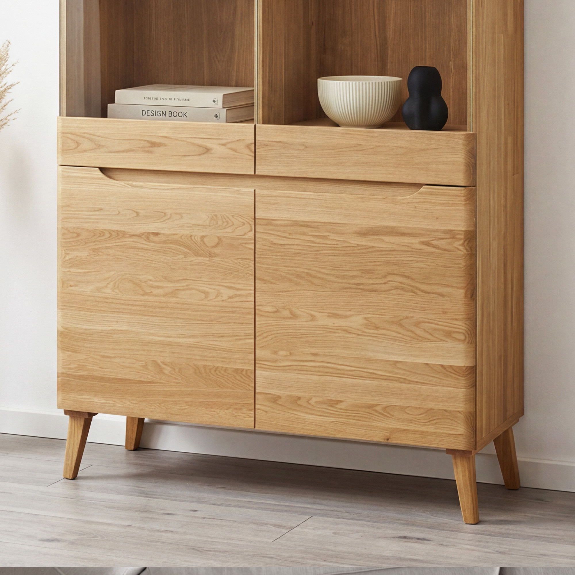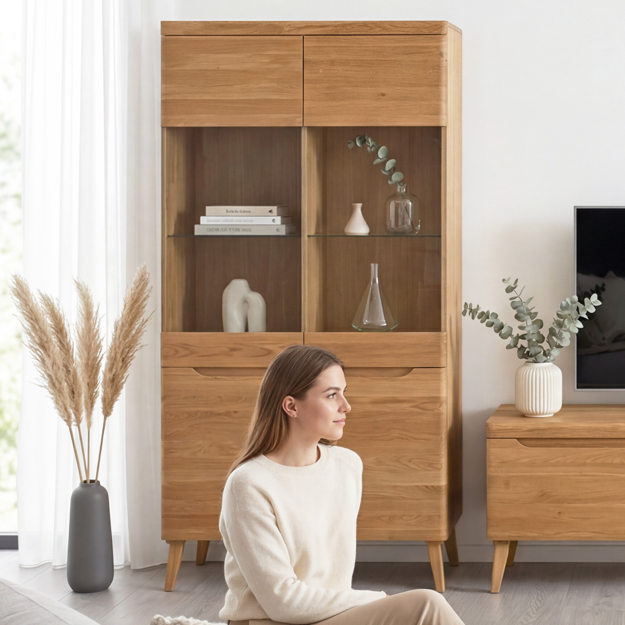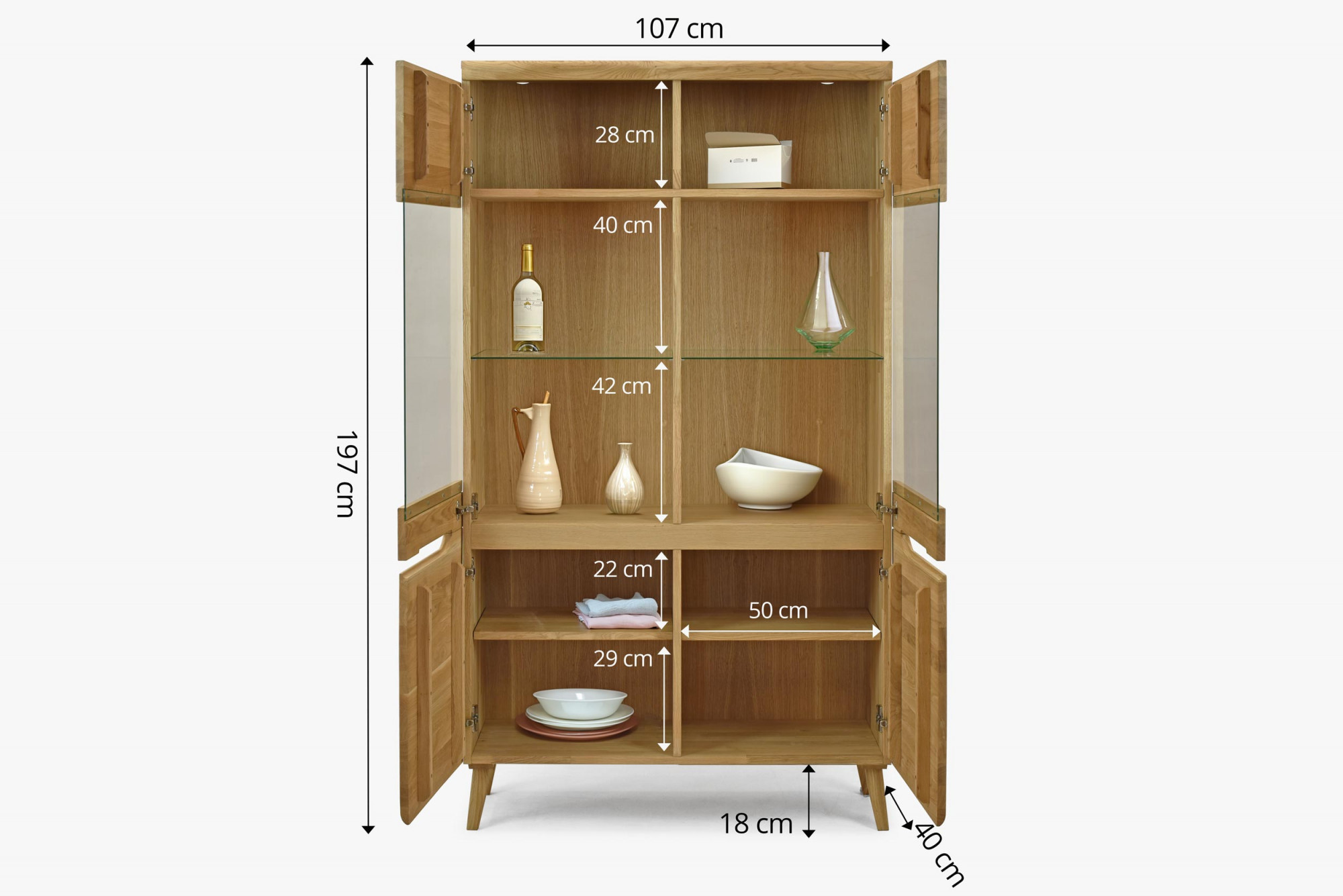 Tölgyfa kétszárnyú vitrin Praha lábakon – masszív skandináv dizájn 107 x 197 cm