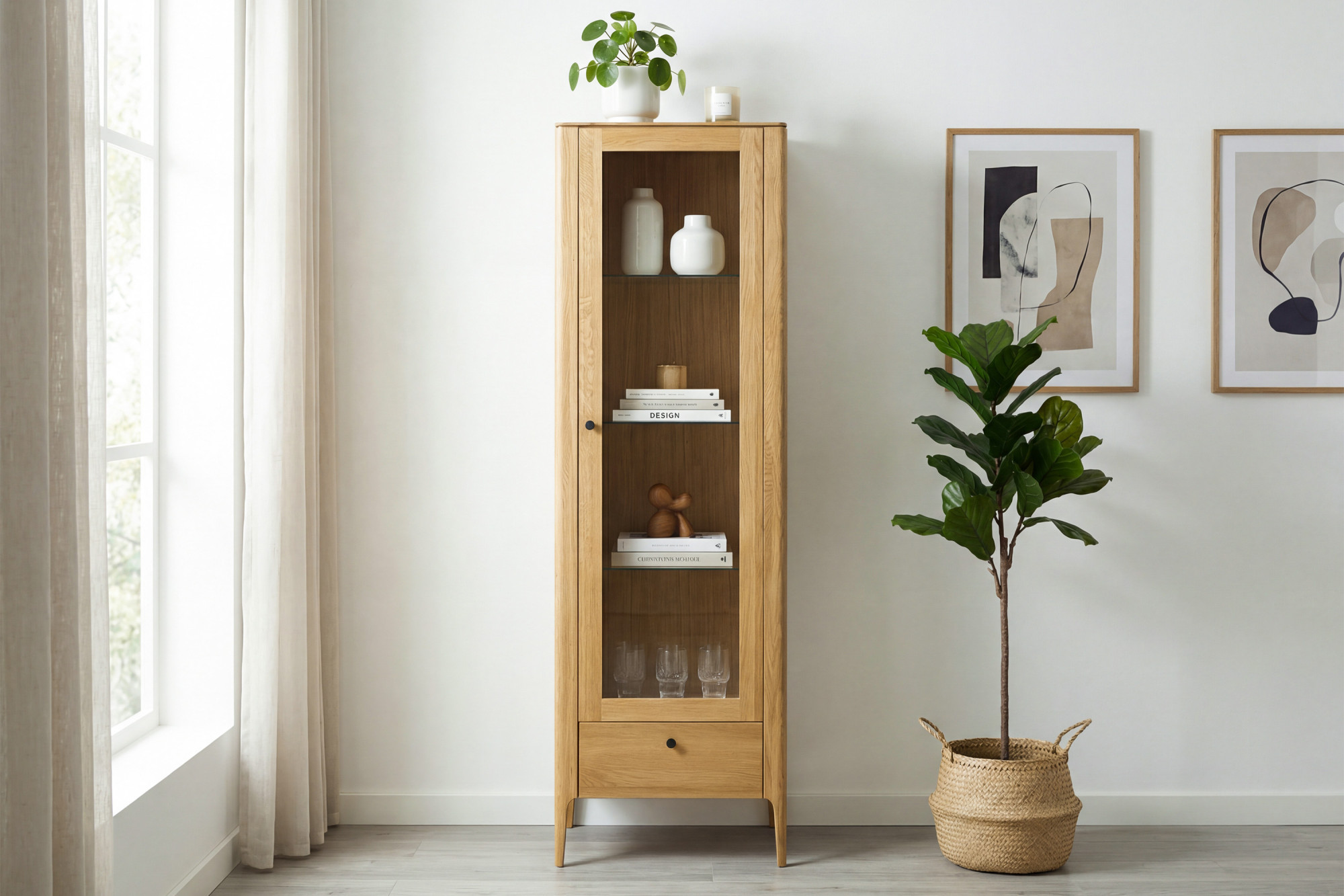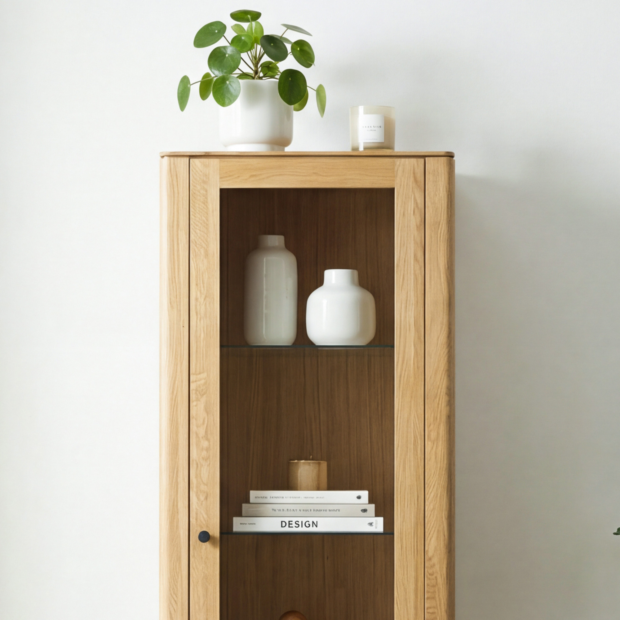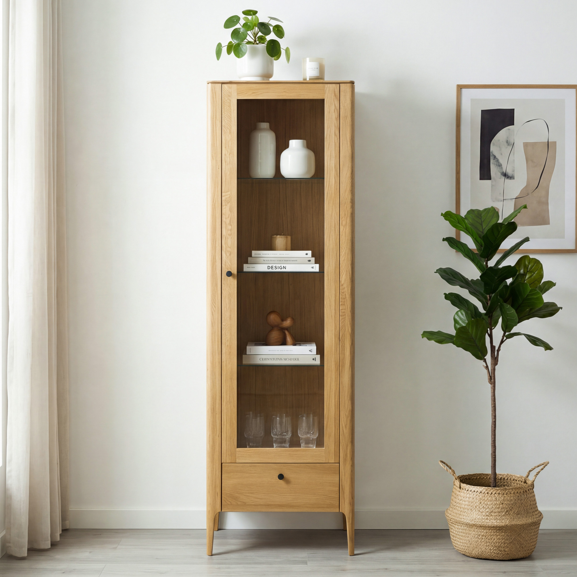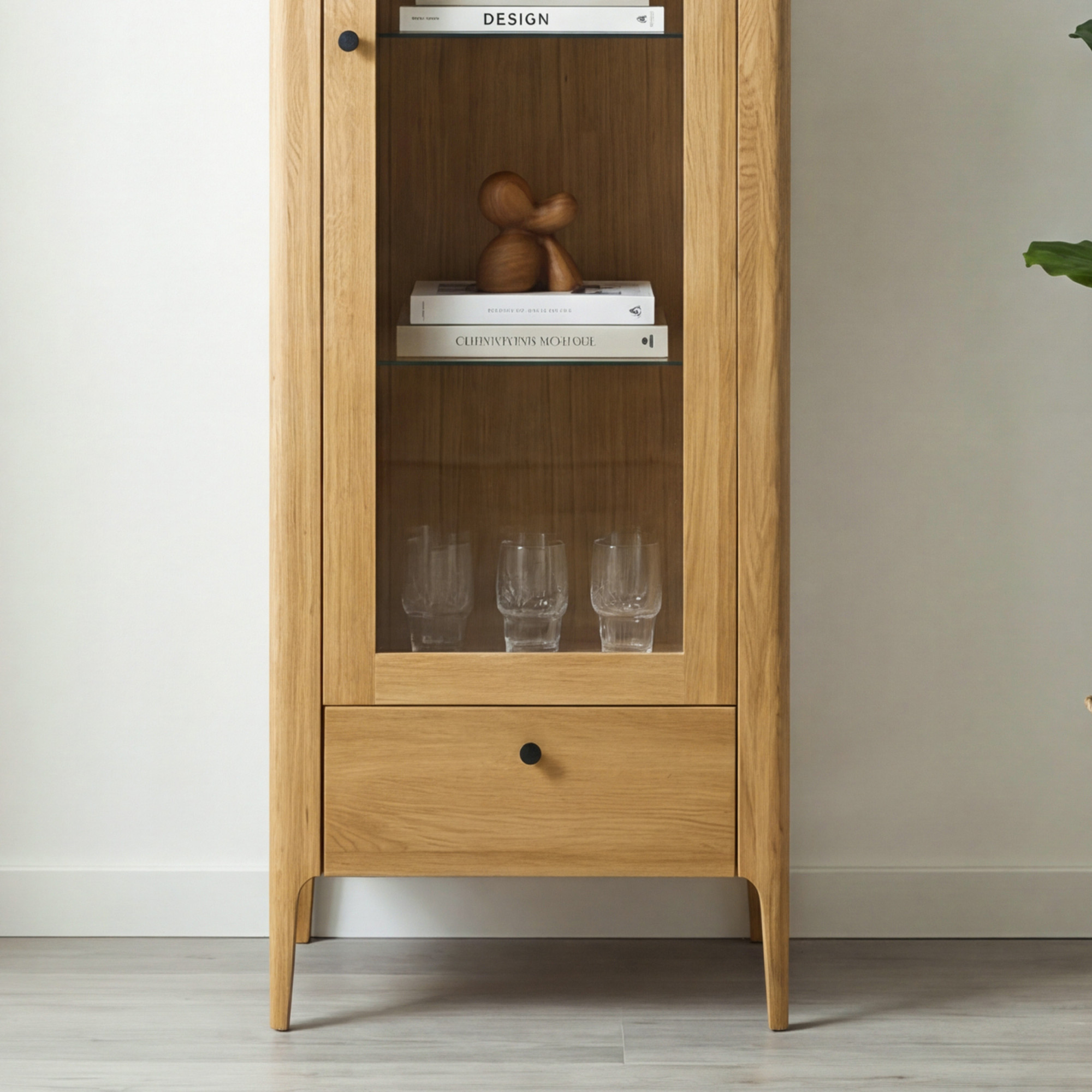 Egyajtós tömör tölgyfa vitrin modern dizájnnal, természetes fa színű