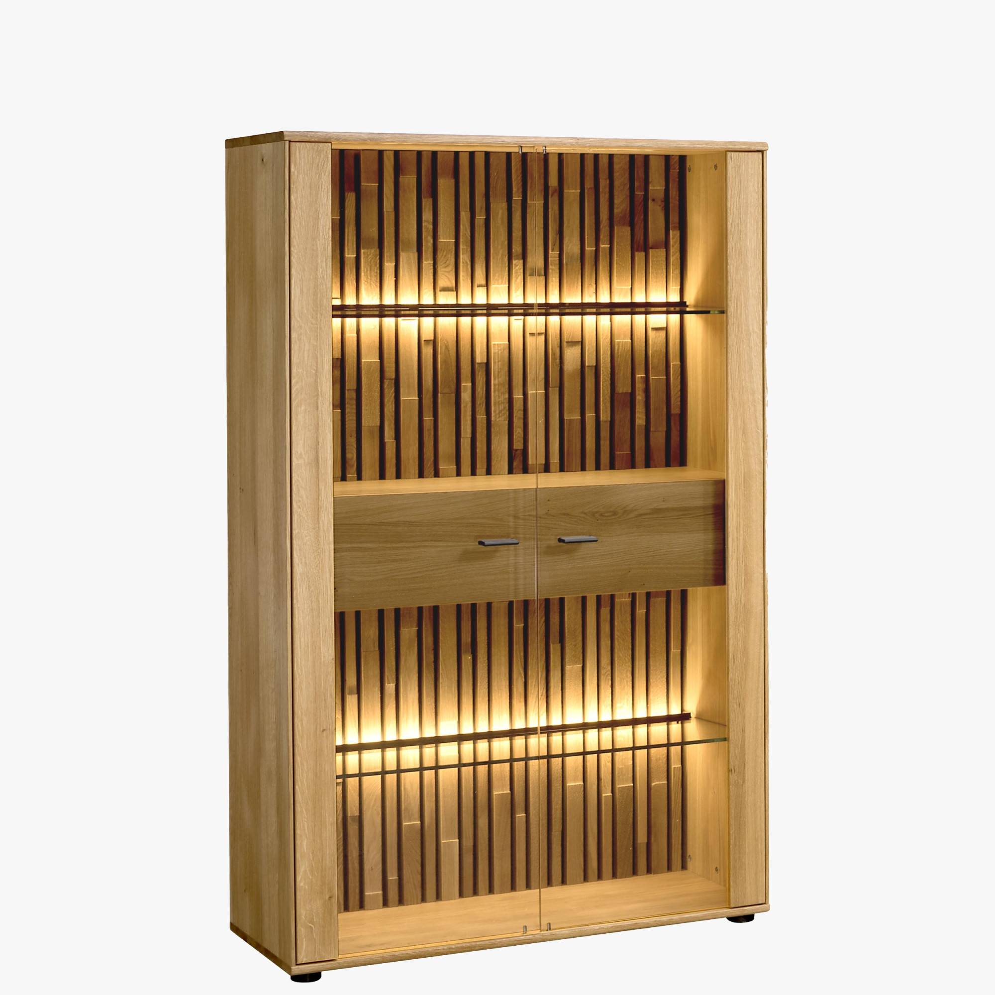 - Anyag: A vitrin elülső részei készülnek kiváló minőségű tömör tölgyből, amelyet keféléssel emeltek ki a fa természetes szerkezetének hangsúlyozására. A vitrin felső és alsó része, valamint a hátlapon található parketta mintázat szintén tömör fából készült. Ezek a parkettalécek különböző magasságúak, ami egyedi és hangsúlyos megjelenést teremt.