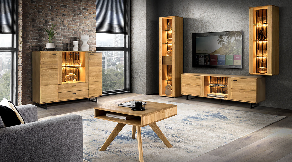 Alacsony vitrin üvegajtókkal nappaliba, tölgyfából