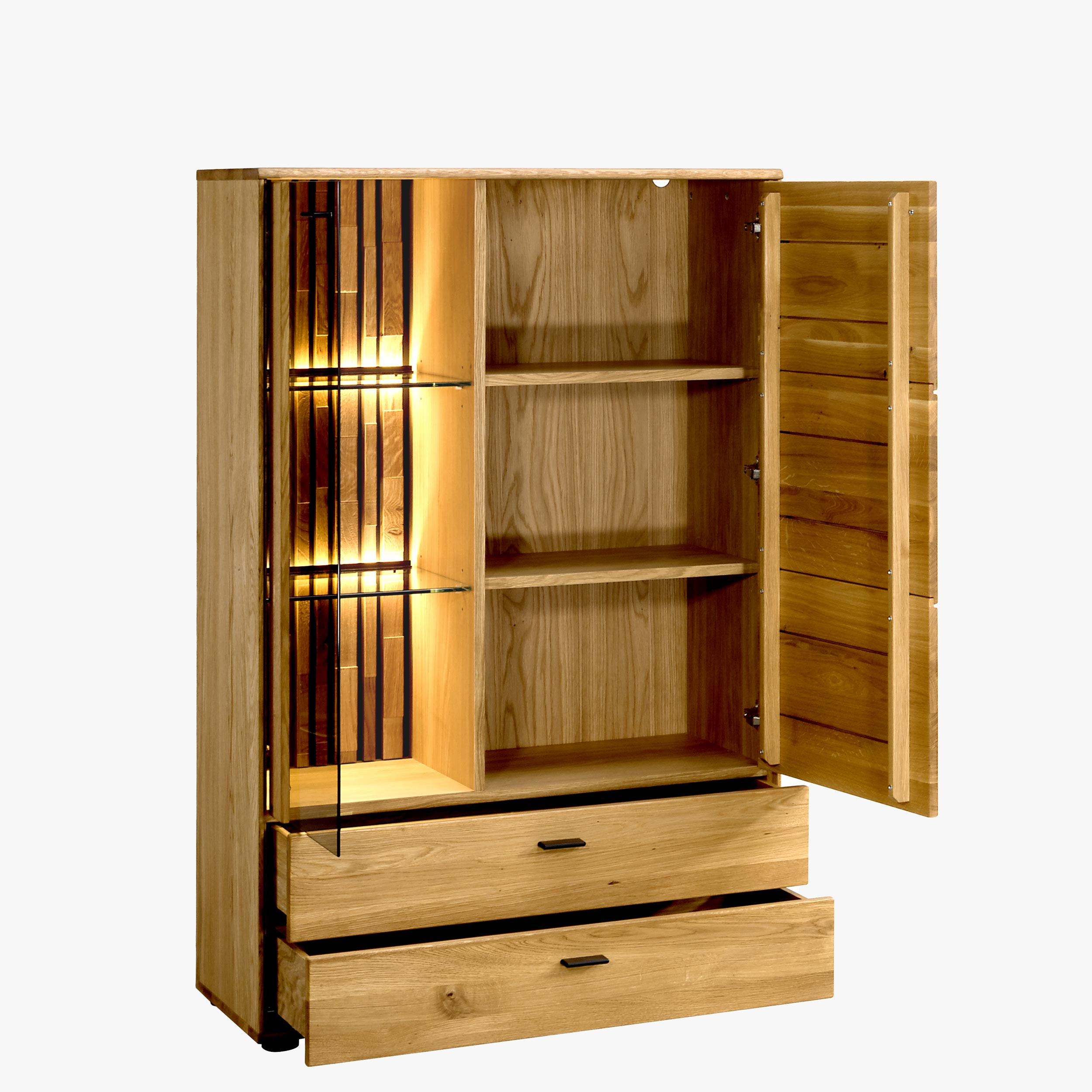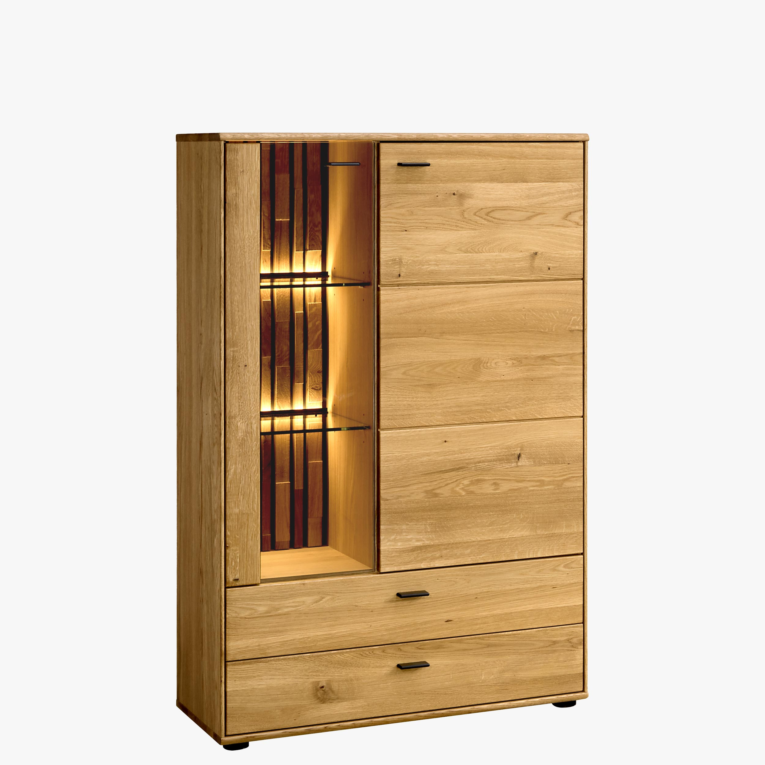 Magas tömör tölgy komód üveggel, modern design, természetes szín