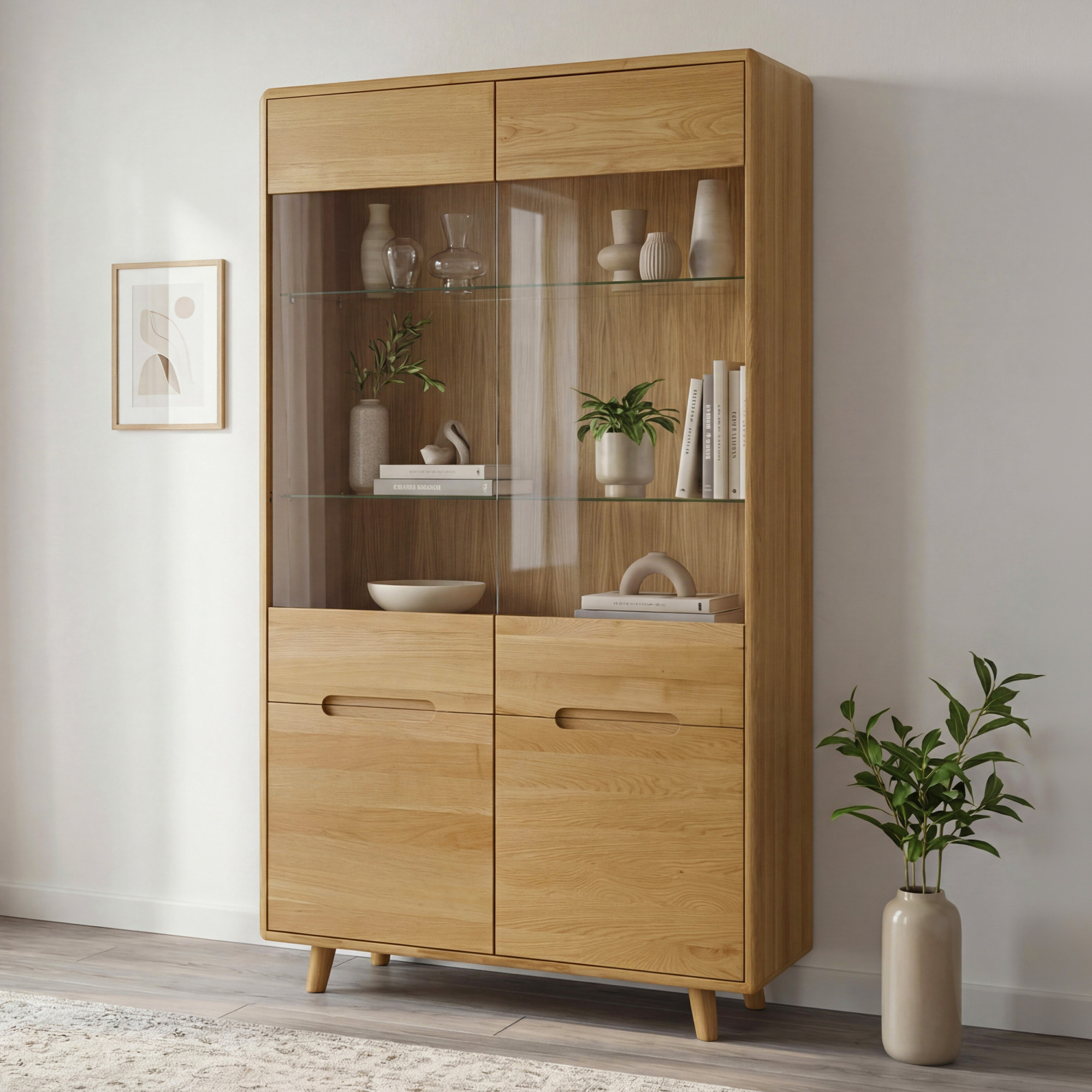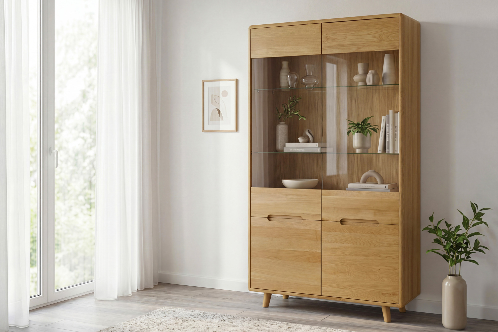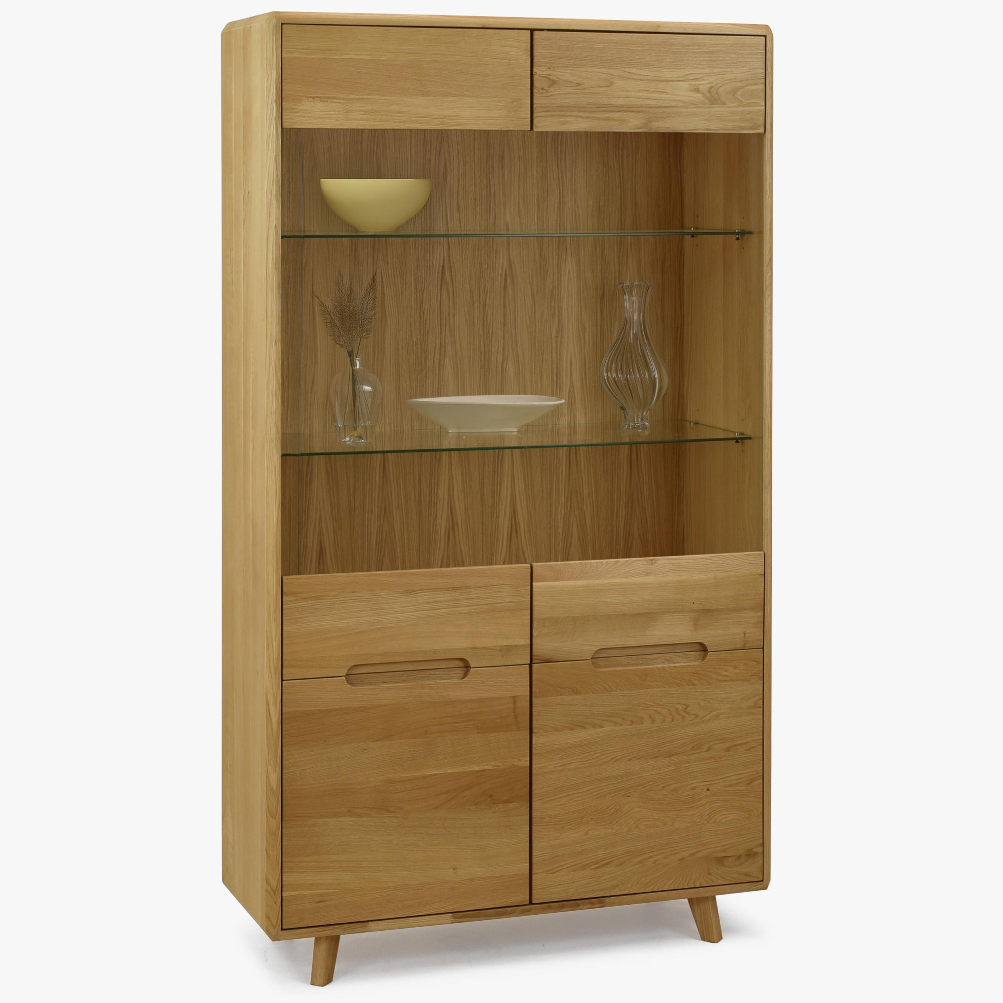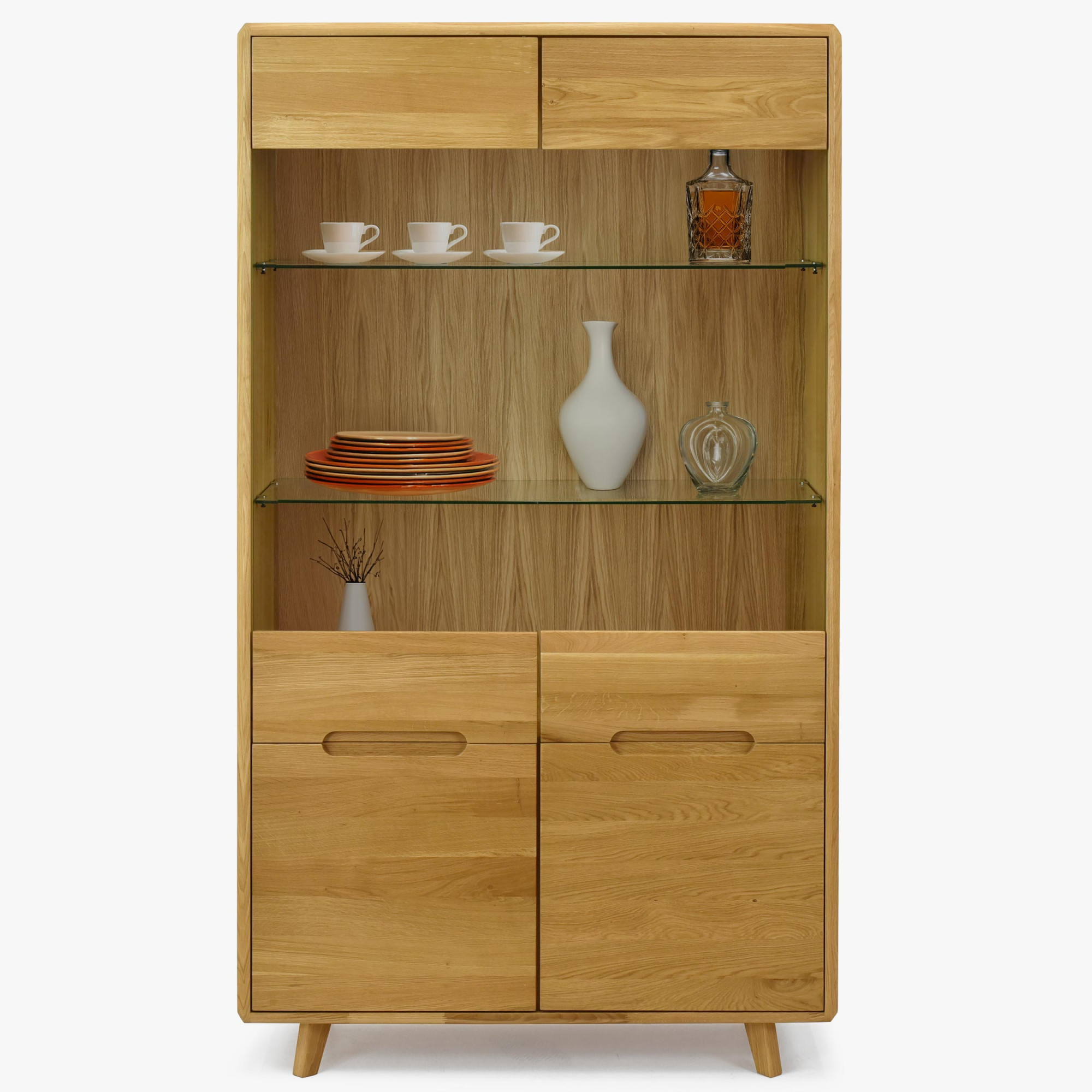 Üveges ajtók a vitrin felső részén lehetővé teszik kedvenc díszeinek, tányérjainak vagy könyveinek elegáns bemutatását. Az üveg mögött két üvegpolc található, amelyeket három különböző magasságba lehet állítani, így rugalmasságot biztosítanak a tárolt tárgyak rendszerezésében. A vitrin ötvözi az esztétikát és a funkcionalitást – míg a felső rész a díszek bemutatására szolgál, a alsó rész praktikus módon fel van osztva négy rekeszre tömör ajtókkal fedve, amelyek elegendő tárolóhelyet biztosítanak azoknak a tárgyaknak, amelyeket kéznél szeretne tudni, de nem szeretne szem előtt tartani.