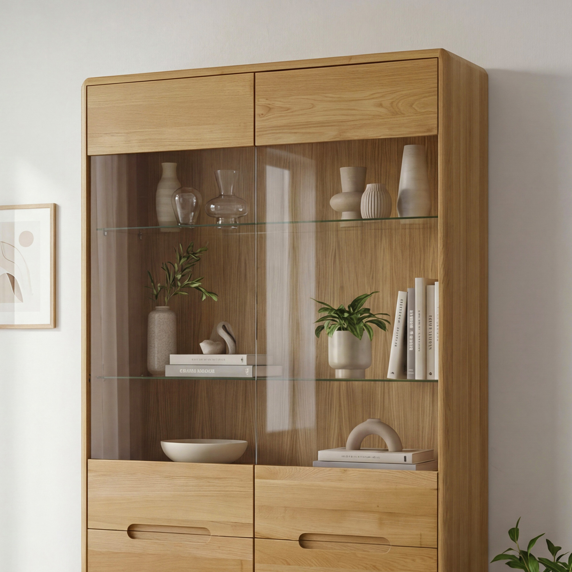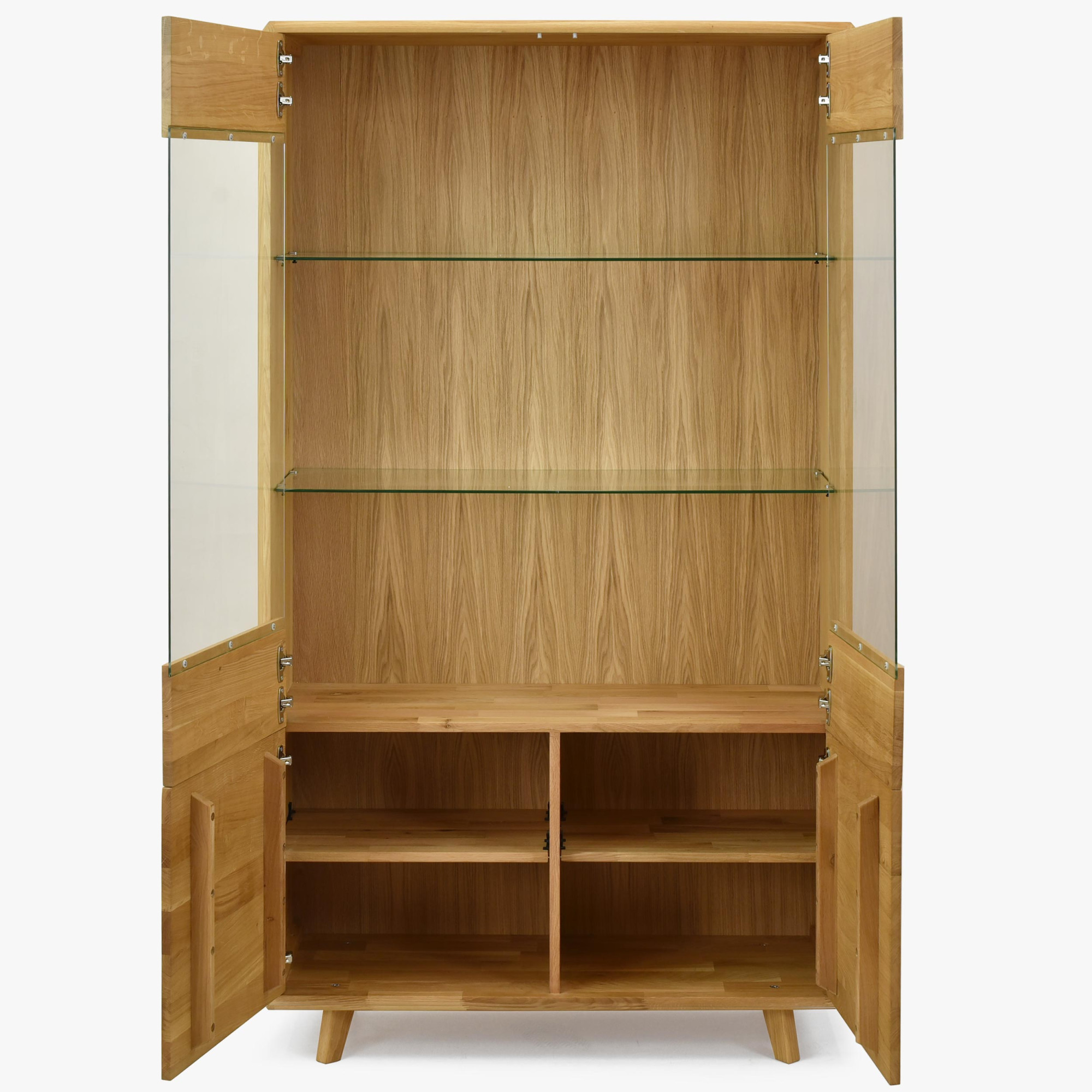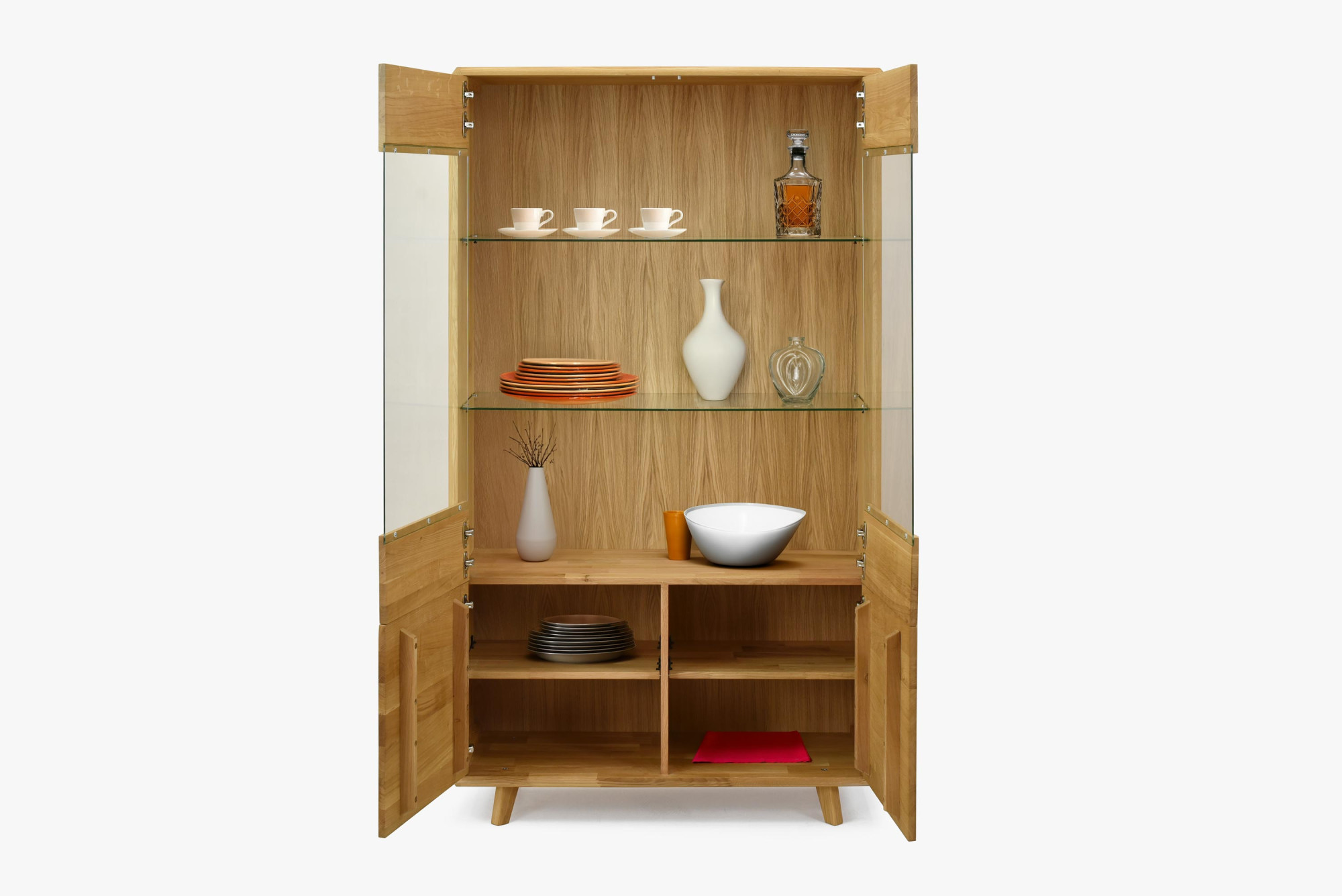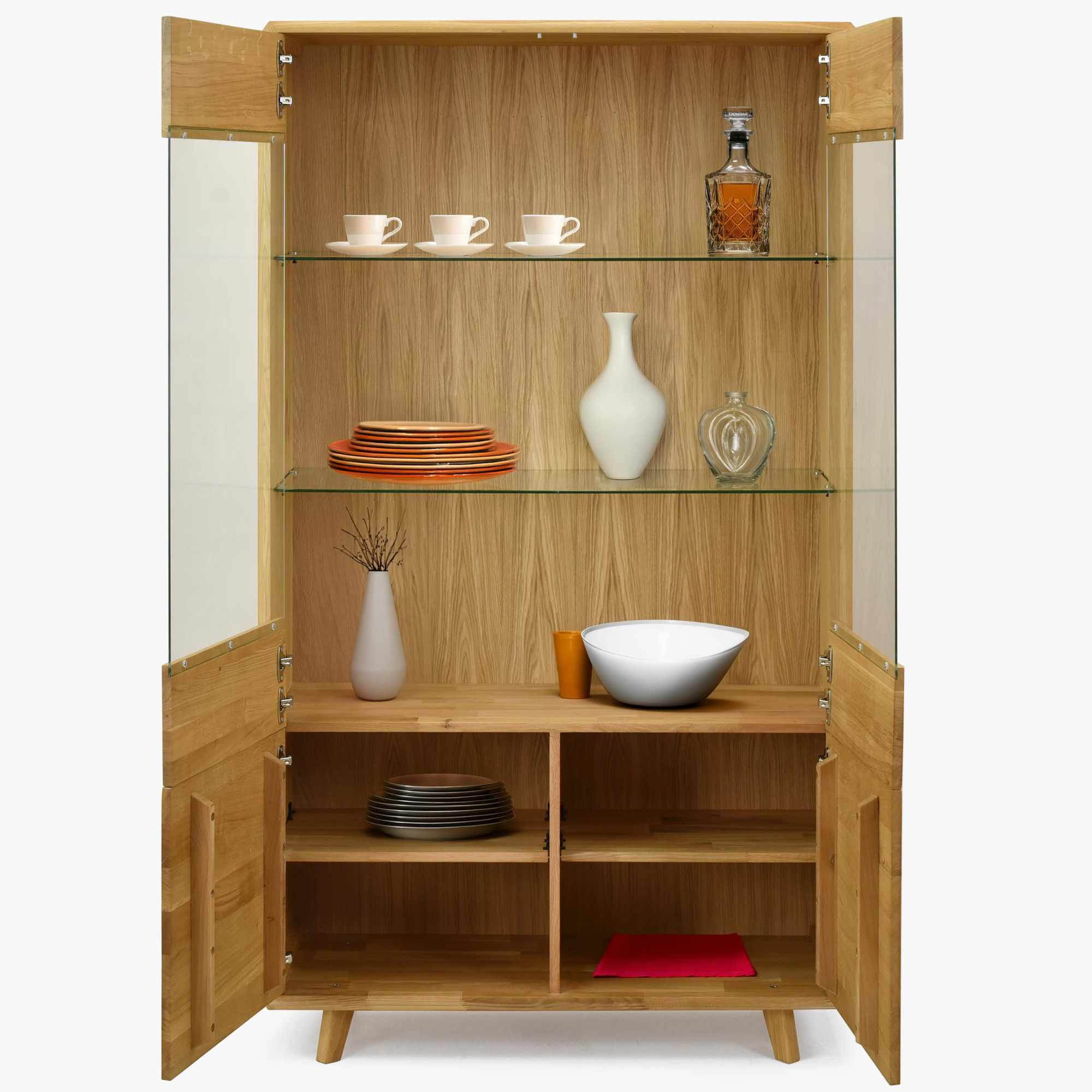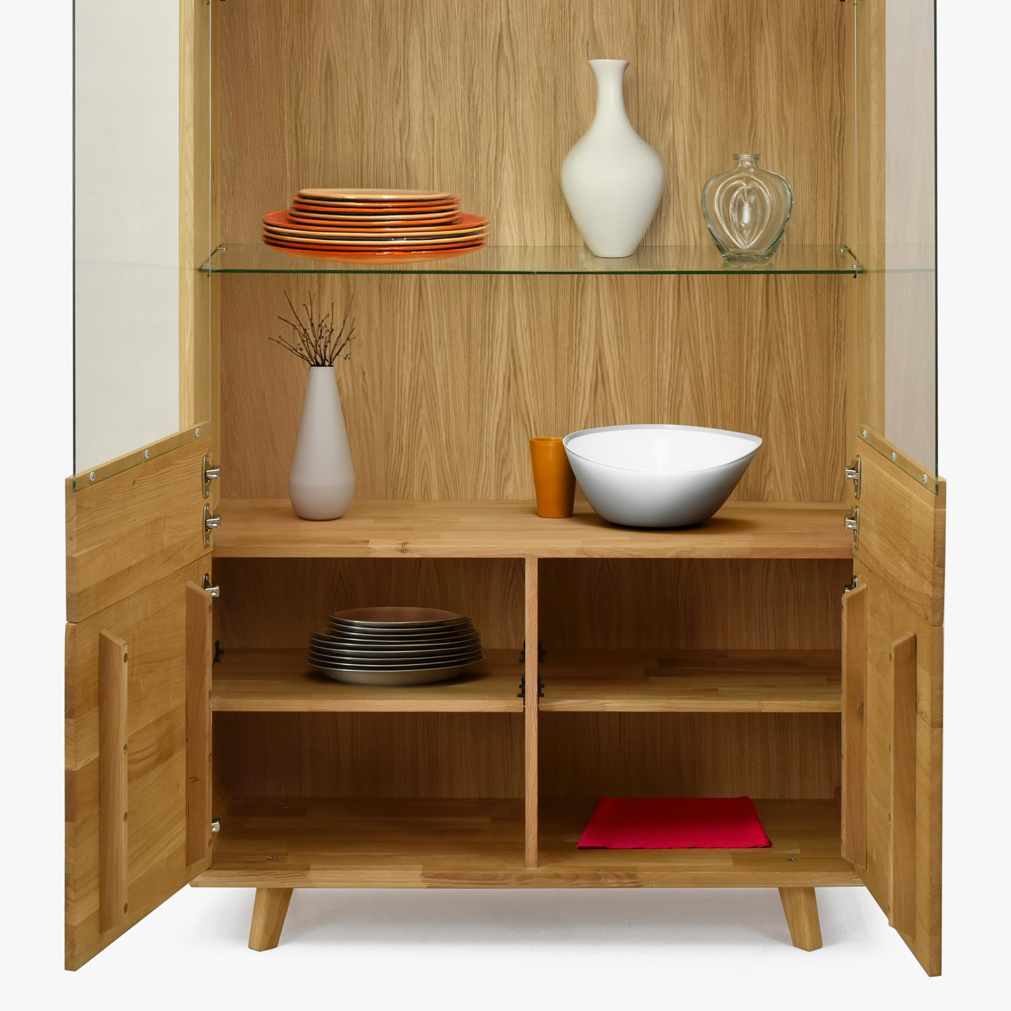 - Négy rekesz tömör ajtókkal – a vitrin alsó része elegendő tárolóhelyet biztosít azoknak a dolgoknak, amelyeket nem szeretne szem előtt tartani.