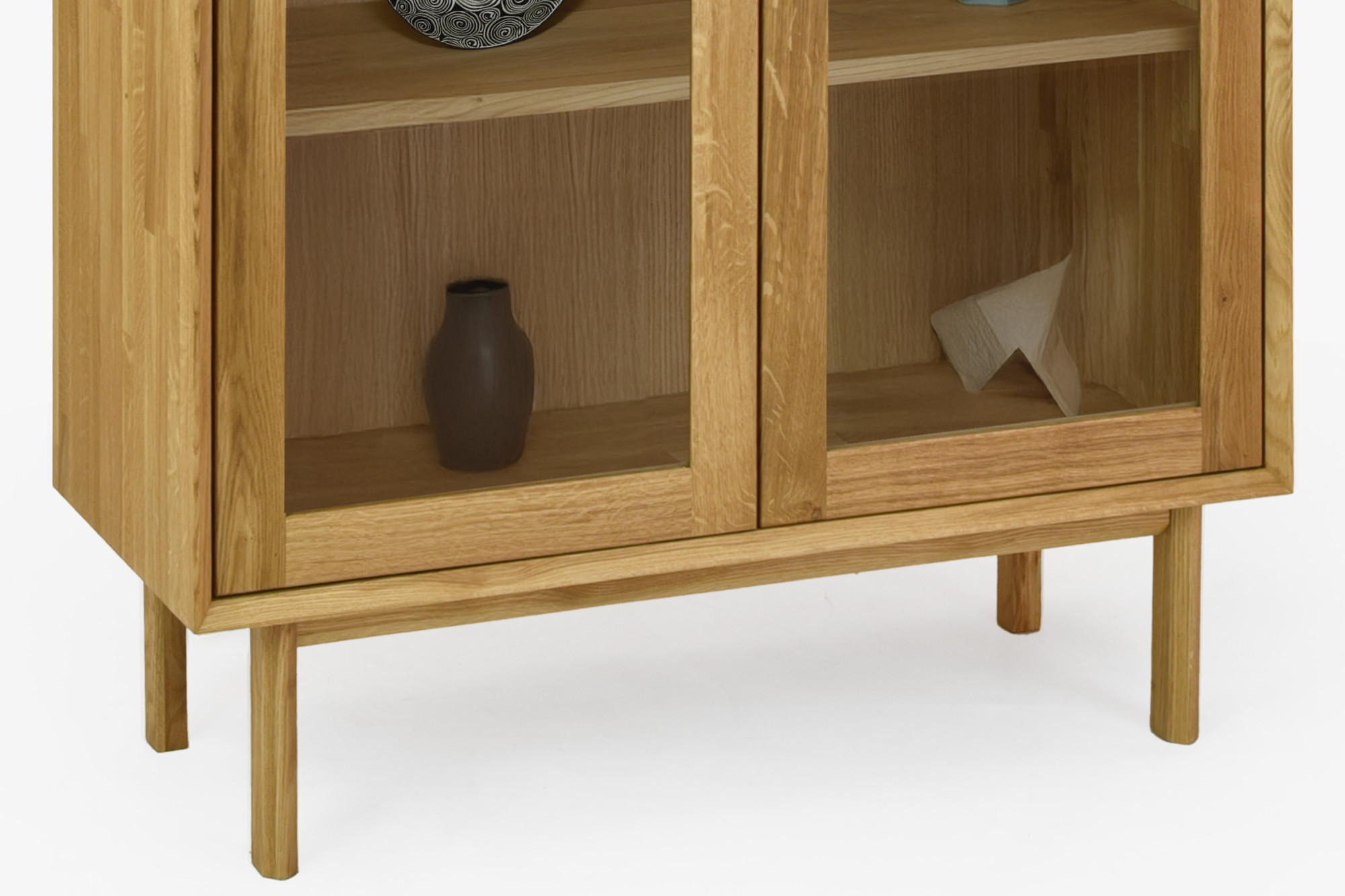 Ez a modell az Oslo II kollekció része, amely ötvözi a modern skandináv stílust kiváló mesteri kidolgozással. Az elegáns lábak könnyed megjelenést kölcsönöznek és megkönnyítik a bútor alatti takarítást. Az ajtók tip-on nyitórendszerrel vannak ellátva: elég enyhén megnyomni és a mechanizmus automatikusan kinyitja azokat. Minden felhasznált fa rendelkezik FSC tanúsítvánnyal, amely garantálja környezetbarát és felelős eredetét. A vitrin teljesen összeszerelten érkezik, és remekül kombinálható más tölgybútorokkal, így könnyen harmonikus enteriőrt hozhat létre.
