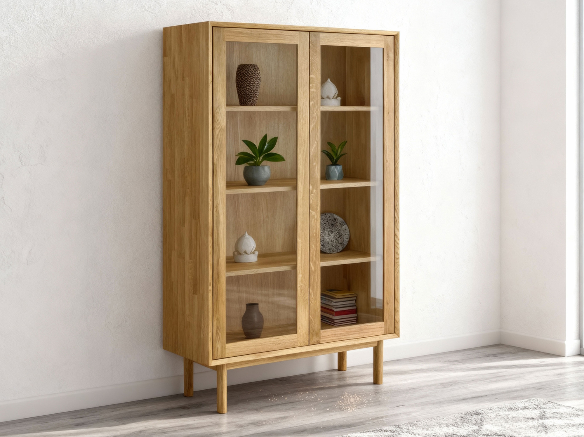 Tömör kétszárnyú vitrin lábakon elegáns és praktikus bútordarab, amely otthonába hozza a természetes fa szépségét és az időtlen dizájnt. Készült tömör tölgyfából, beleértve a vázat, az előlapokat és a belső részeket, ami magas tartósságot és hosszú élettartamot biztosít. A felületet természetes olajjal kezelték, amely kiemeli a fa egyedi erezetét és véd a kopással szemben. A vitrinnek két üvegezett ajtaja van, mögöttük találhatók a három masszív fa polc, amelyek ideálisak porcelán, poharak, díszek vagy gyűjteményi darabok bemutatására.