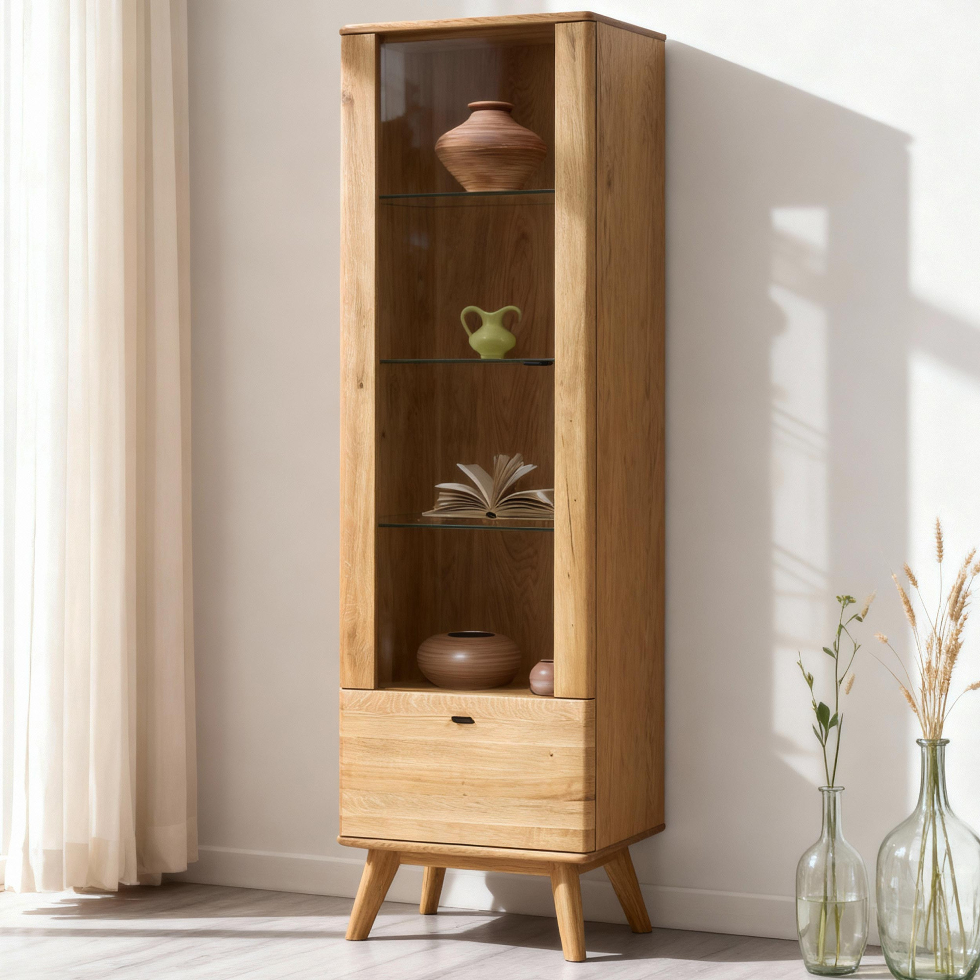 Masszív tölgyfa vitrin lábakkal, természetes tölgy színű ajtós