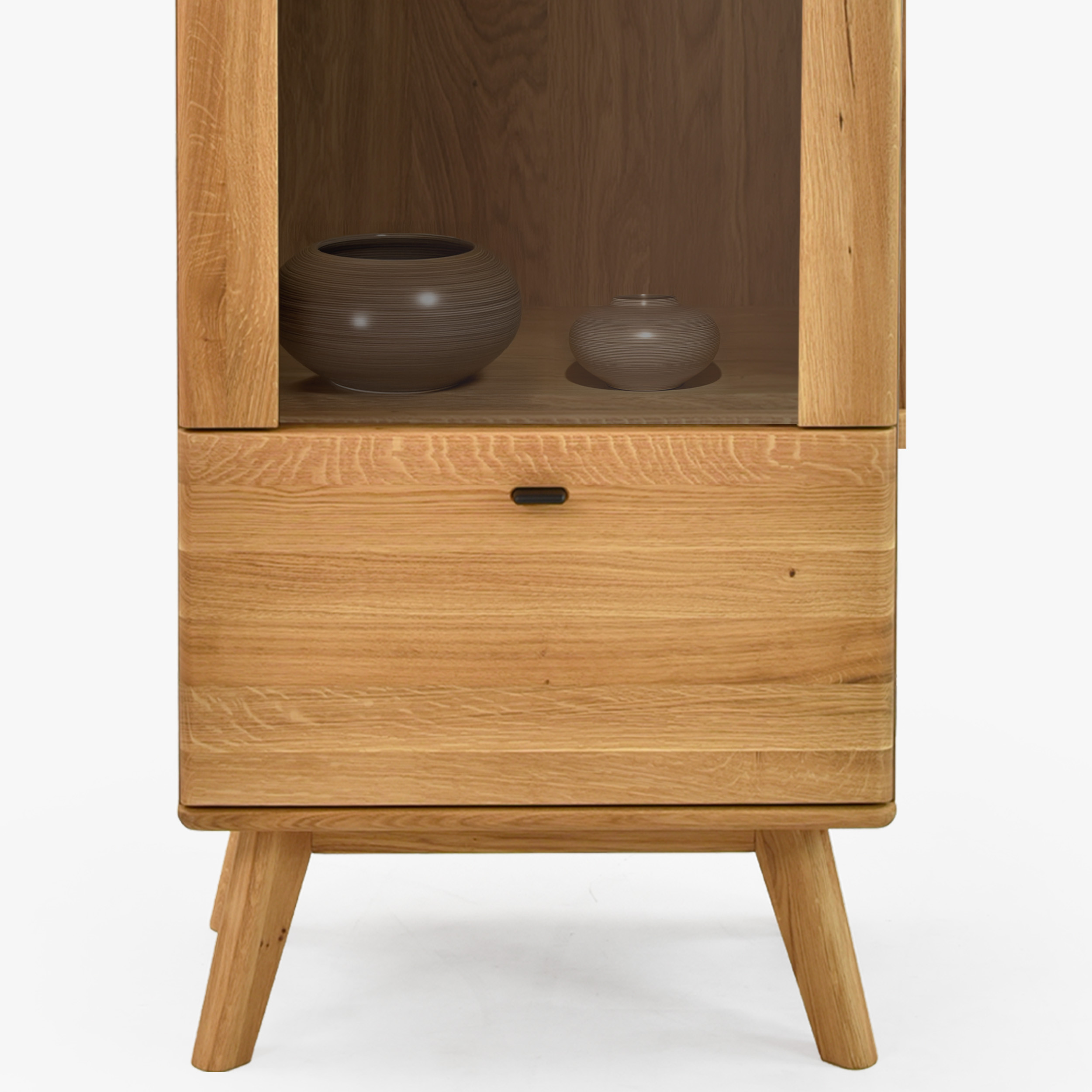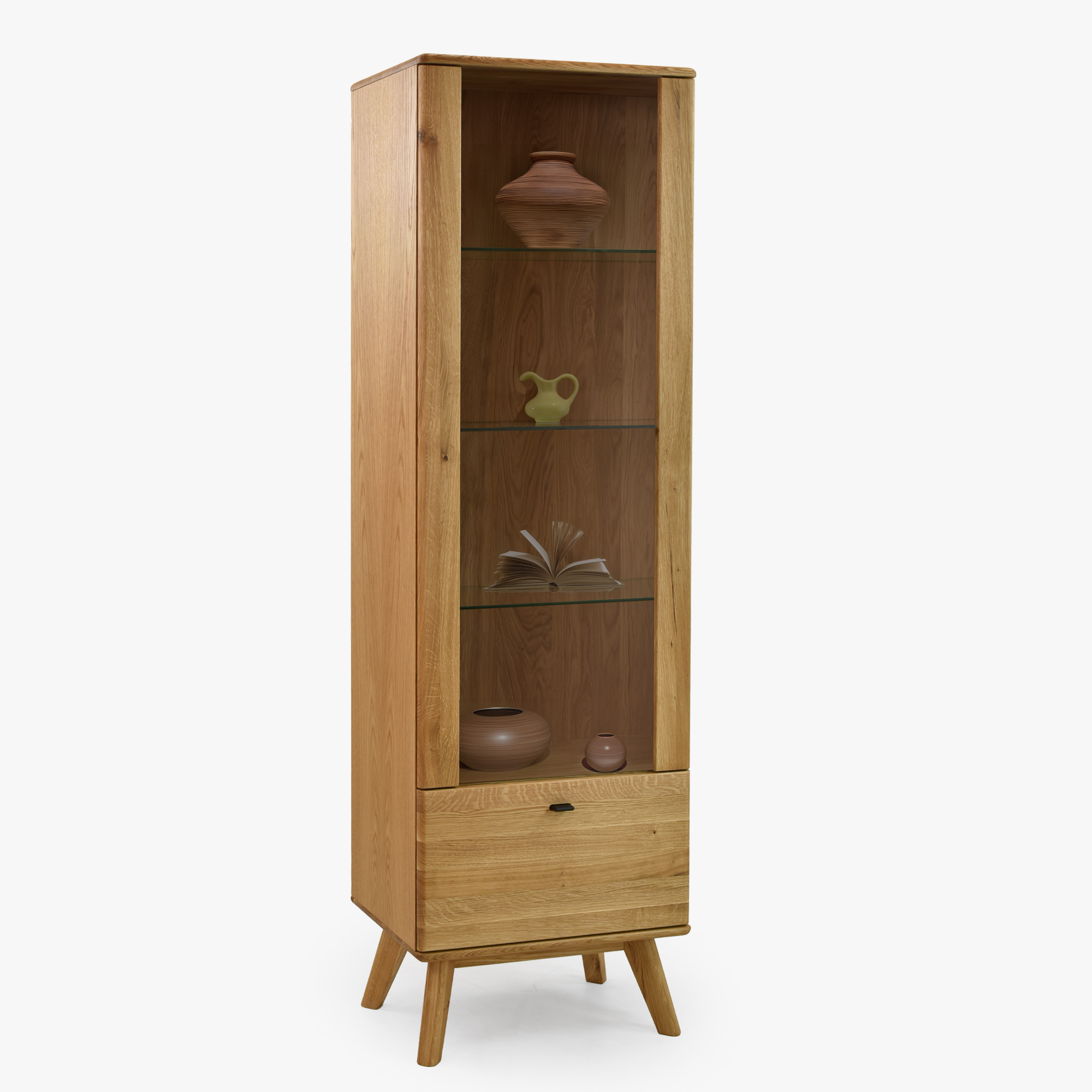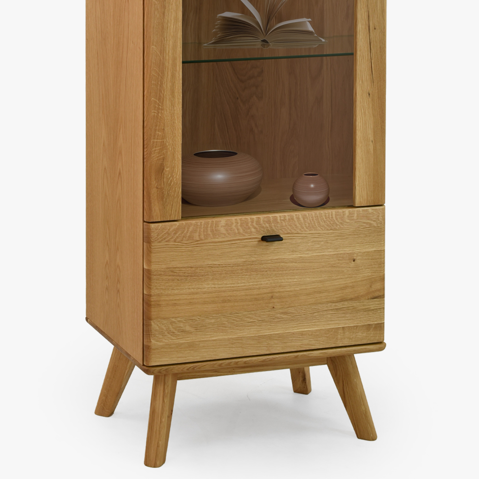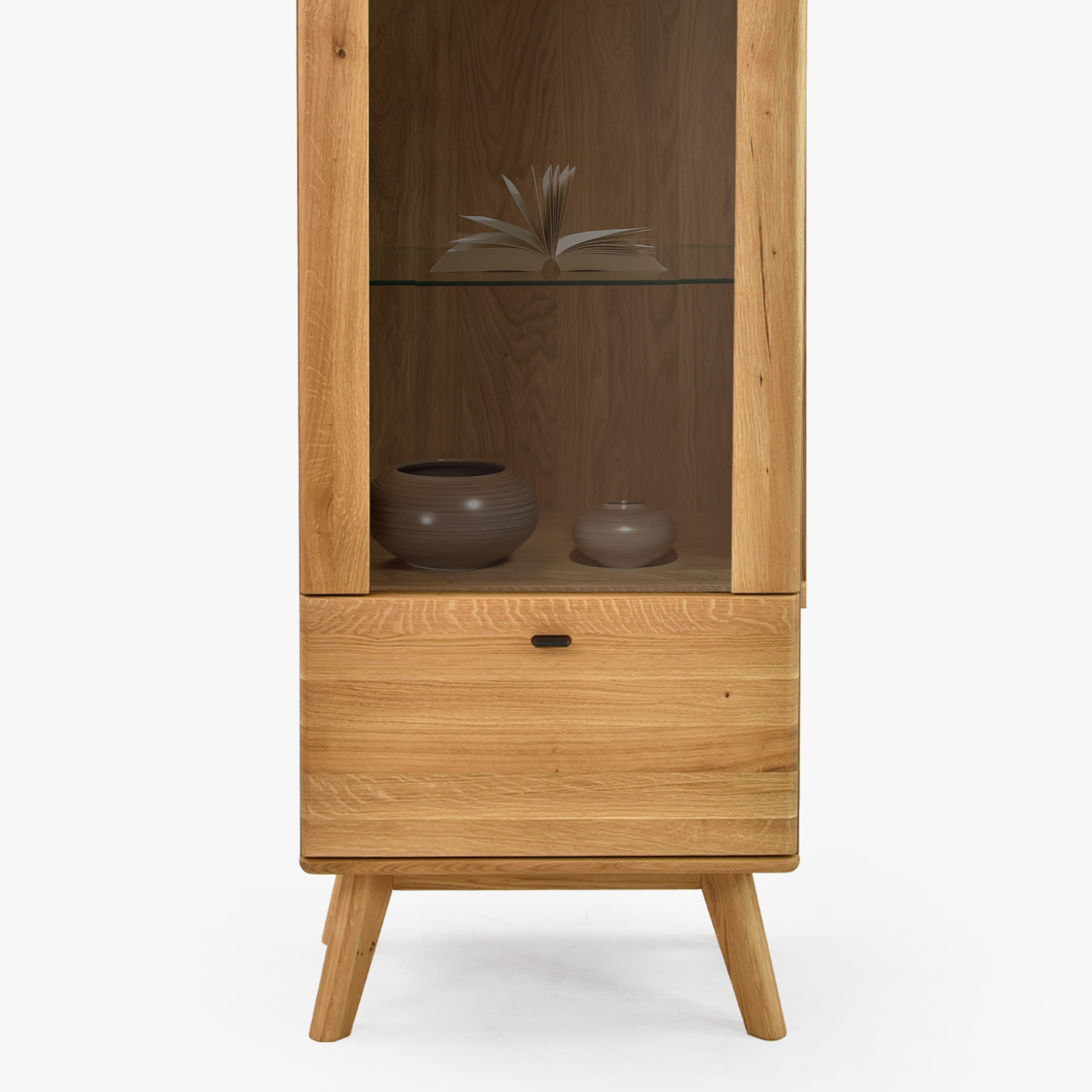 Egyszárnyú tömörfa vitrin lábakon a Jánošík kollekcióból a természetes tölgyfa, a modern dizájn és a precíz kézműves kidolgozás ötvözetét képviseli. Ez a modell ideális választás mindazoknak, akik értékelik a valódi tömörfa minőségét és szeretnének otthonukba egy darabka természetet vinni. A vitrin kombinációban készül tömör tölgyfából (felső lap, frontok, lábak és szerkezeti elemek) és prémium tölgy furnérból (oldalak és váz), ami tökéletes megjelenést és hosszú élettartamot garantál. Alapértelmezés szerint rendelkezik bal oldali pánttal szerelt ajtóval, de az előkészítésnek köszönhetően könnyen át lehet szerelni jobb oldalra. Belsejében található három üvegpolc a díszek, porcelán vagy üveg bemutatására, és az alsó részben egy praktikus fiók az apróságoknak.