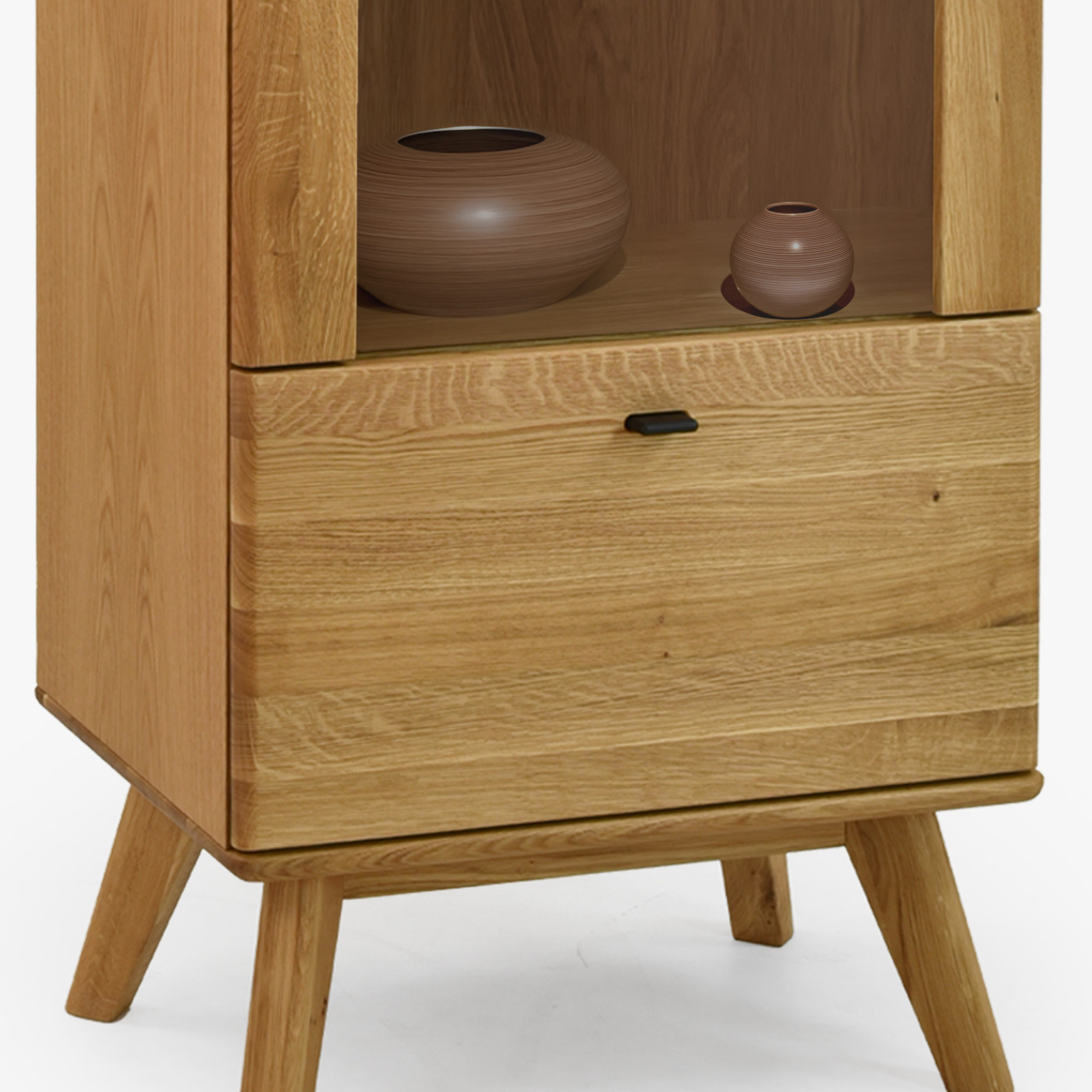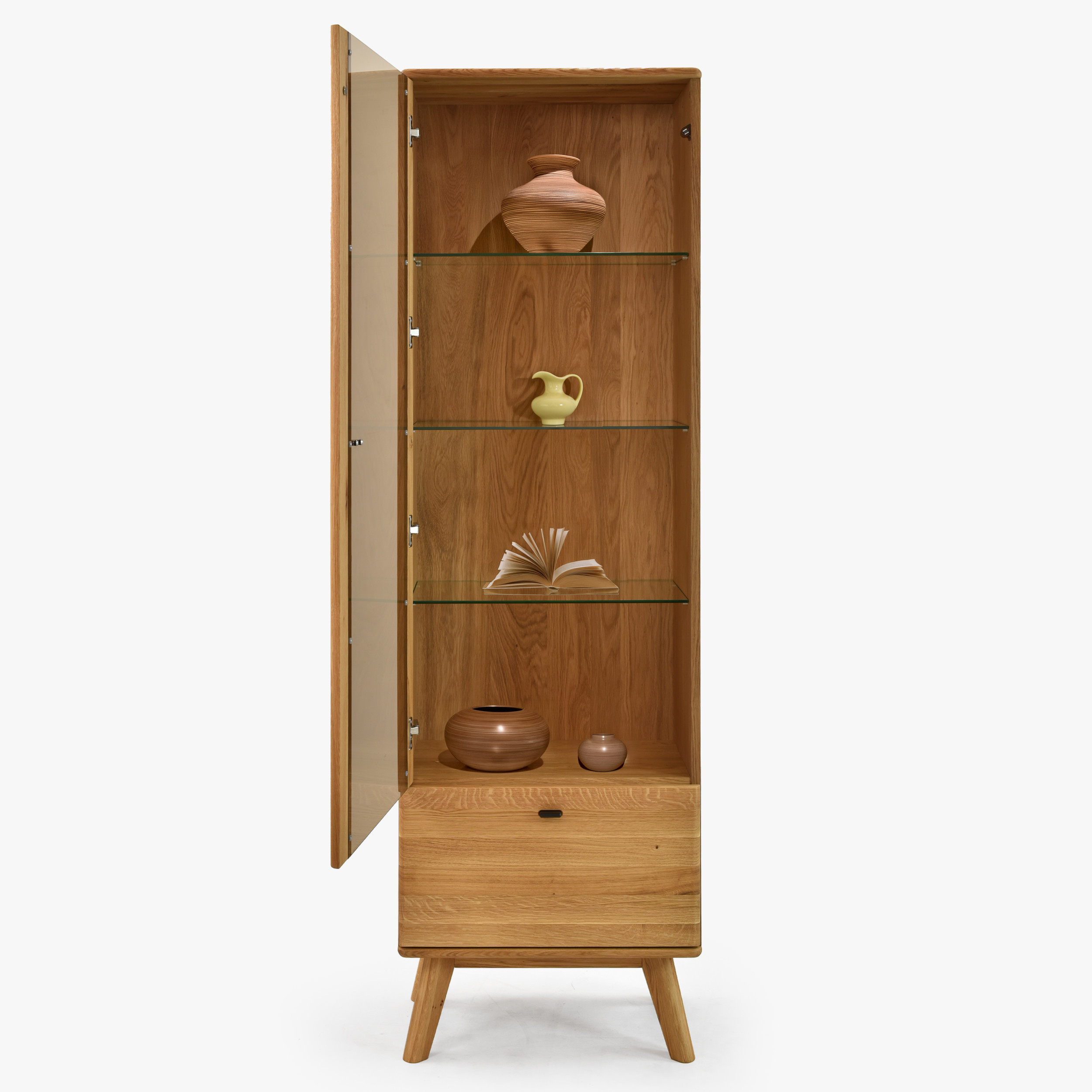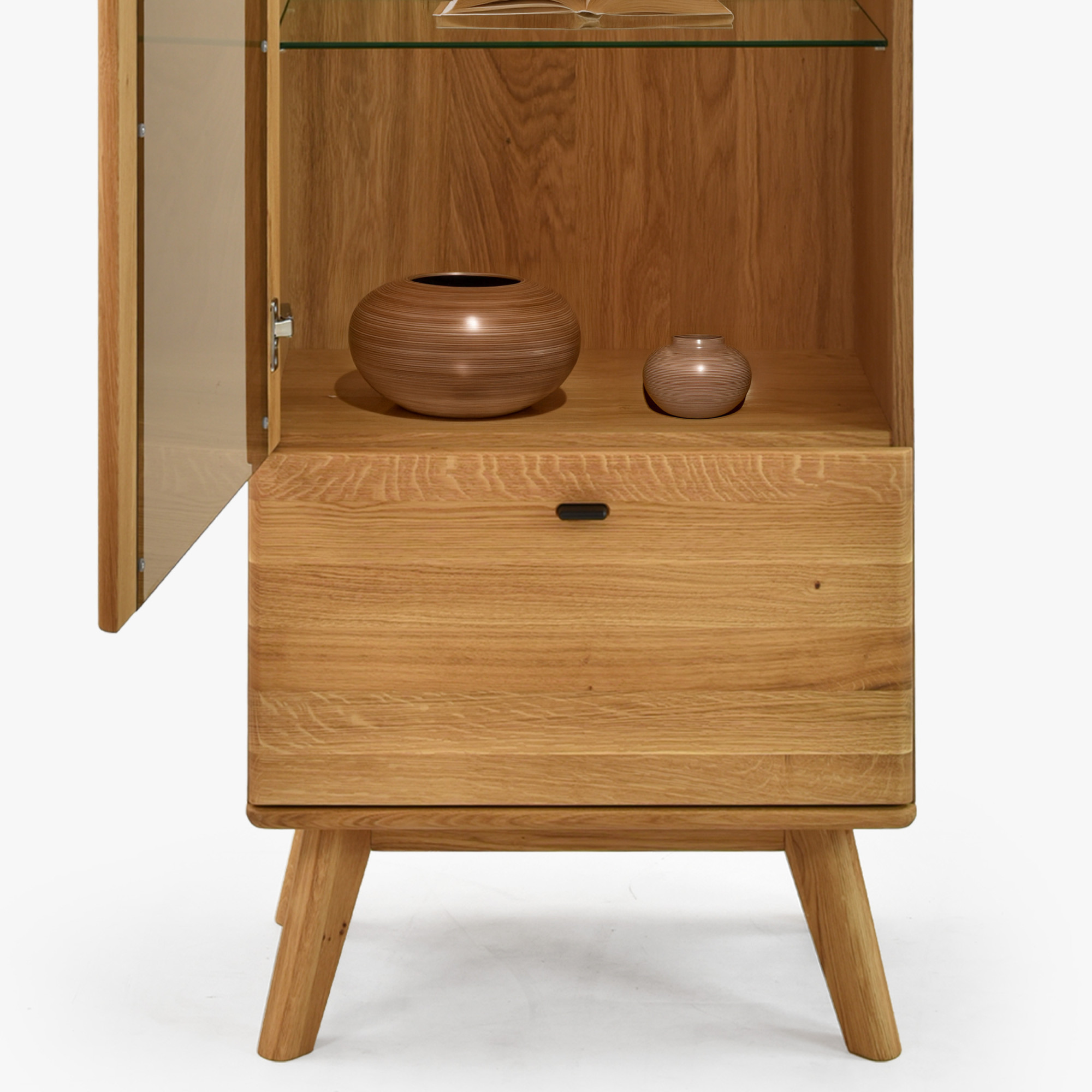 Egyszárnyú tömörfa vitrin lábakon a Jánošík kollekcióból a természetes tölgyfa, a modern dizájn és a precíz kézműves kidolgozás ötvözetét képviseli. Ez a modell ideális választás mindazoknak, akik értékelik a valódi tömörfa minőségét és szeretnének otthonukba egy darabka természetet vinni. A vitrin kombinációban készül tömör tölgyfából (felső lap, frontok, lábak és szerkezeti elemek) és prémium tölgy furnérból (oldalak és váz), ami tökéletes megjelenést és hosszú élettartamot garantál. Alapértelmezés szerint rendelkezik bal oldali pánttal szerelt ajtóval, de az előkészítésnek köszönhetően könnyen át lehet szerelni jobb oldalra. Belsejében található három üvegpolc a díszek, porcelán vagy üveg bemutatására, és az alsó részben egy praktikus fiók az apróságoknak.