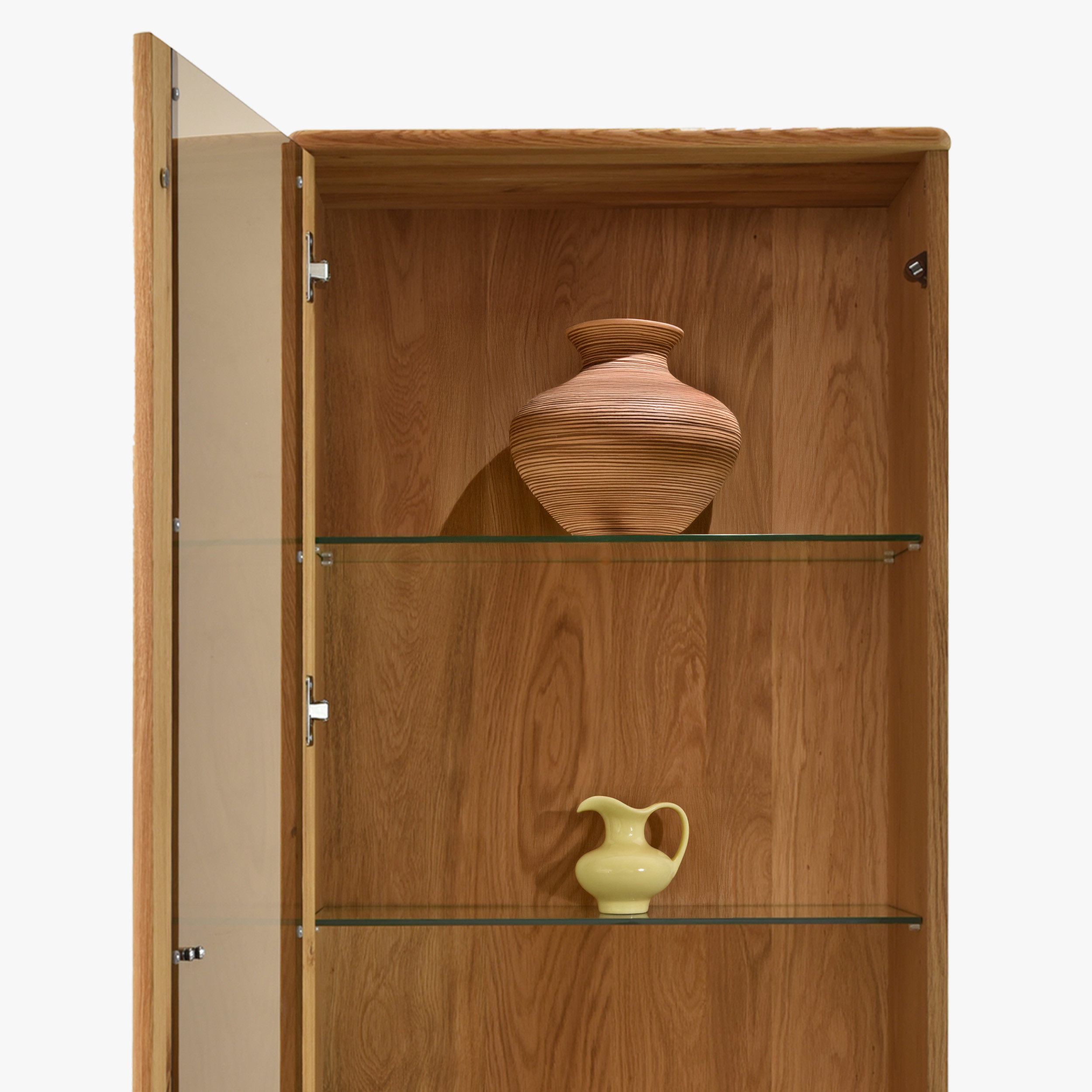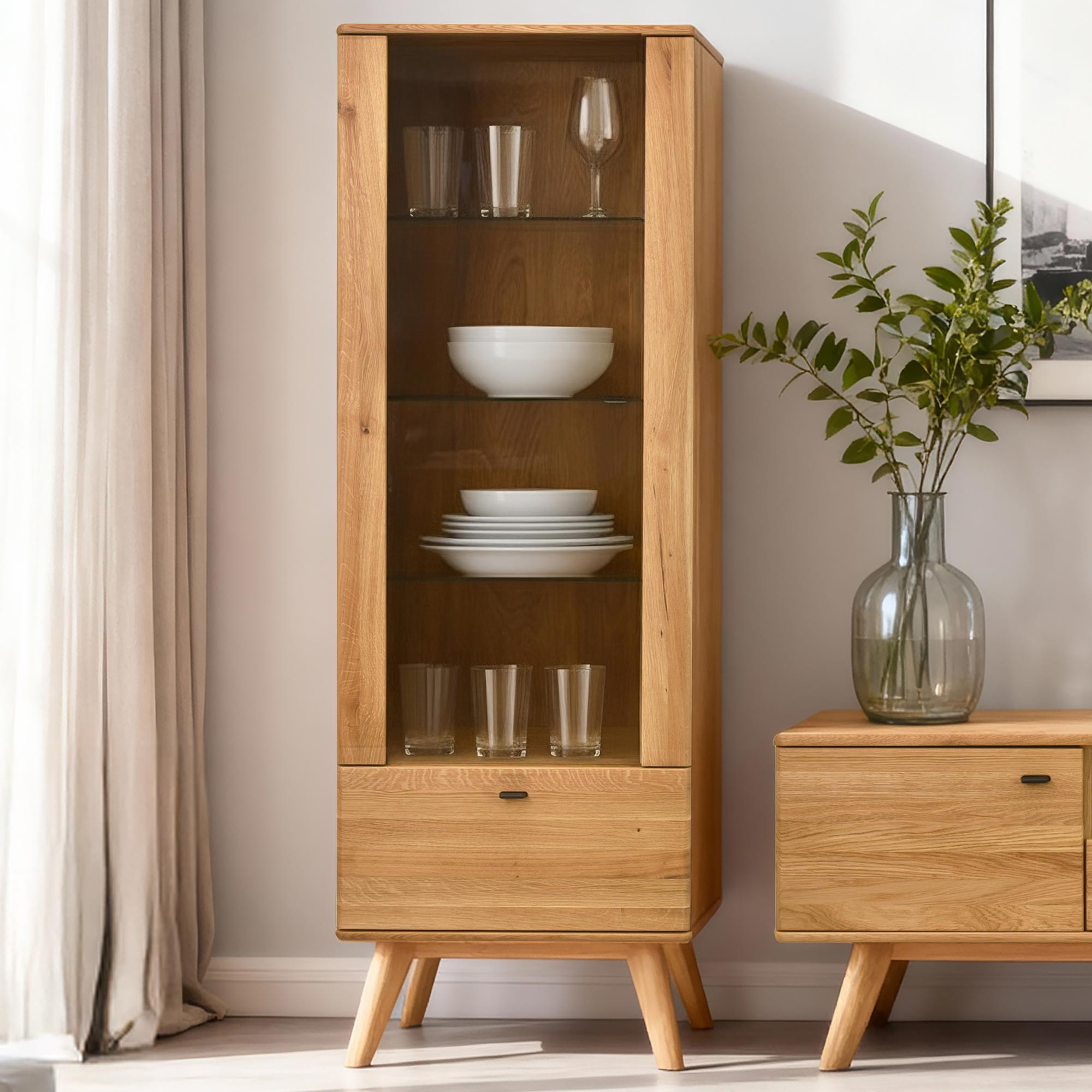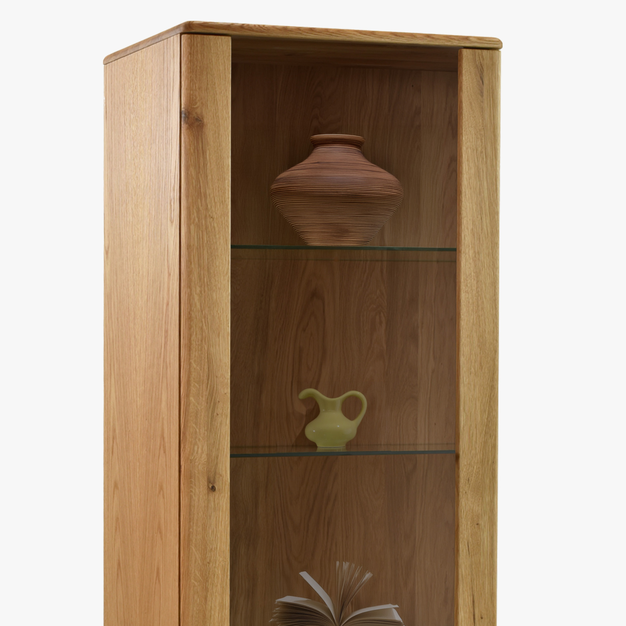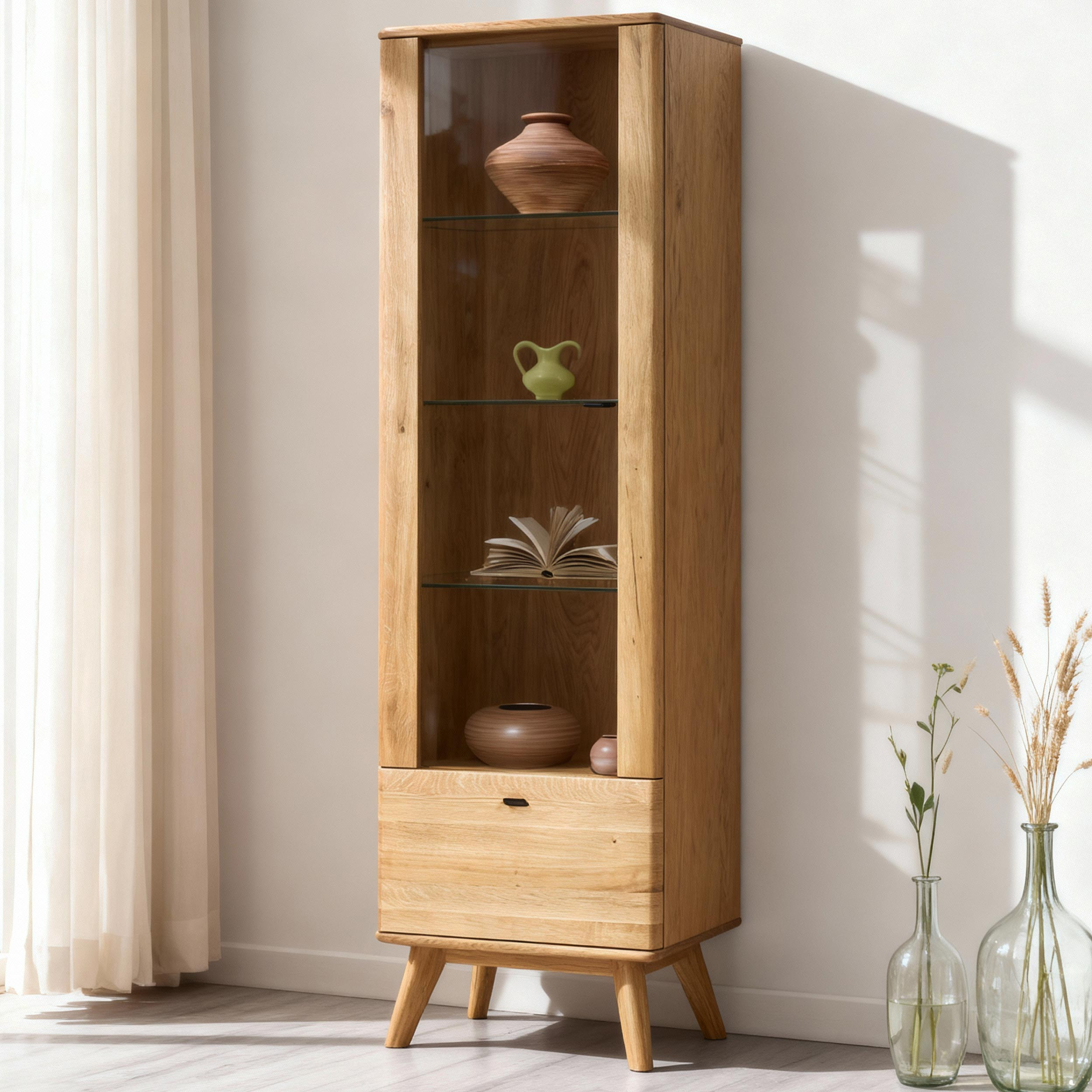Egyszárnyú tömörfa vitrin lábakon a Jánošík kollekcióból a természetes tölgyfa, a modern dizájn és a precíz kézműves kidolgozás ötvözetét képviseli. Ez a modell ideális választás mindazoknak, akik értékelik a valódi tömörfa minőségét és szeretnének otthonukba egy darabka természetet vinni. A vitrin kombinációban készül tömör tölgyfából (felső lap, frontok, lábak és szerkezeti elemek) és prémium tölgy furnérból (oldalak és váz), ami tökéletes megjelenést és hosszú élettartamot garantál. Alapértelmezés szerint rendelkezik bal oldali pánttal szerelt ajtóval, de az előkészítésnek köszönhetően könnyen át lehet szerelni jobb oldalra. Belsejében található három üvegpolc a díszek, porcelán vagy üveg bemutatására, és az alsó részben egy praktikus fiók az apróságoknak.