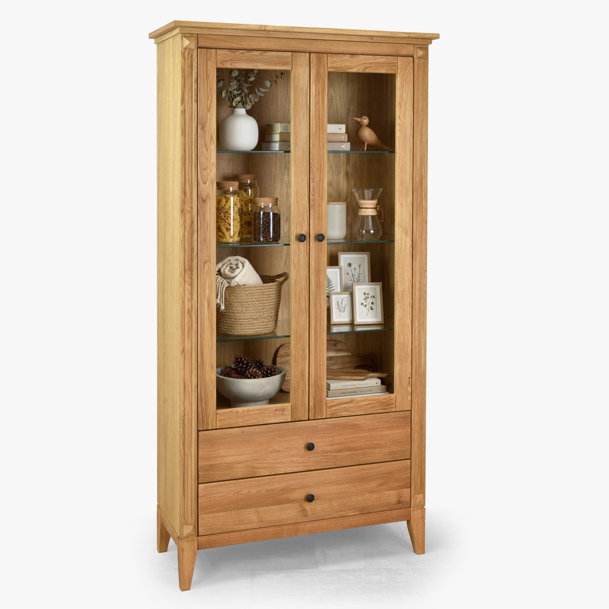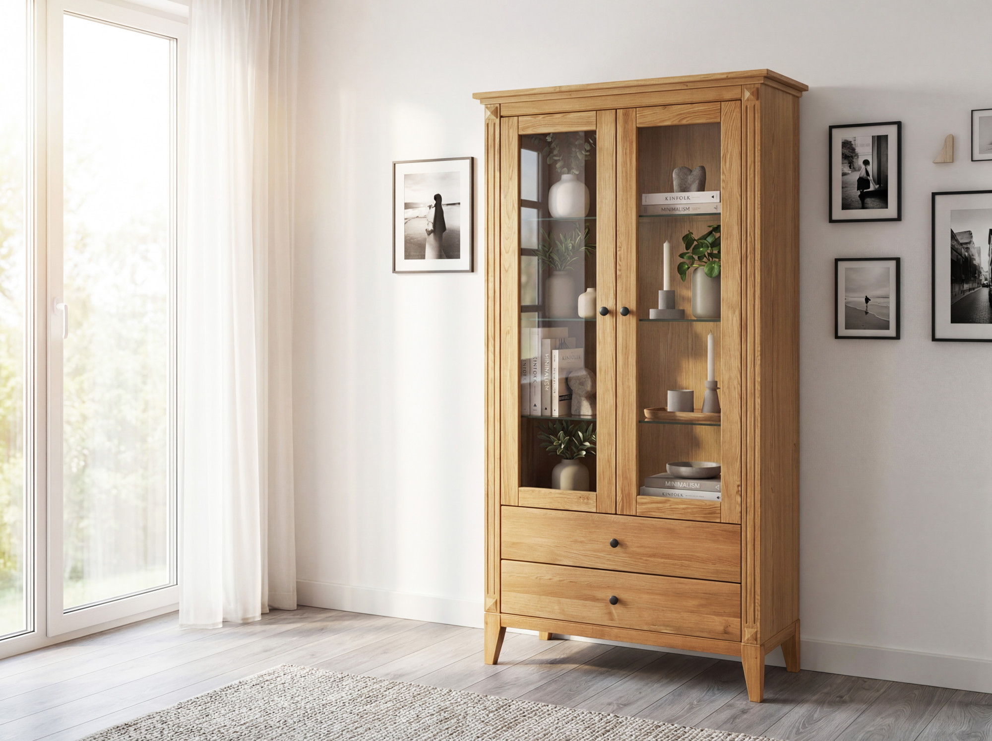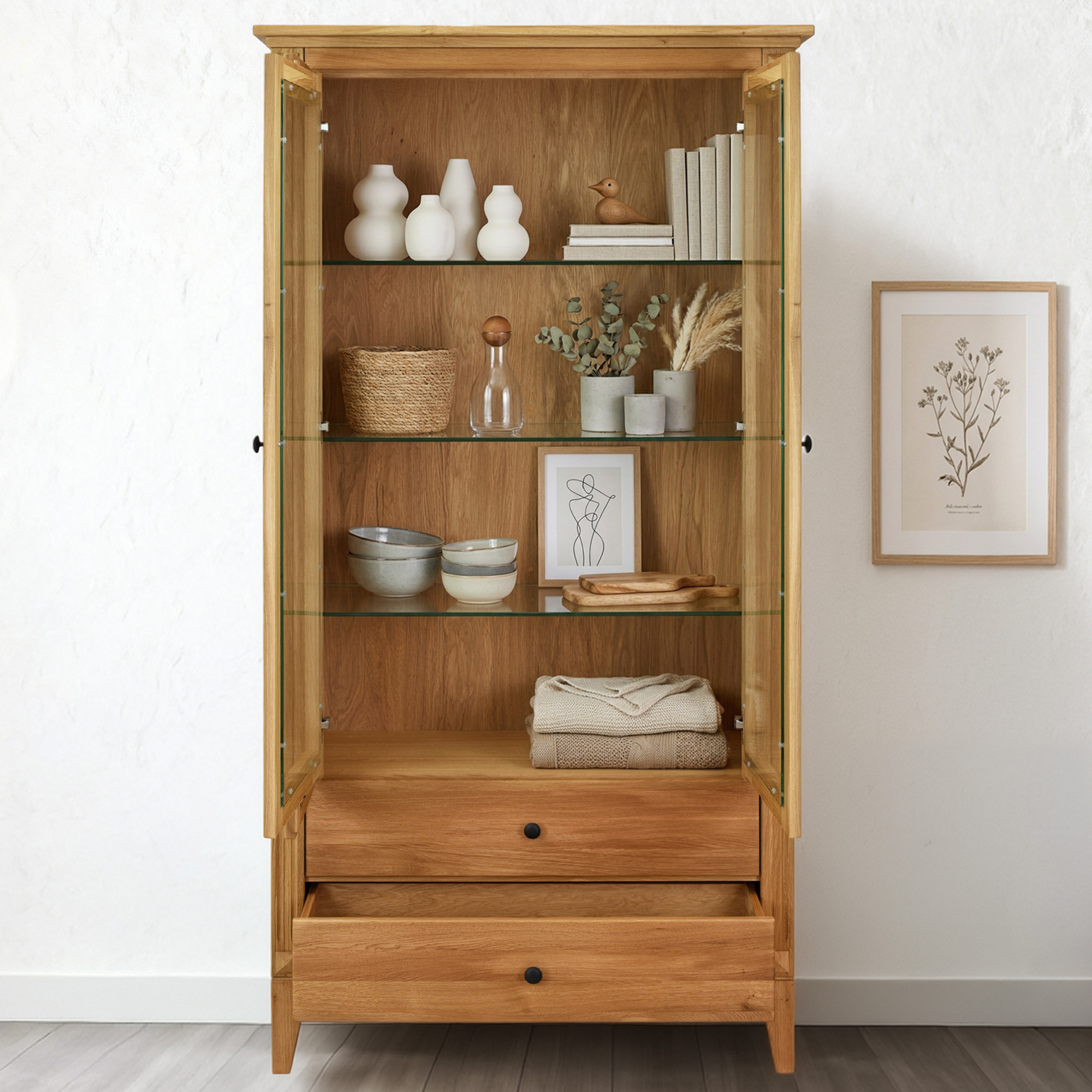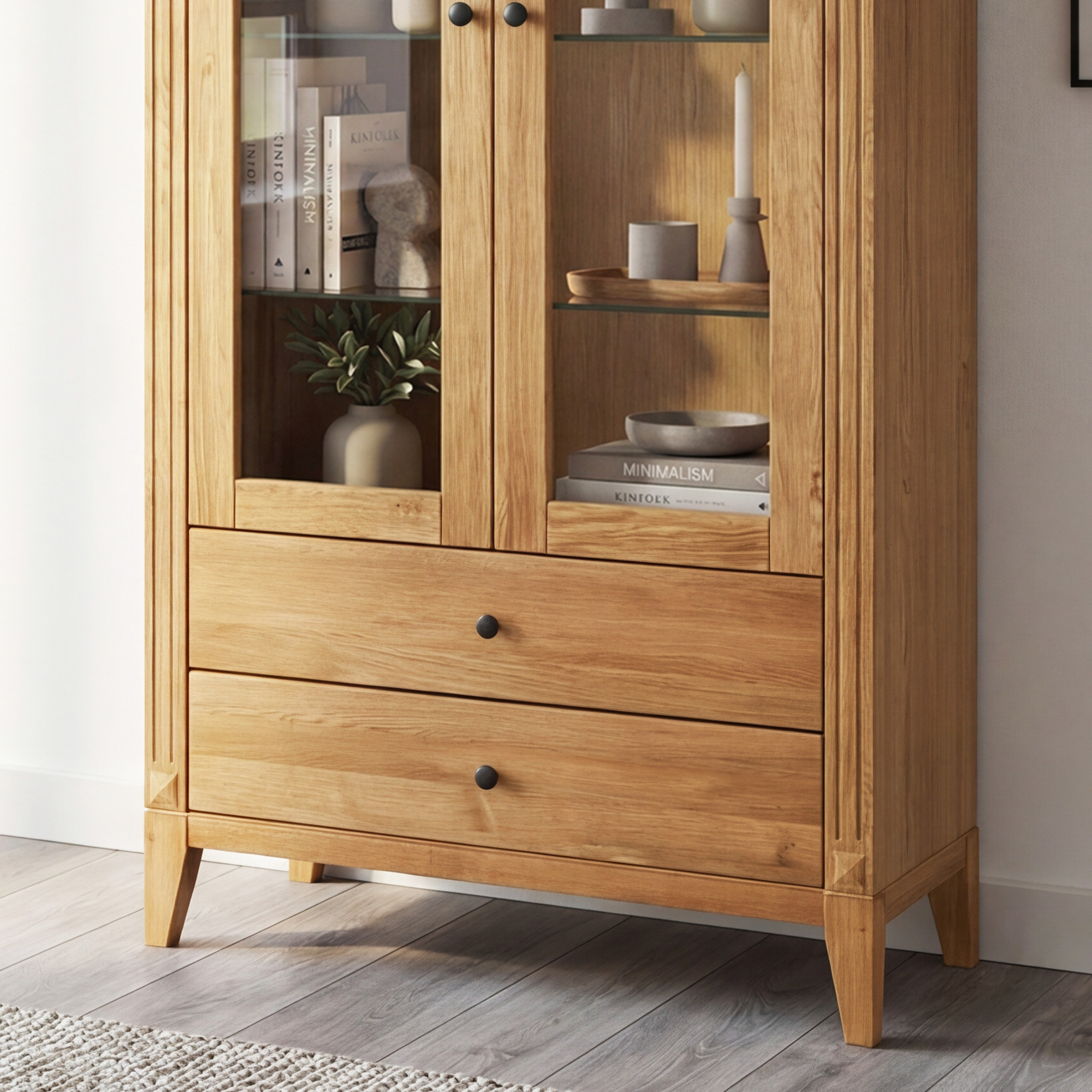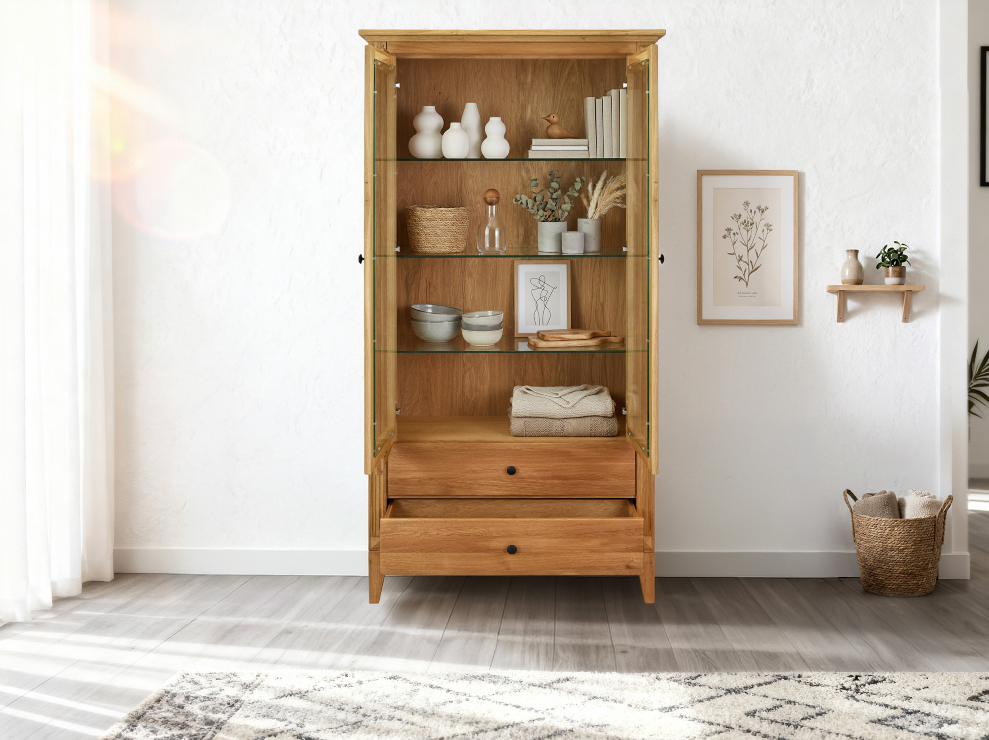 Rusztikus kőrisfa üvegajtós vitrin fiókokkal, skandináv stílusban