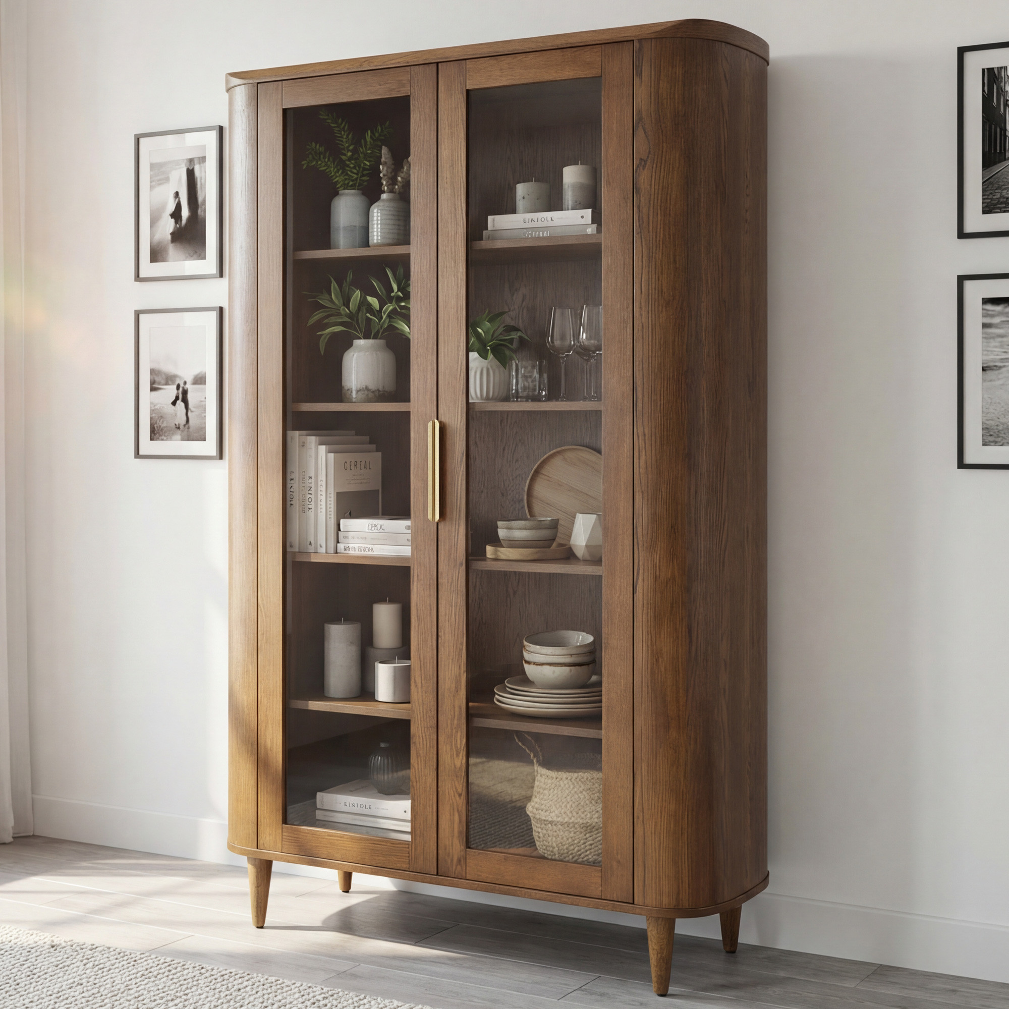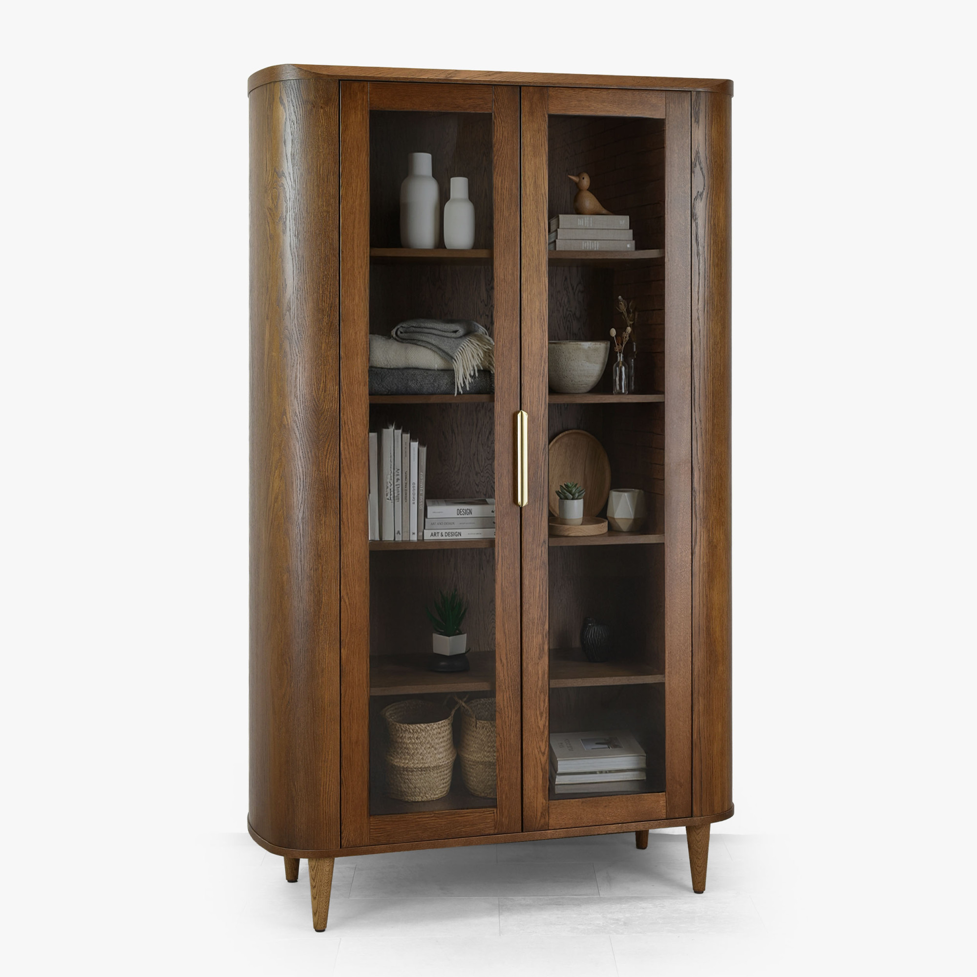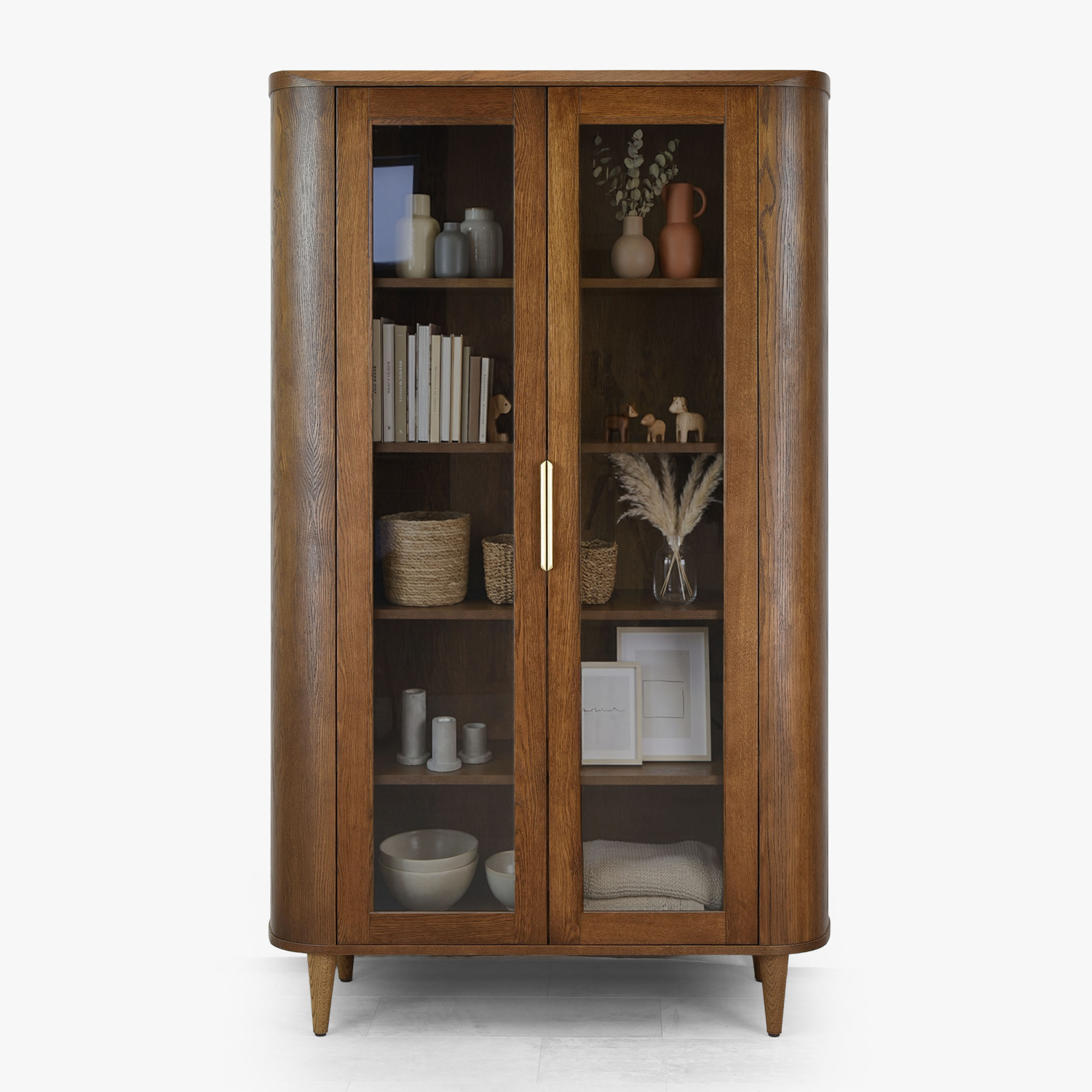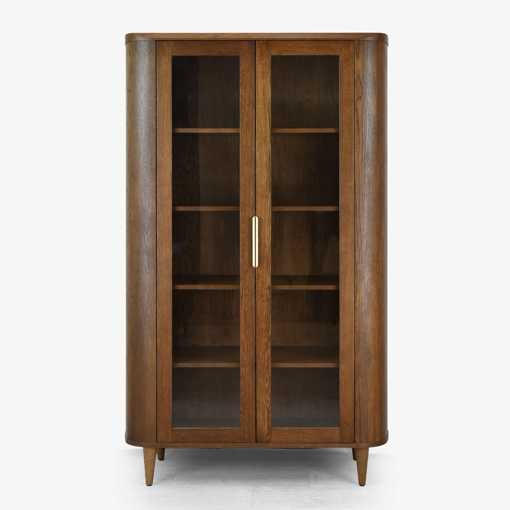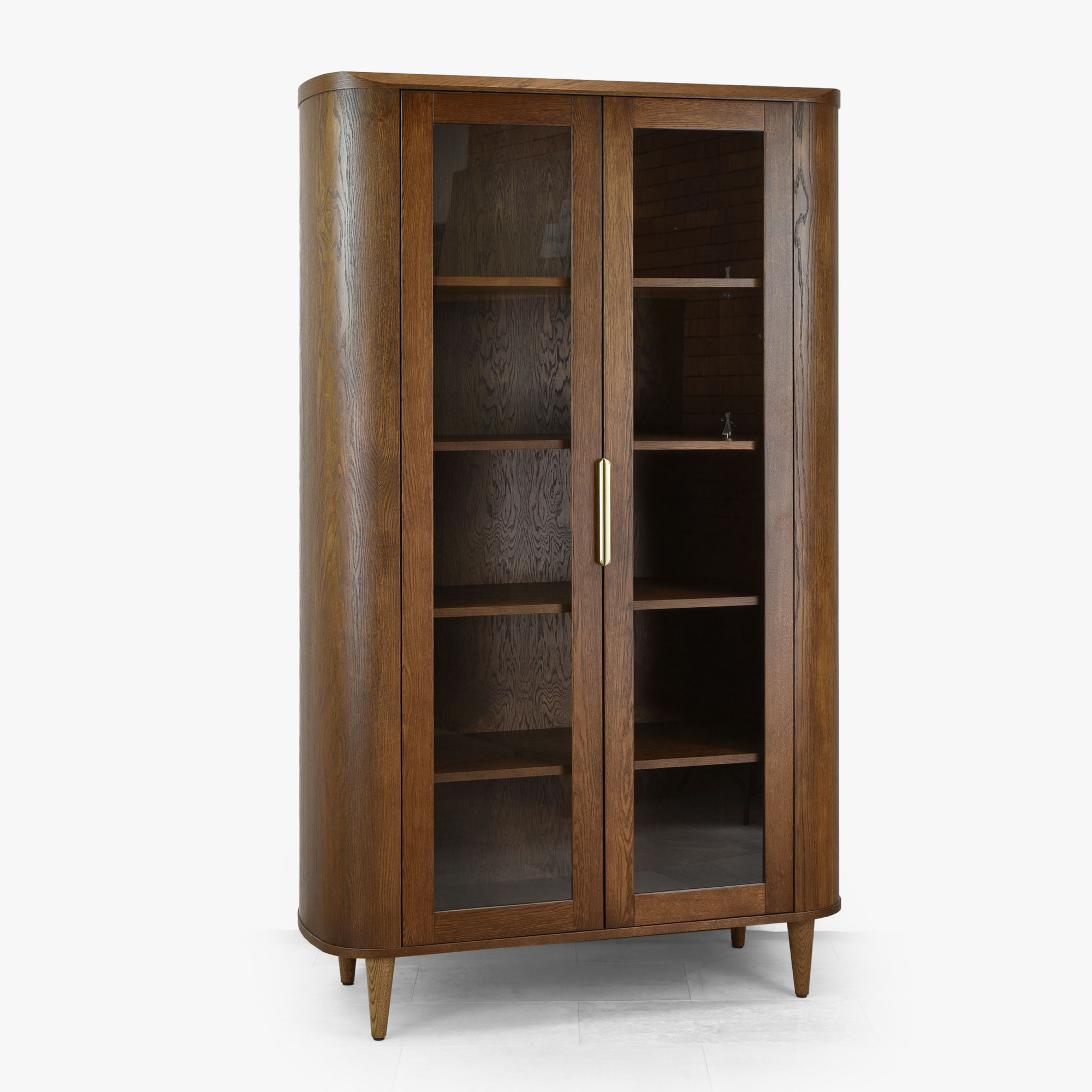 Kétajtós üveges dió színű vitrin prémium tölgyfa és MDF anyagból