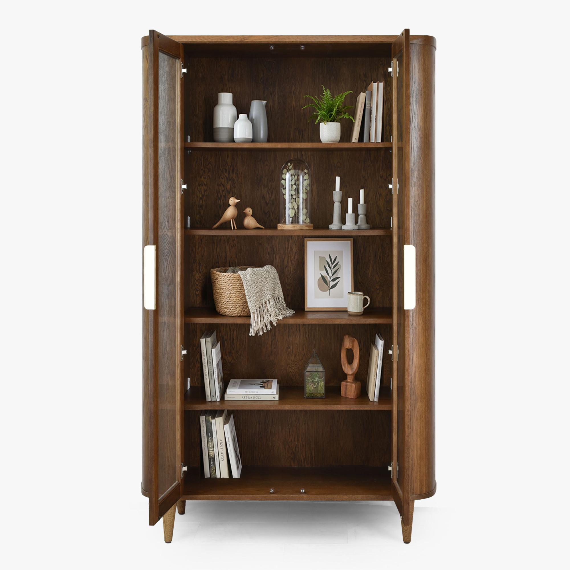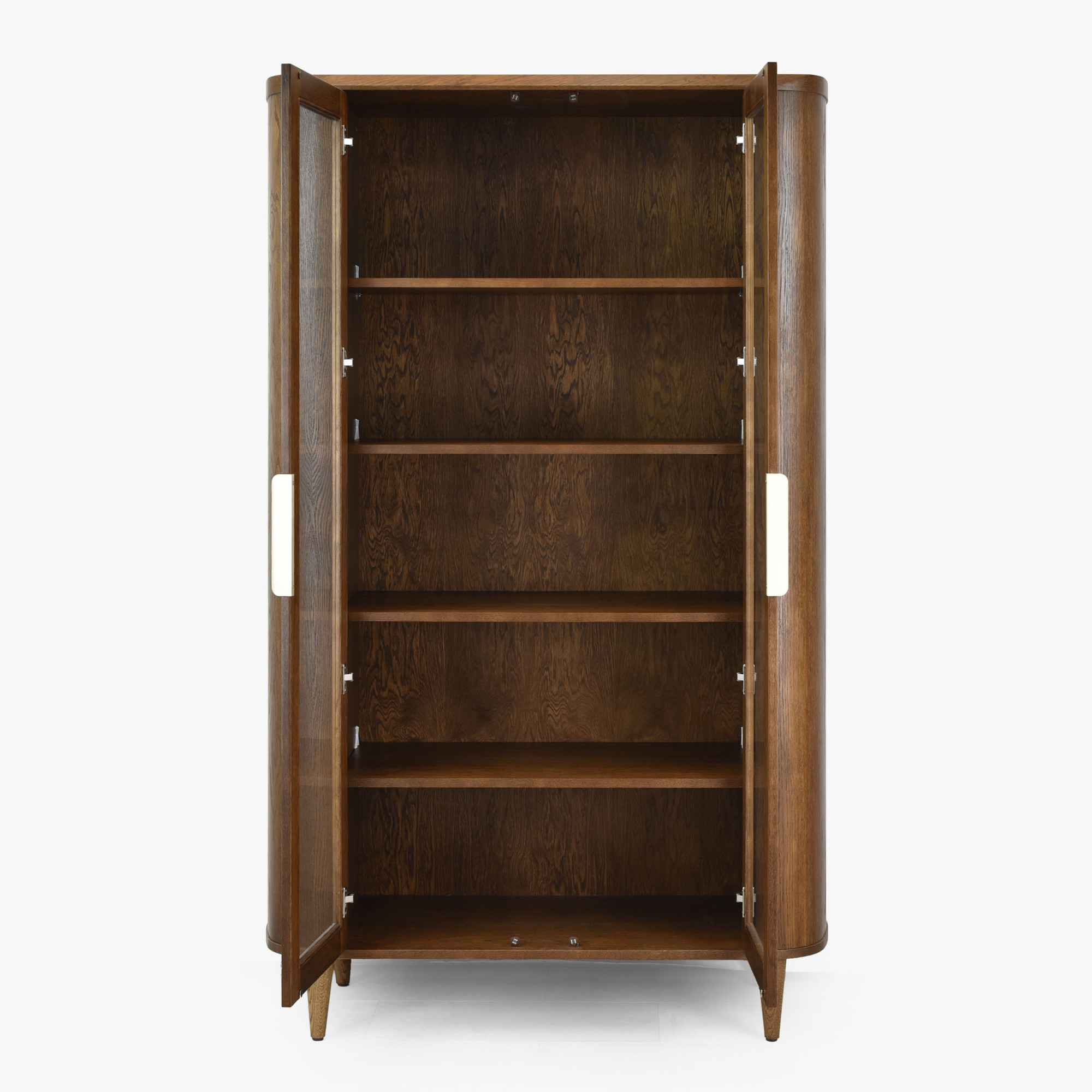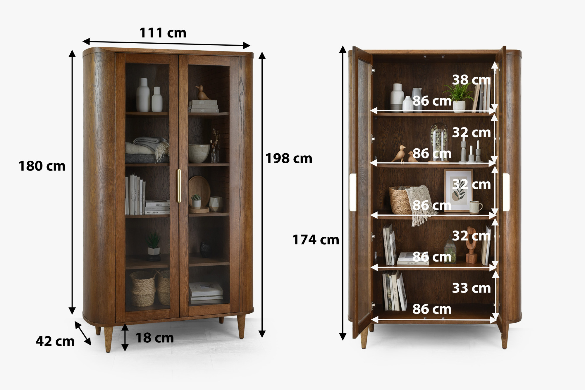 A vitrin prémium furnérból készül, tartós szerkezetét tölgyfa és MDF adja, ami kivételes szilárdságot és hosszú élettartamot garantál. A felületet matt lakkal kezeltük, amely nemcsak védi a bútort a sérülésektől, hanem szépen kiemeli a fa természetes mintázatát is. Az aranyszínű fogantyúk egy csipetnyi luxust adnak az egész darabnak. A vitrin méretei – magasság 198 cm, szélesség 111 cm és mélység 42 cm – markáns, mégis visszafogott elemévé teszik bármely helyiségnek. A bútor már teljesen összeszerelve kerül kiszállításra, a vásárlónak csupán a lábakat kell rögzítenie.