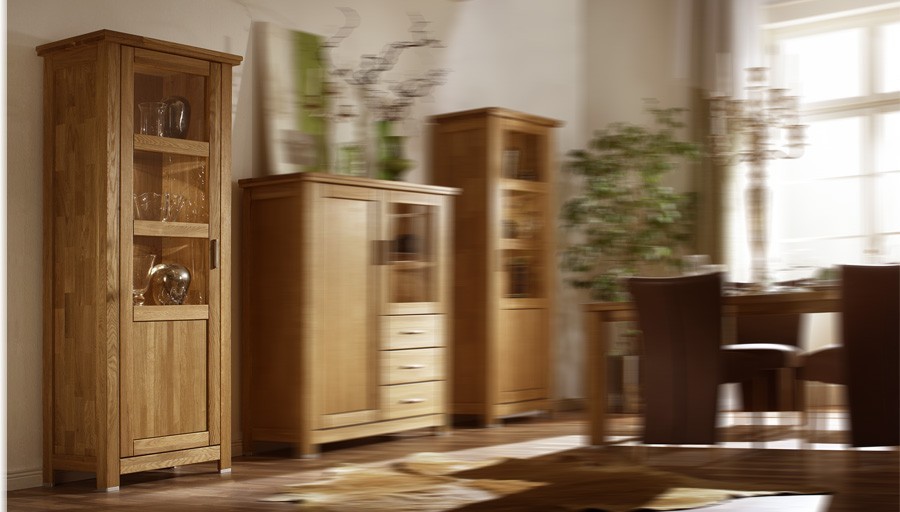 A vitrin 100% tömör tölgyfából készült, melyet egy német márkájú speciális olajjal kezeltek. Az olaj feladata, hogy nagyobb ellenállást biztosítson a fa számára a mechanikai sérülésekkel szemben és kiemelje a tömörfa természetes erezetének szépségét. A bútort ezután nem kezeljük pácolással vagy fehérítéssel. A tölgy olaj változatban a vitrin teljesen természetes hatást kelt.