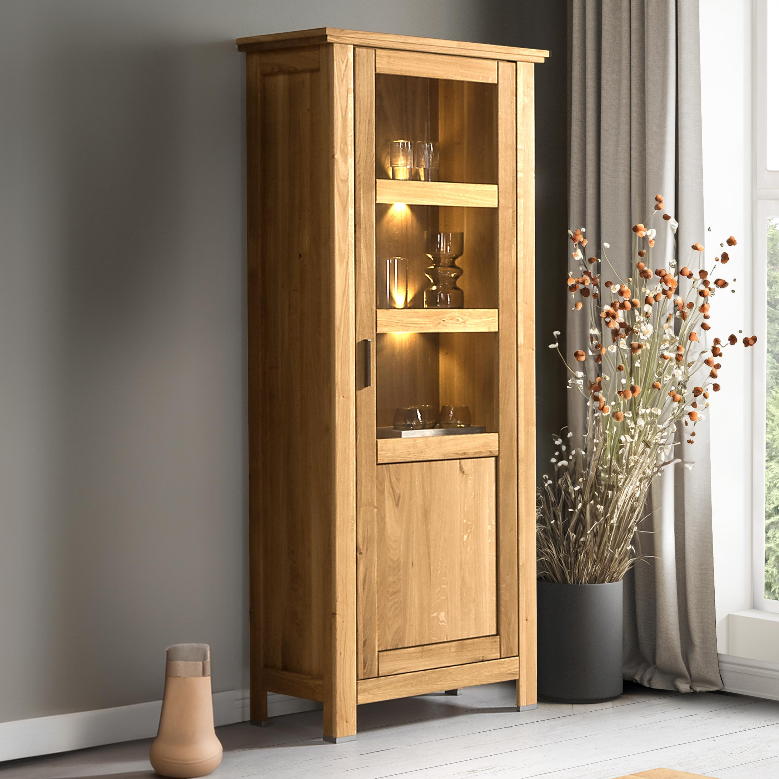 A tömör tölgy vitrin bútordarabként emeli otthonát, akár önállóan helyezi el, akár kínálatunk más tölgybútorai közé kombinálja. Különösen jól illik például a tölgy komódhoz vagy a sekretárhoz.